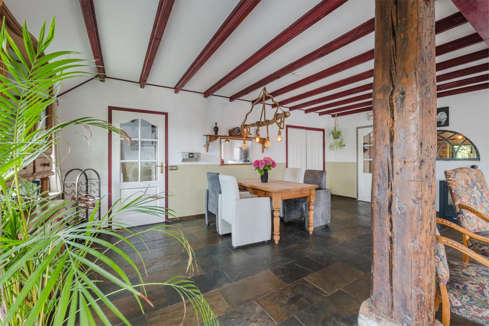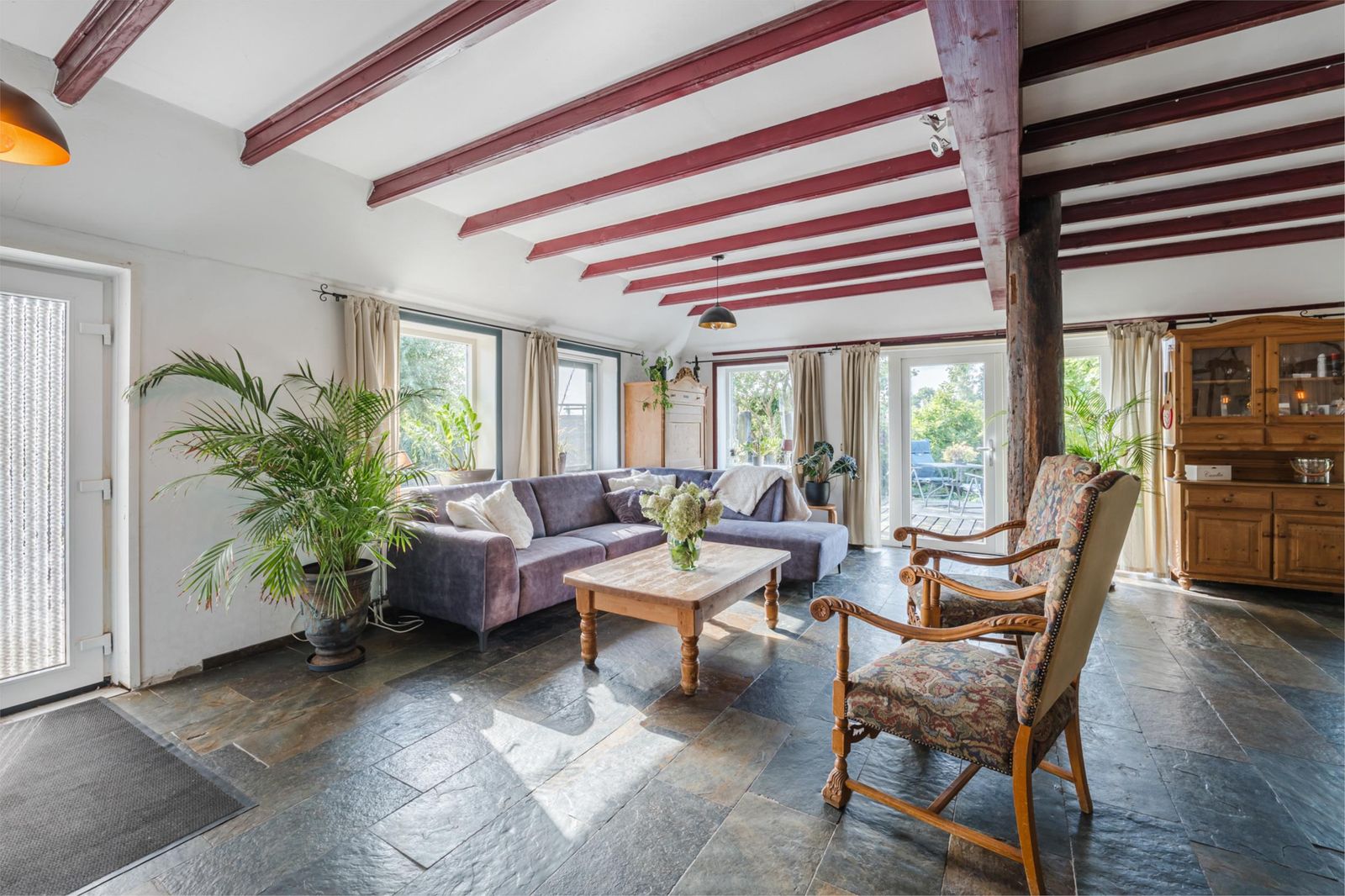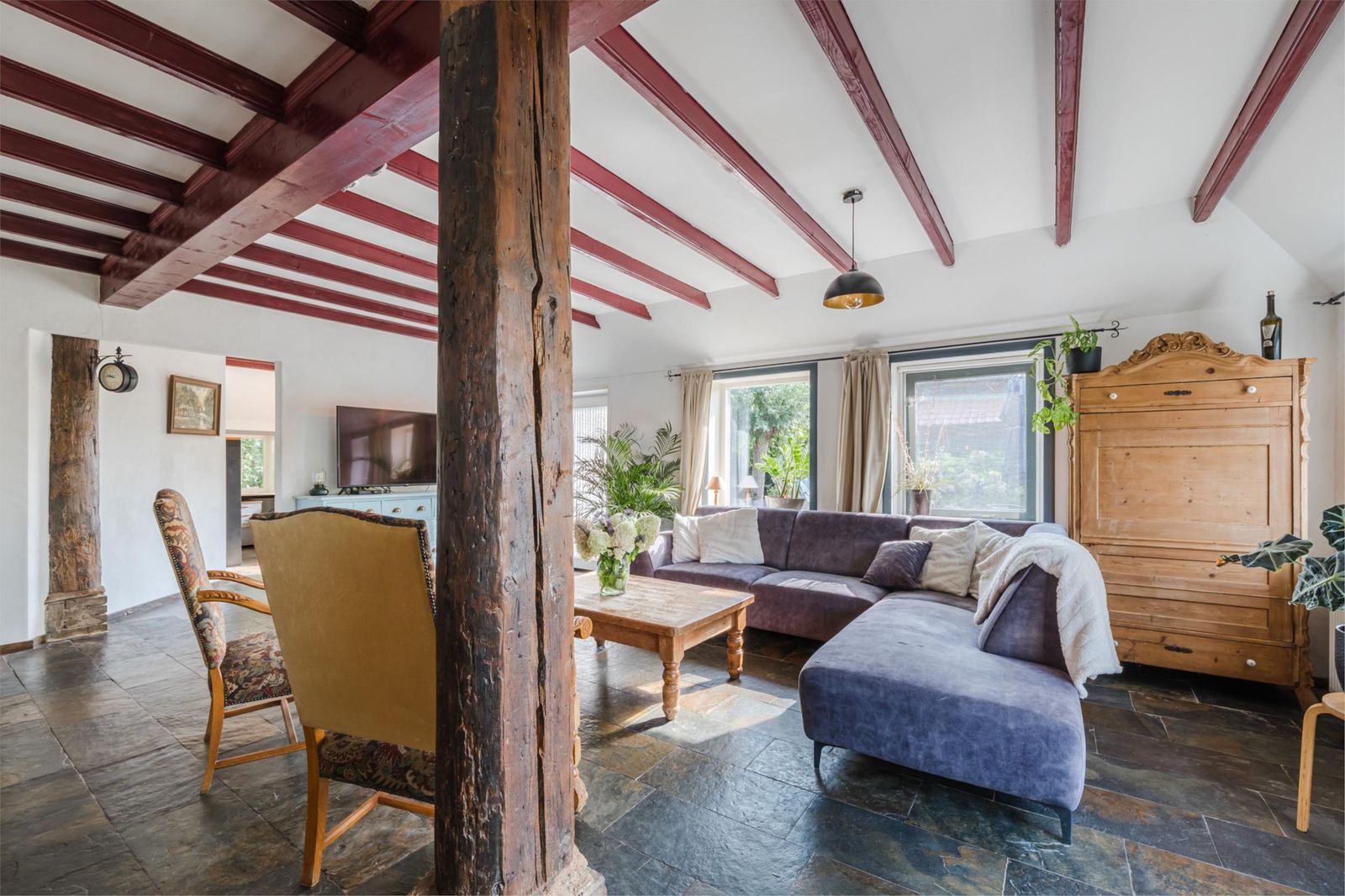 Een royale, verbouwde woning met authentieke details zoals plafondbalken, zichtbare houten gebinten en een vernieuwd rieten dak.