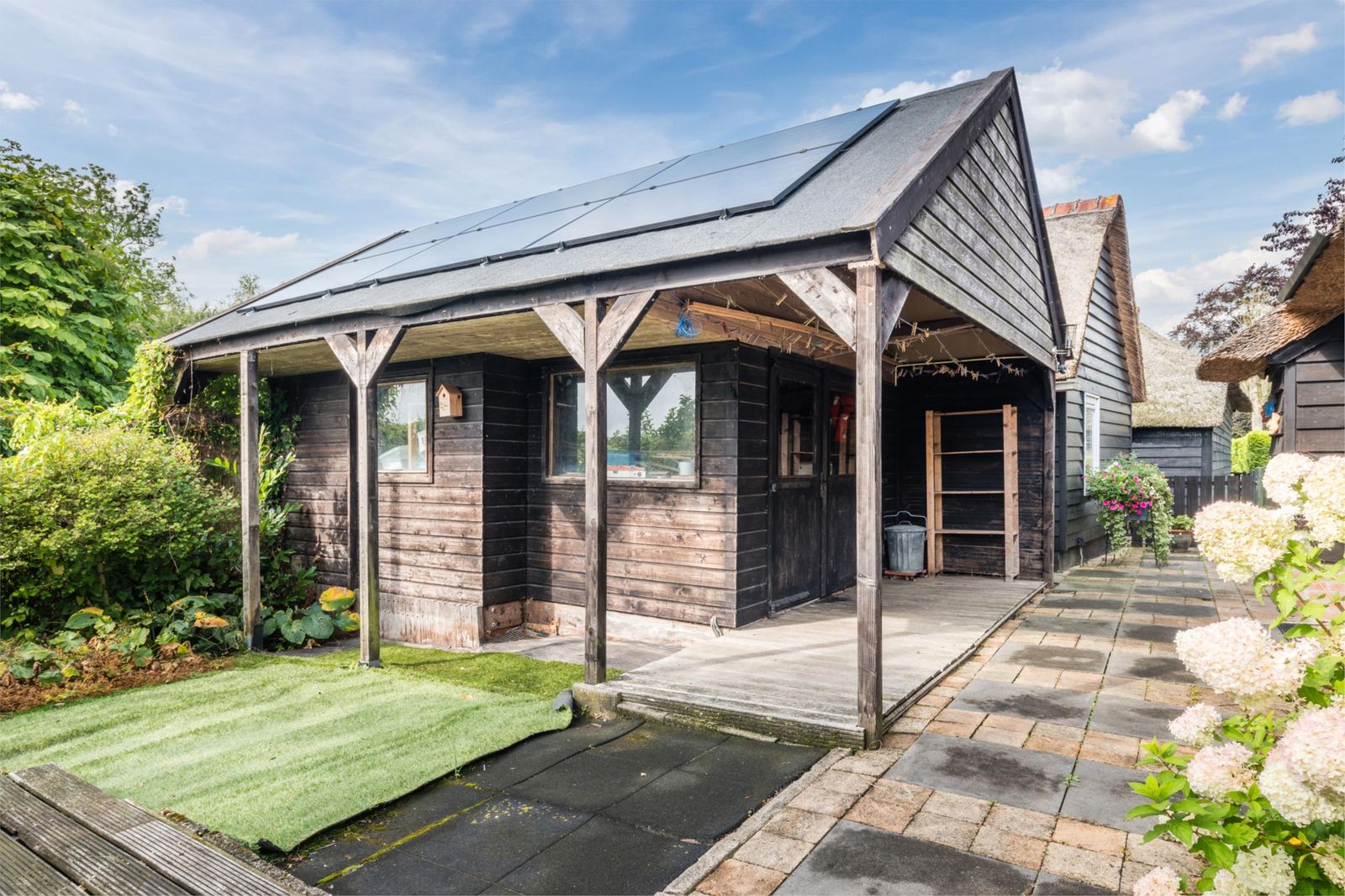 Vrijstaande schuur met overkapping (ca 30 m2), nieuwe kap (2024) met 6 zonnepanelen