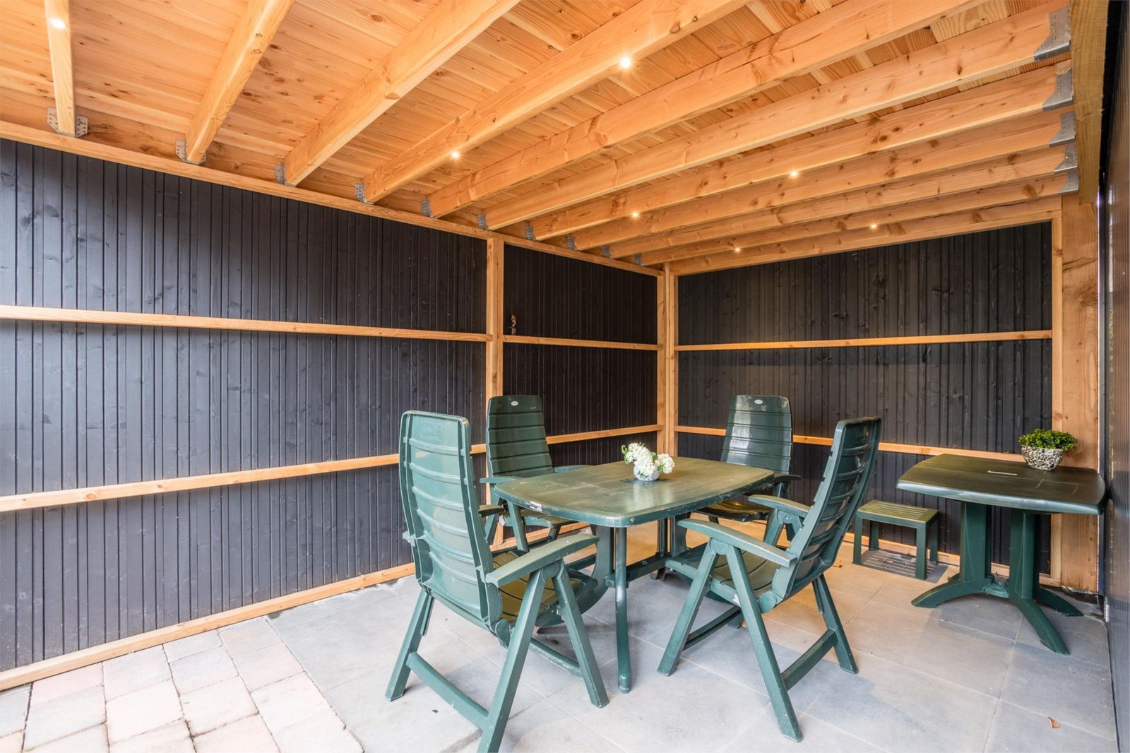 Goed geïsoleerd Jaxx Tuinhuis (metalen sandwichpanelen en aluminium deur met HR++ glas) van 345x240cm en een ruime overkapping met dimbare spotverlichting en aansluiting voor regenton.