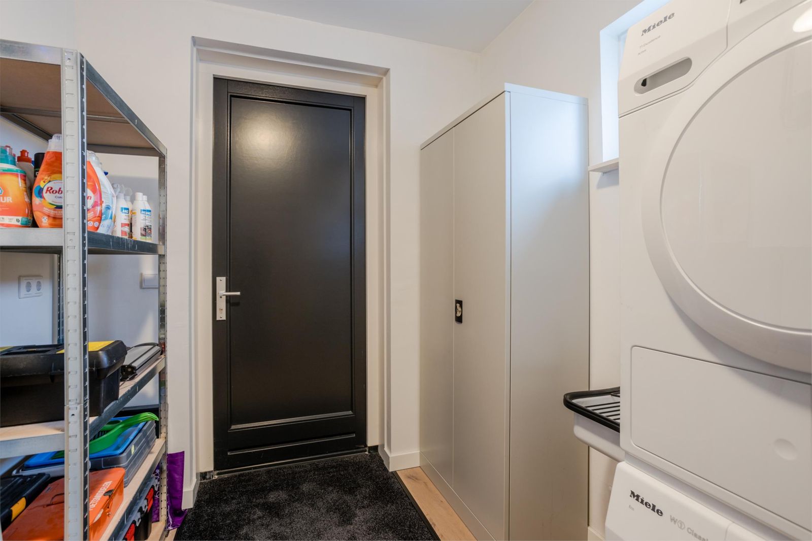 Op de begane grond vindt u de woonkamer voorzien van een schuifpui met hordeur en de keuken voorzien van hoogwaardige keukenapparatuur, en wel koel-vriescombinatie, XXL vaatwasser, combimagnetron oven, 90 cm inductie kookplaat, afzuigkap en Quooker kraan. Natuurlijk ook de gang, vanaf de voordeur met een ruime toilet, de garderobe en meterkast. Tevens zijn er ook een zeer ruime slaapkamer en badkamer op de begane grond. De badkamer heeft een ruime douche en moderne inrichting. Voor de wasmachine en droger is ruimte gemaakt in de inpandige berging, waar ook de warmtepomp staat.