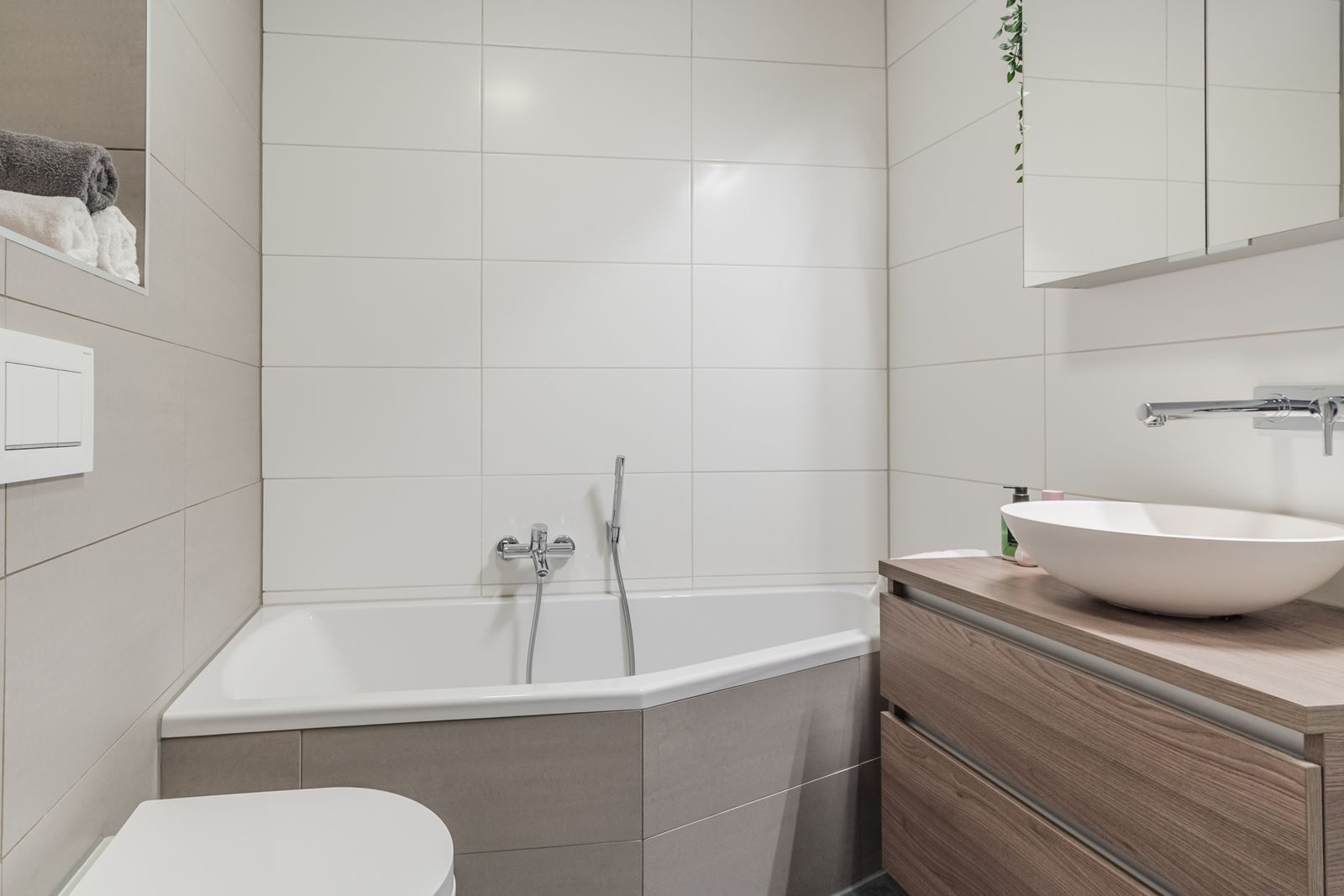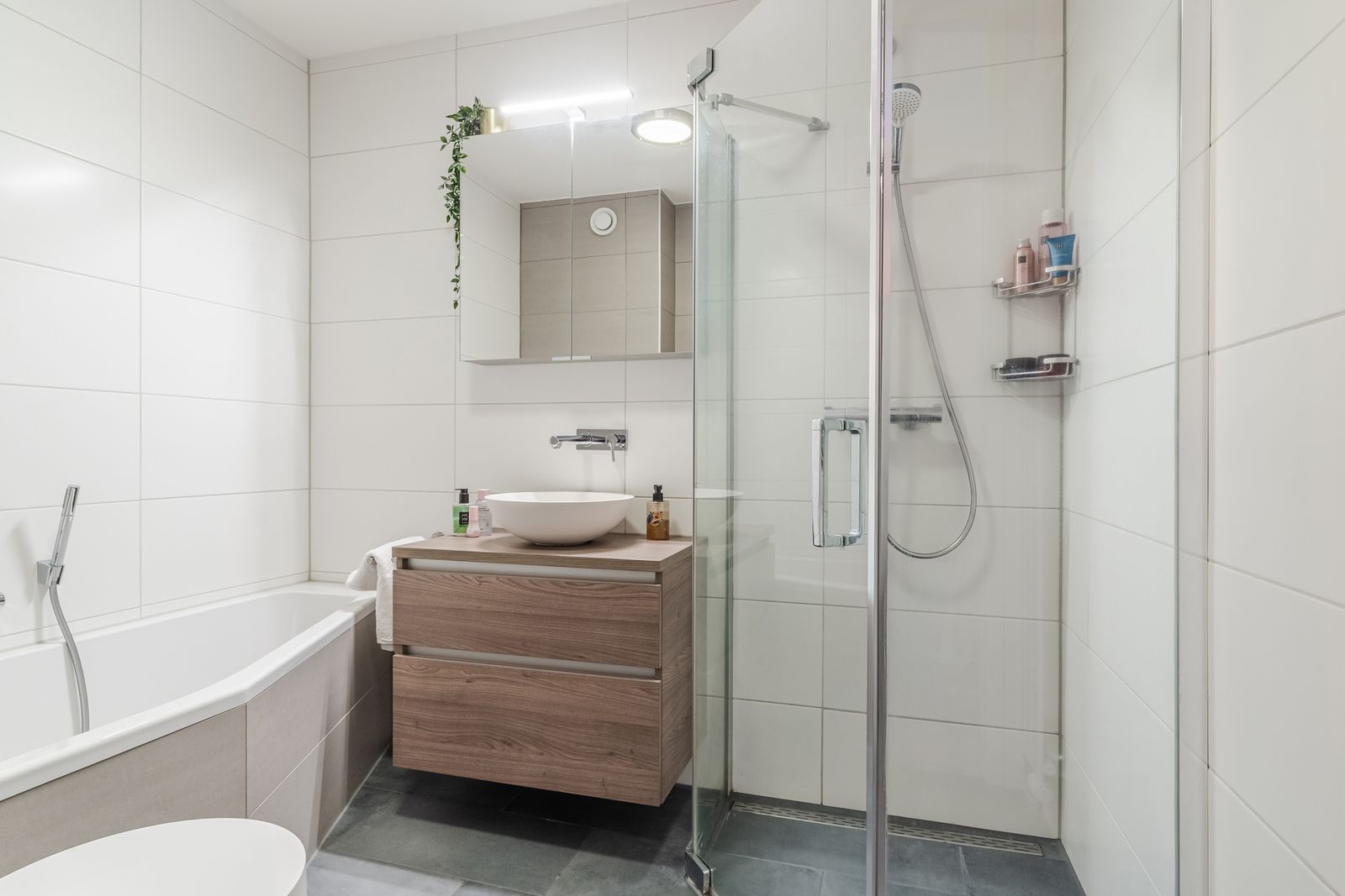 Op de bovenste verdieping bevinden zich twee slaapkamers en de badkamer. Beide slaapkamers zijn licht en ruim van opzet. De slaapkamer aan de voorzijde heeft een hoge brede vensterbank, wat ontstaat door de hoge ramen in de woonkamer eronder, iets wat de kamer een speels en uniek karakter geeft. In deze kamer bevindt zich tevens een inbouwkast met schuifdeuren. De badkamer is slim en multifunctioneel ingericht en beschikt over een douche, een ligbad en een toilet. In de hal op deze verdieping is een vaste kast met de cv installatie.