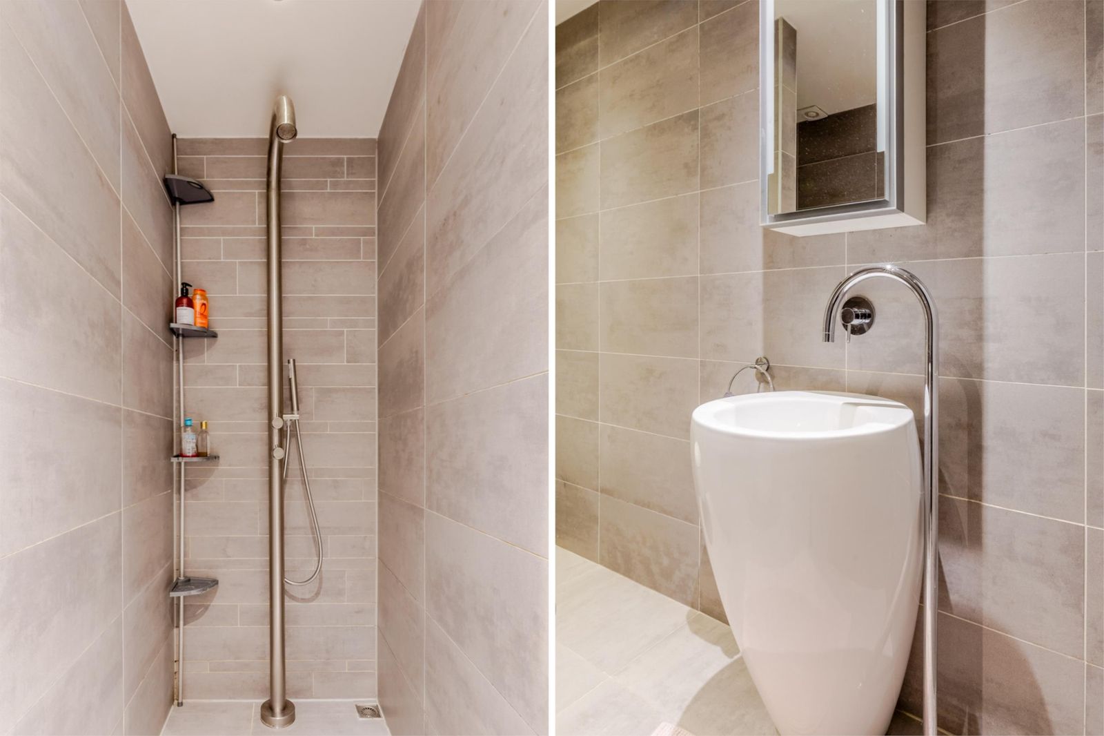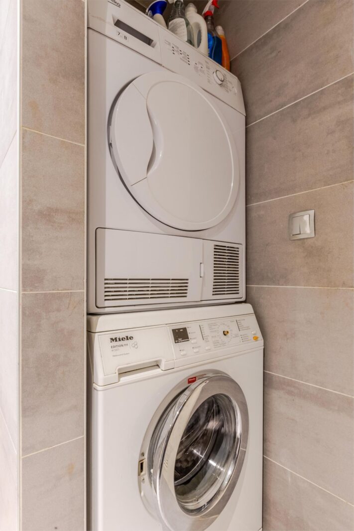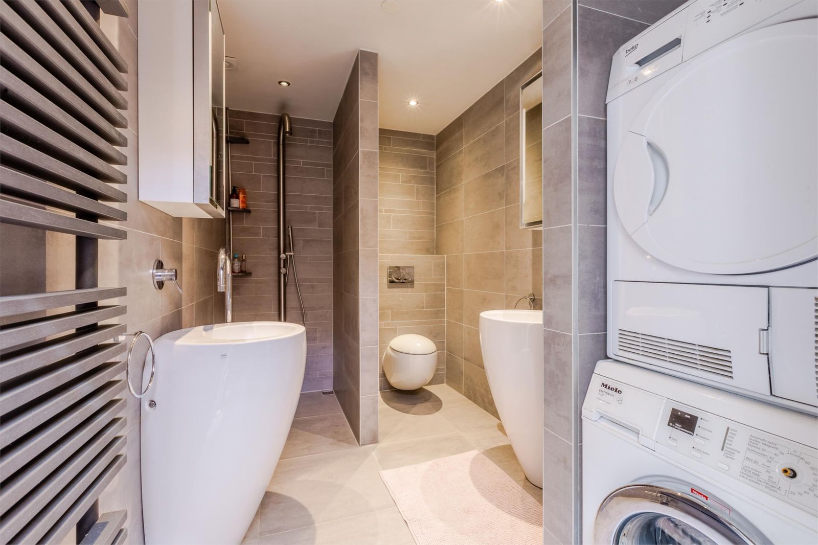 Tussen de slaapkamers bevindt zich de moderne badkamer met 2 separate wastafels en aparte kastjes. Verder is hier ruimte voor de wasmachine en droger.