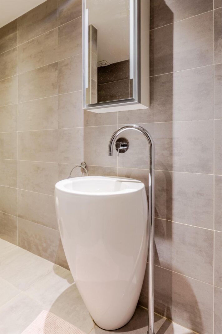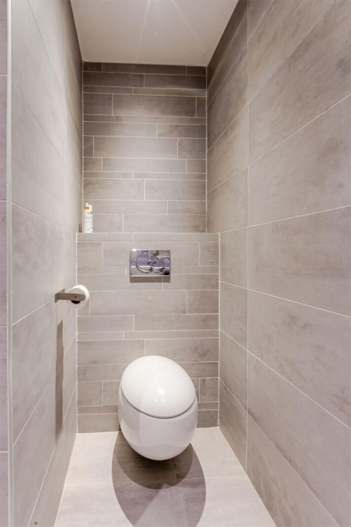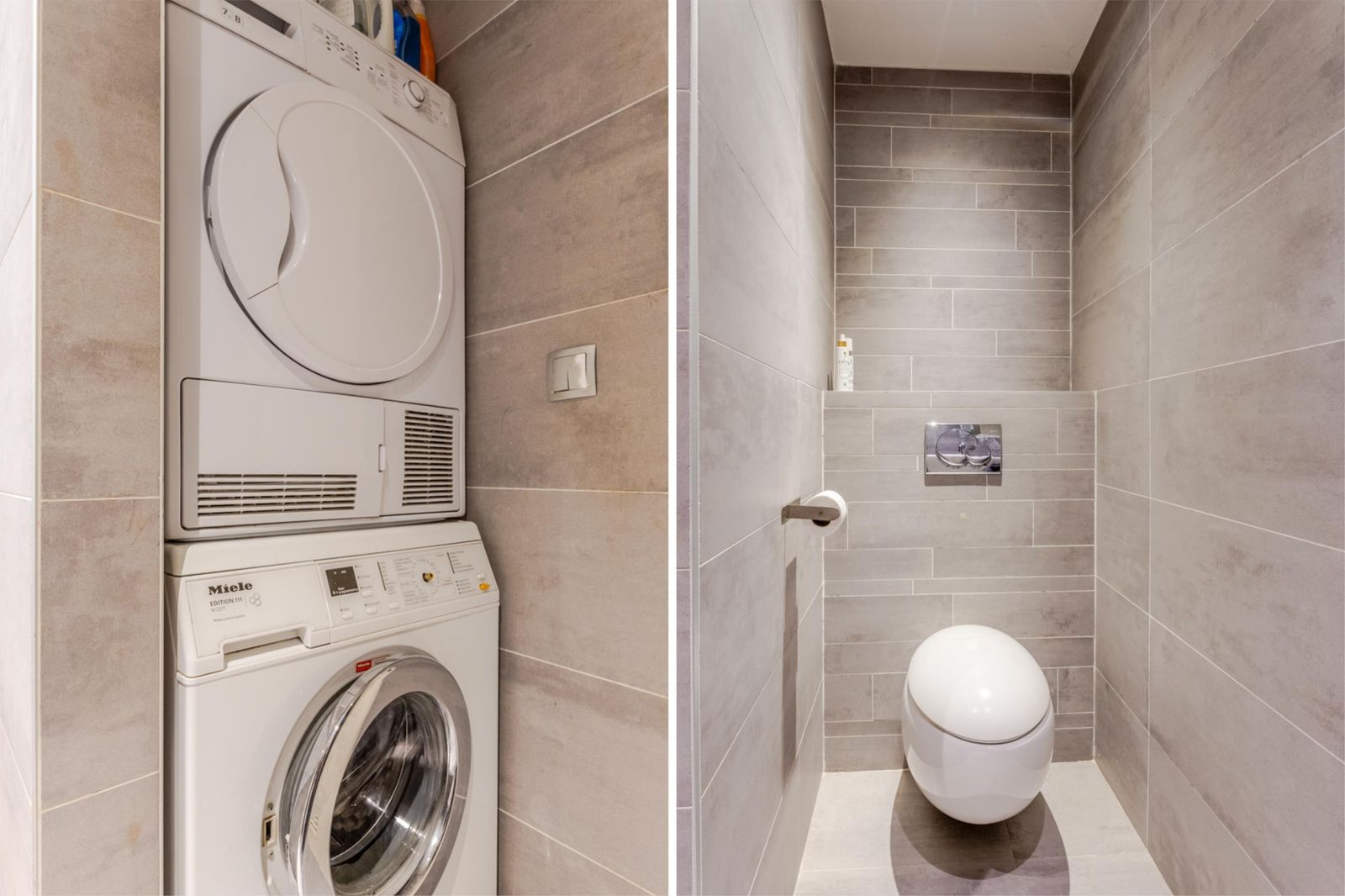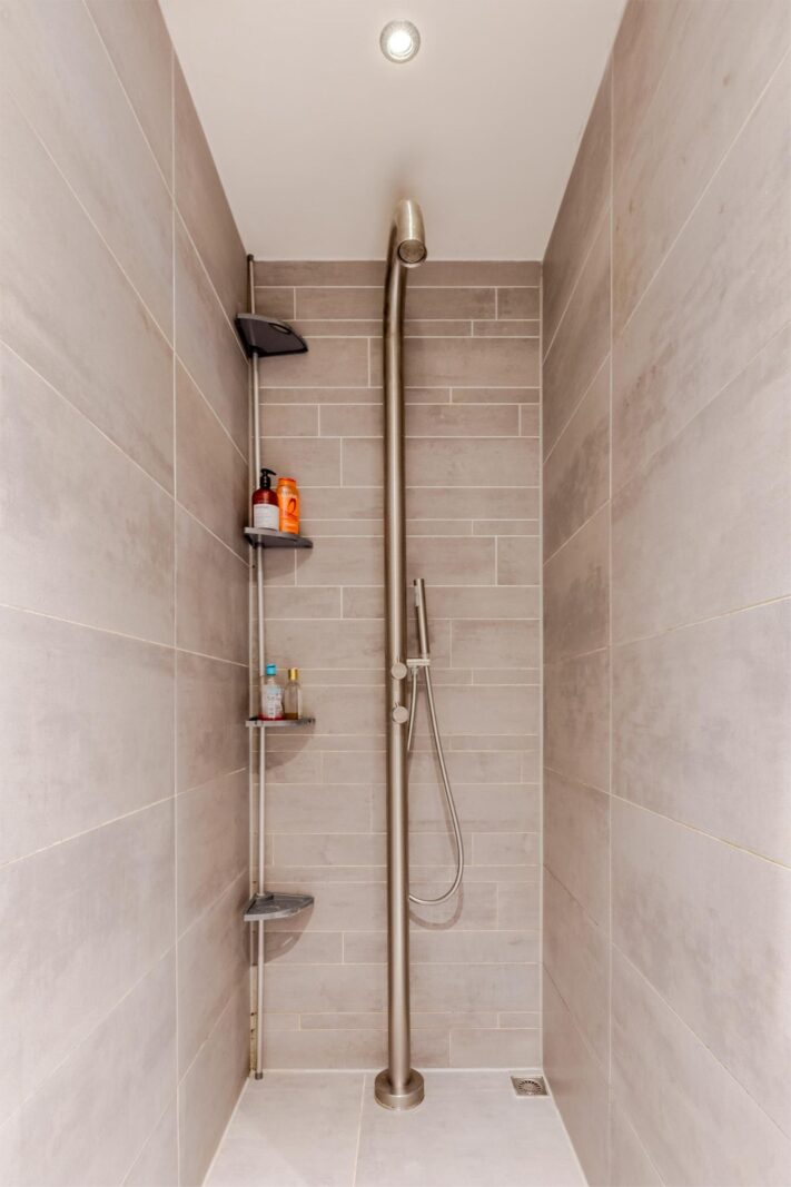 Tussen de slaapkamers bevindt zich de moderne badkamer met 2 separate wastafels en aparte kastjes. Verder is hier ruimte voor de wasmachine en droger.