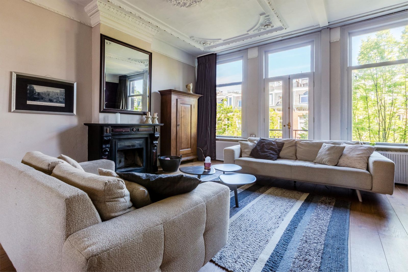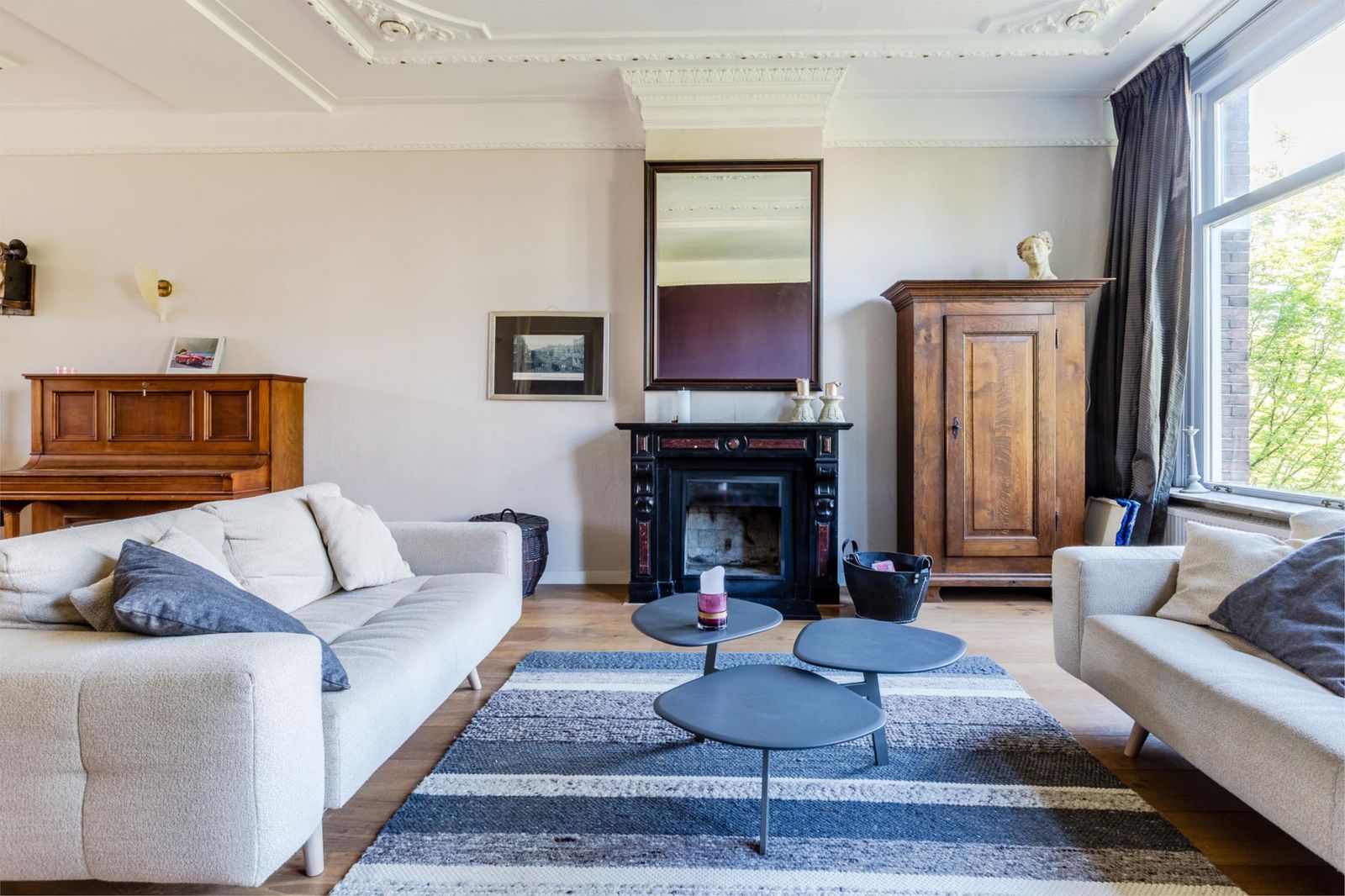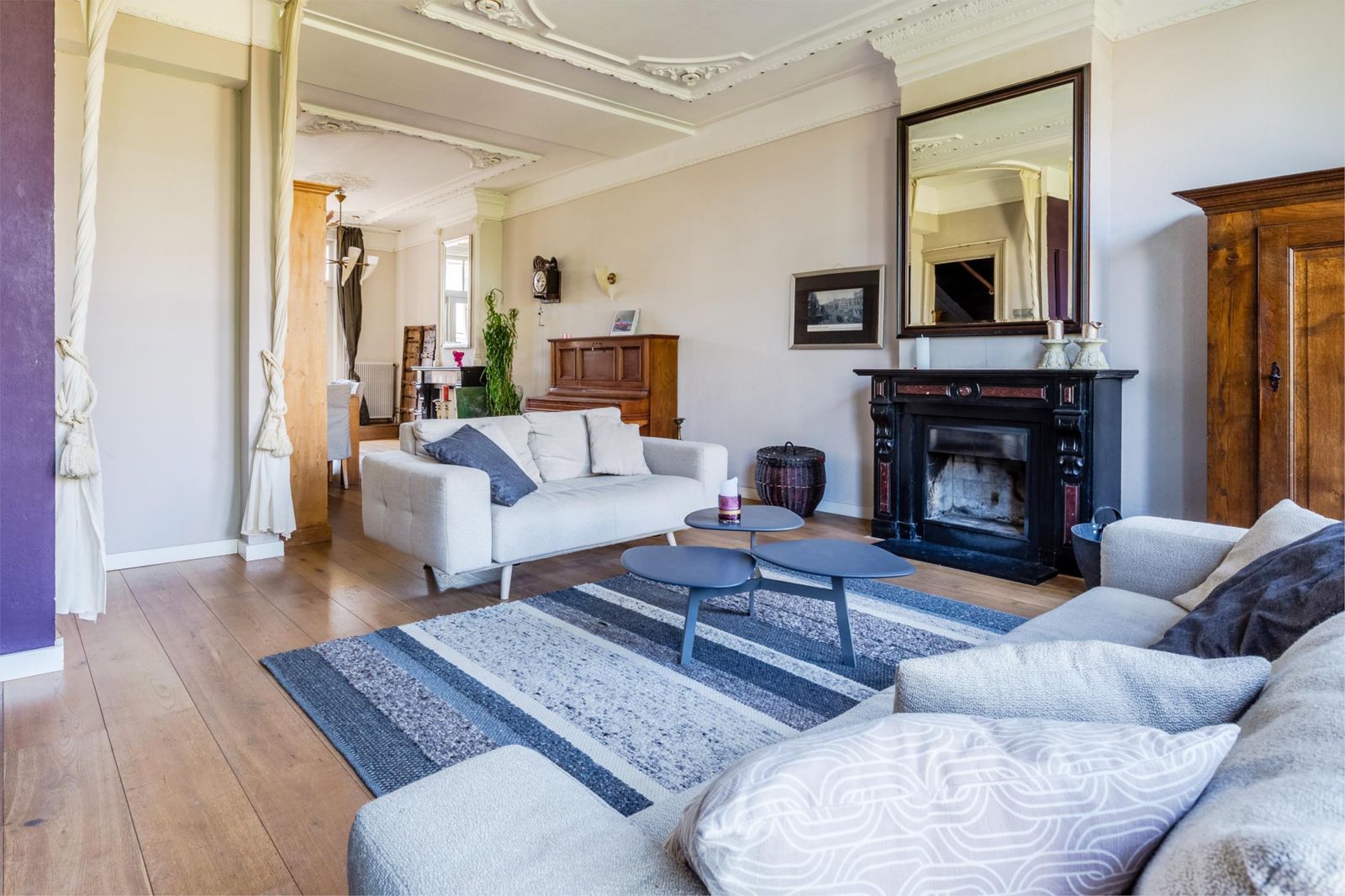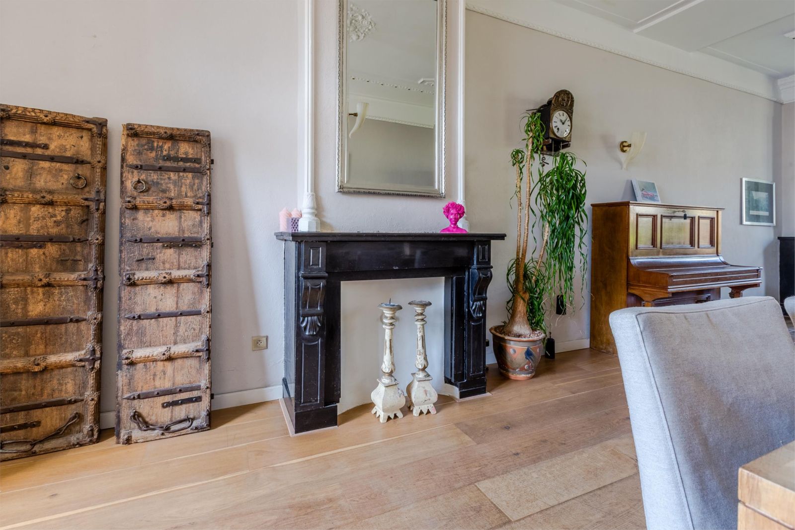 Aan de voorzijde ligt de stijlvolle zitkamer met hoge plafonds, klassieke ornamenten, een eikenhouten vloer en een authentieke, marmeren schouw met goedwerkende open haard! Heerlijk sfeervol en warm in de herfst en winter maanden!