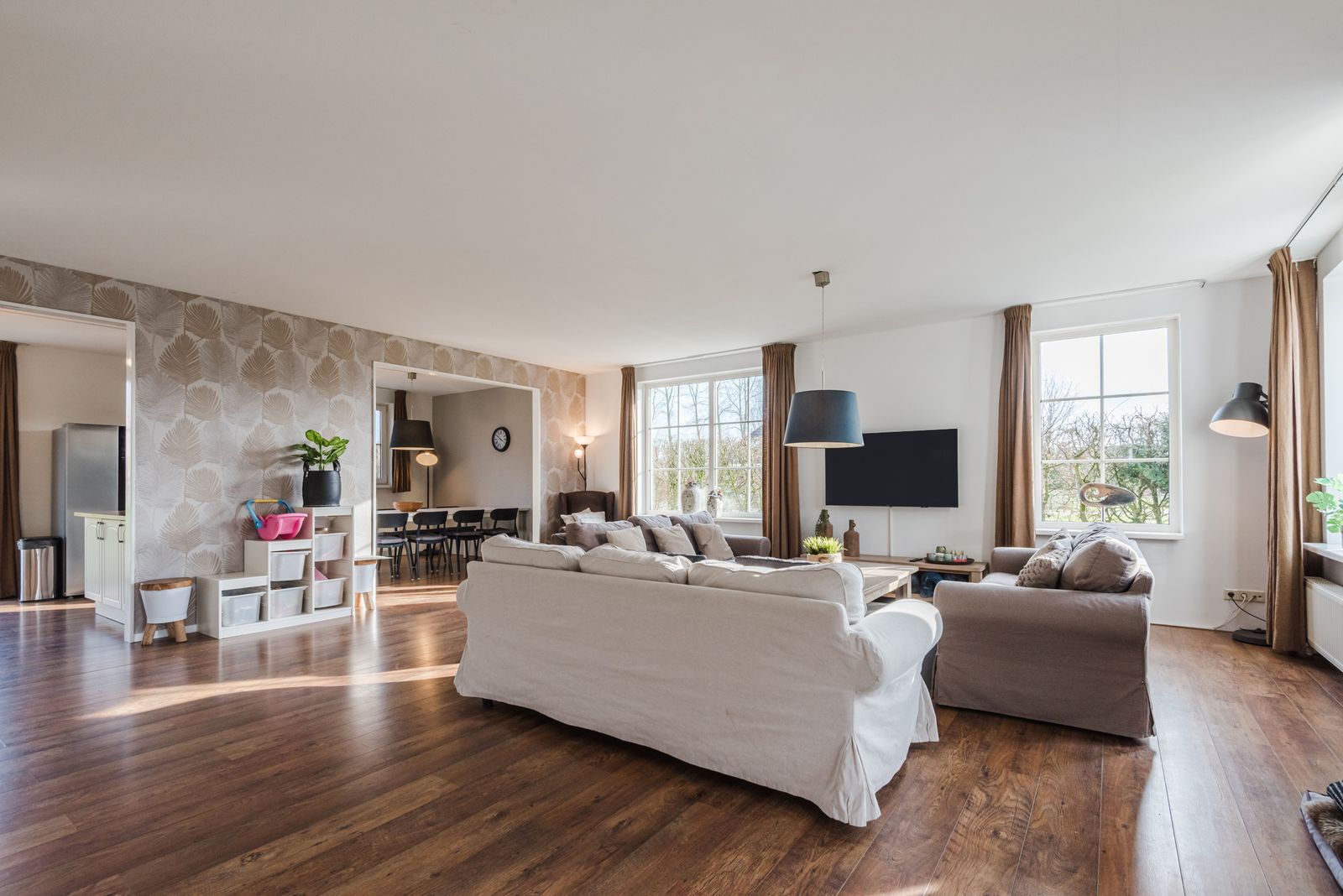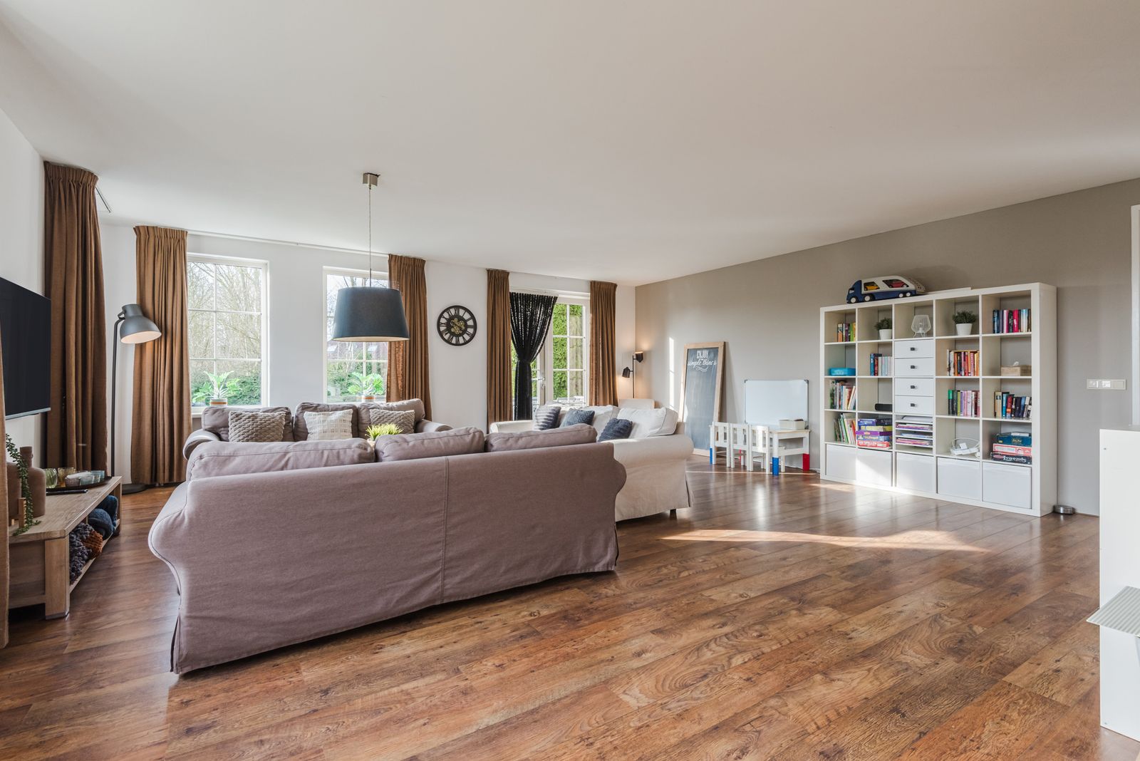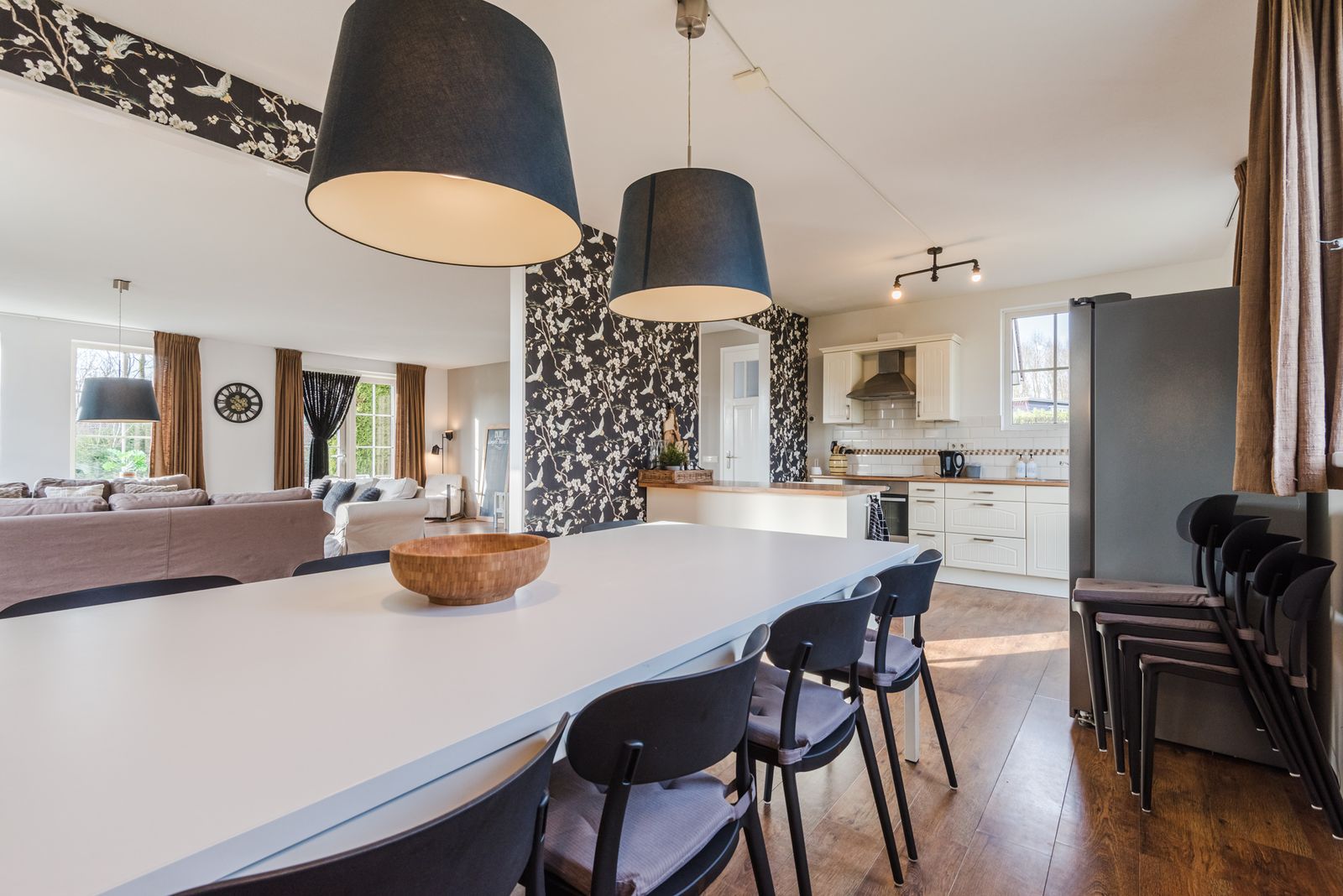 De ruime en lichte tuingerichte woonkamer beschikt over grote raampartijen en openslaande deuren naar de zonnige tuin.