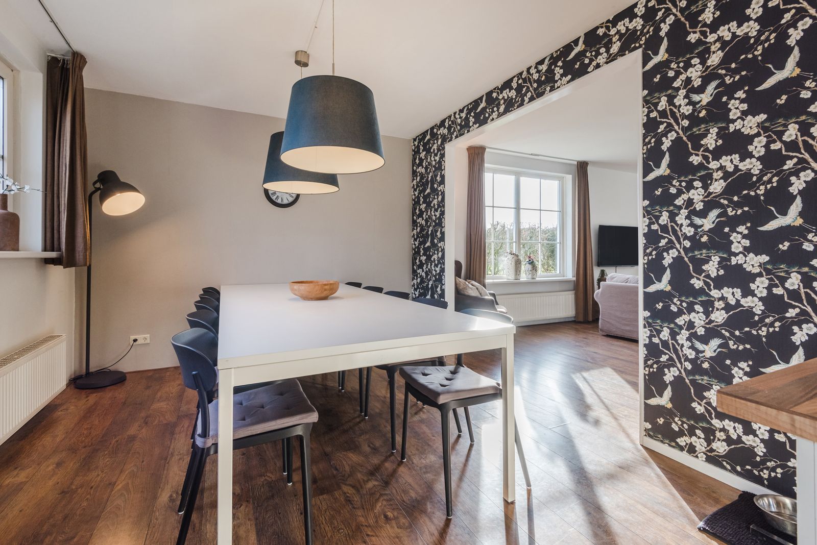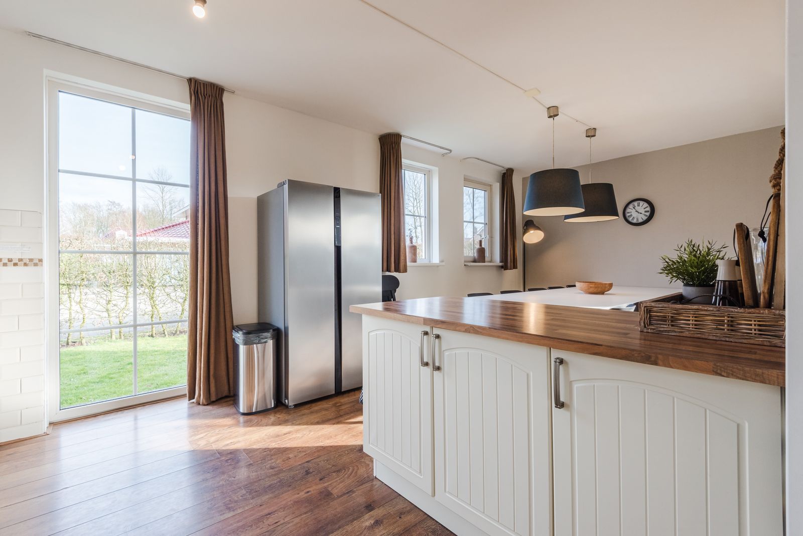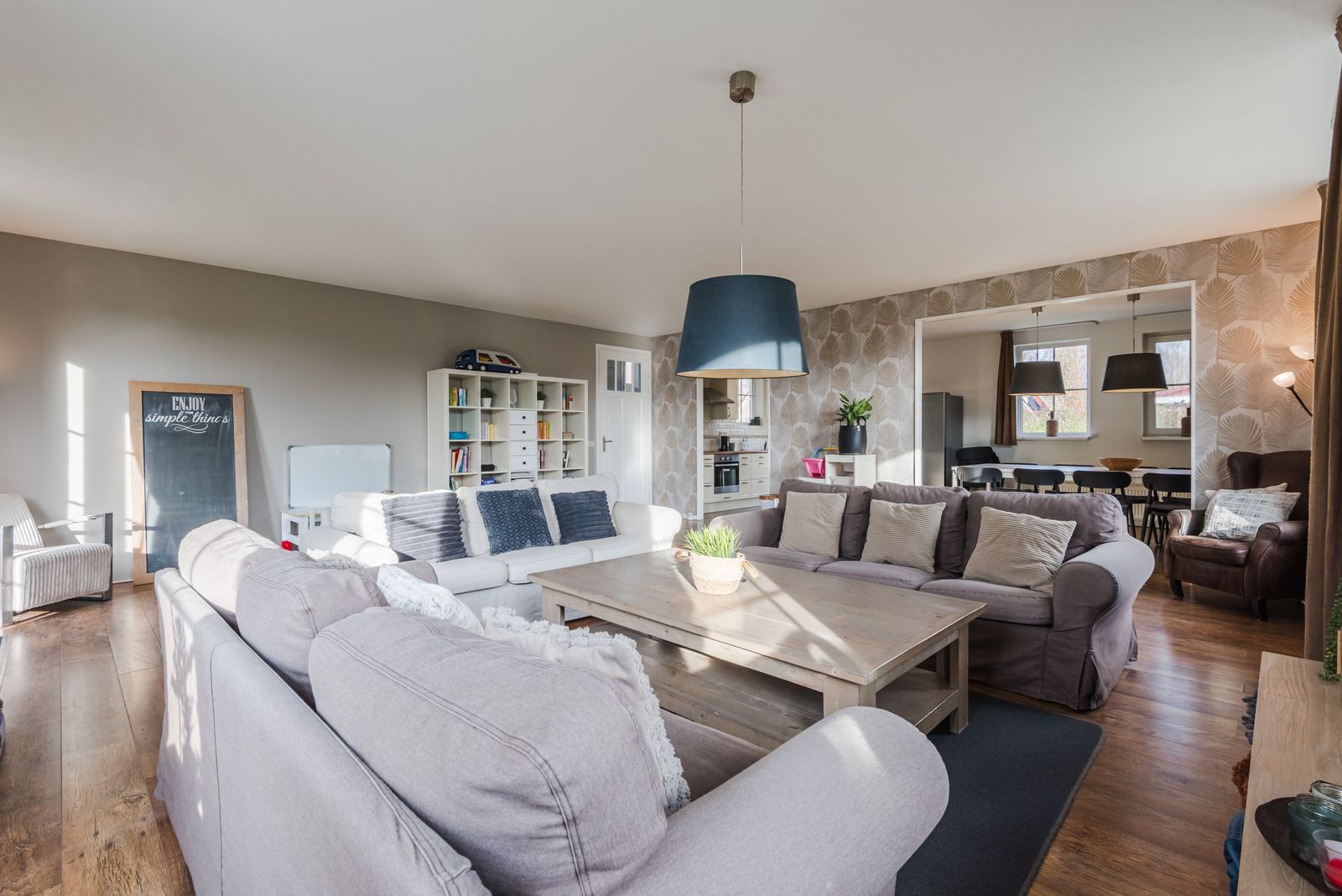 De ruime en lichte tuingerichte woonkamer beschikt over grote raampartijen en openslaande deuren naar de zonnige tuin.