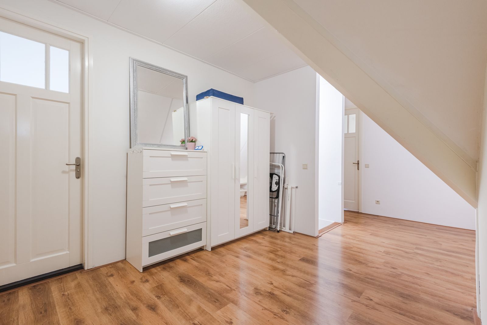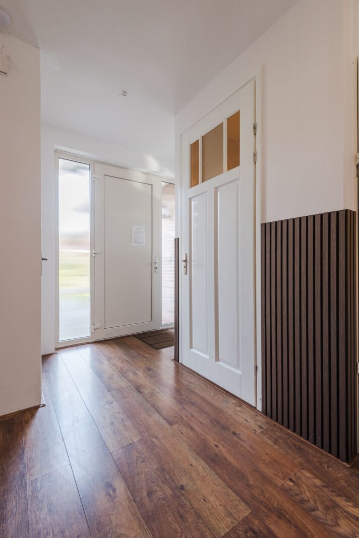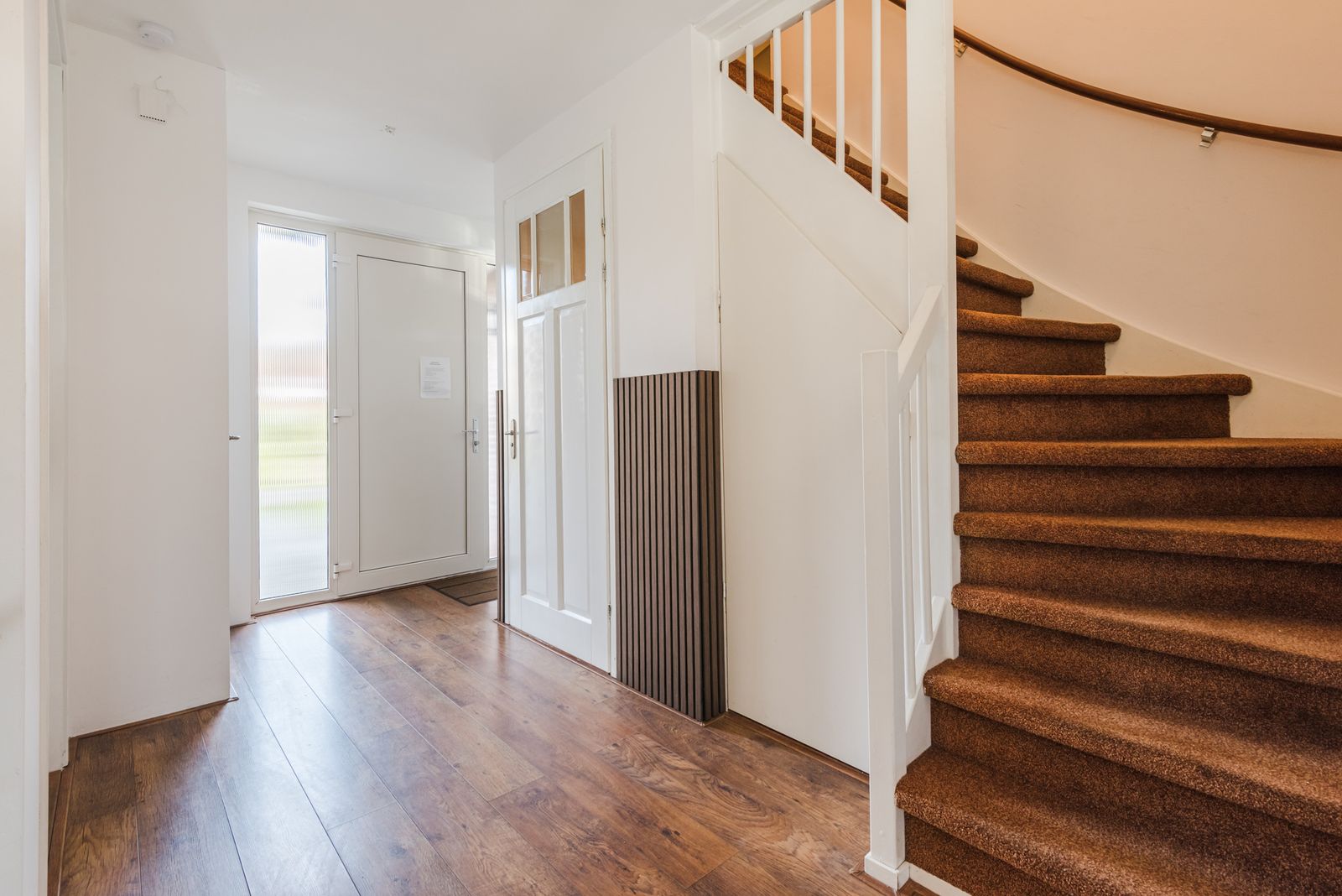 Via de entree komt u in de hal met toilet, meterkast en vaste trap naar de eerste verdieping, met praktische bergruimte onder de trap.