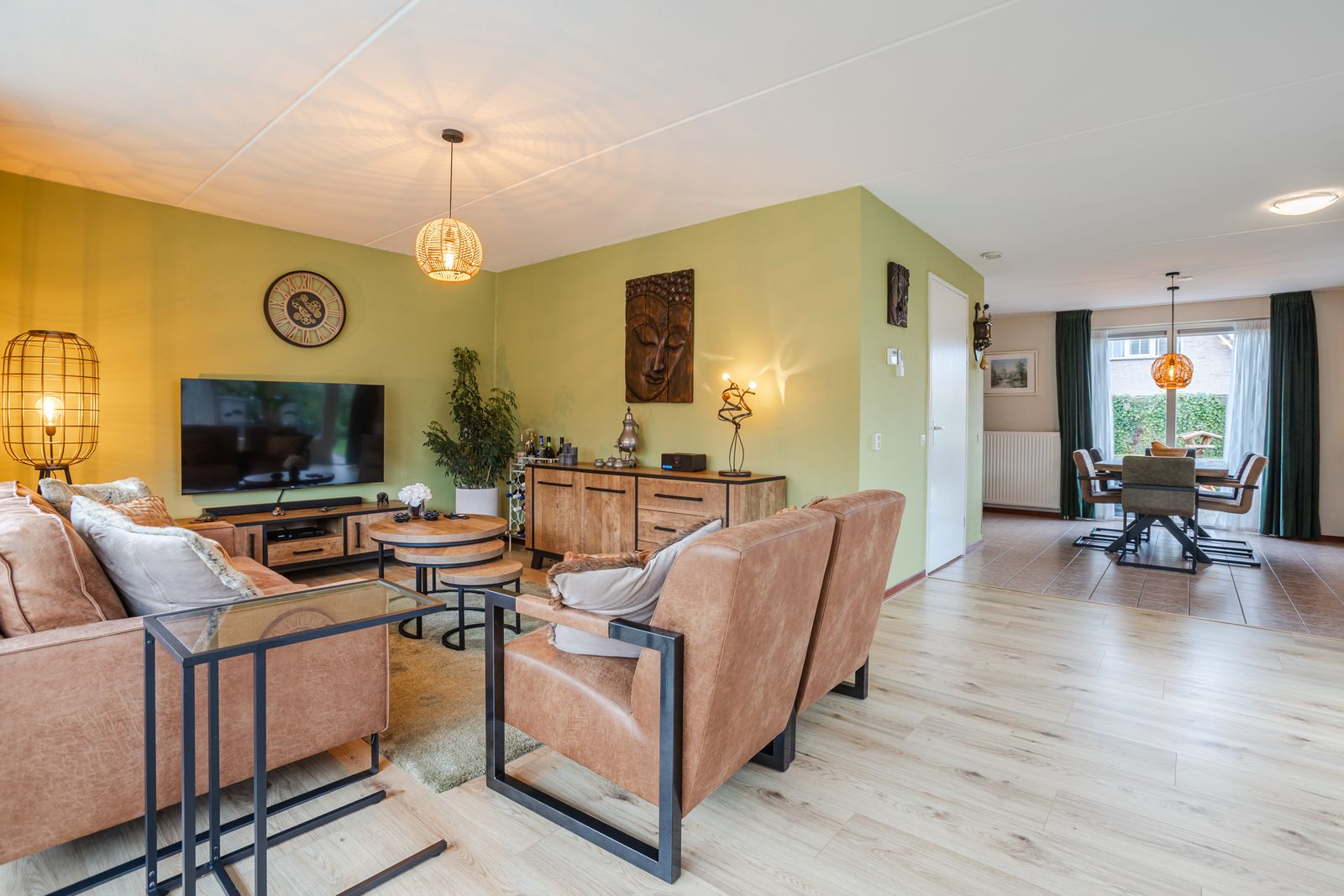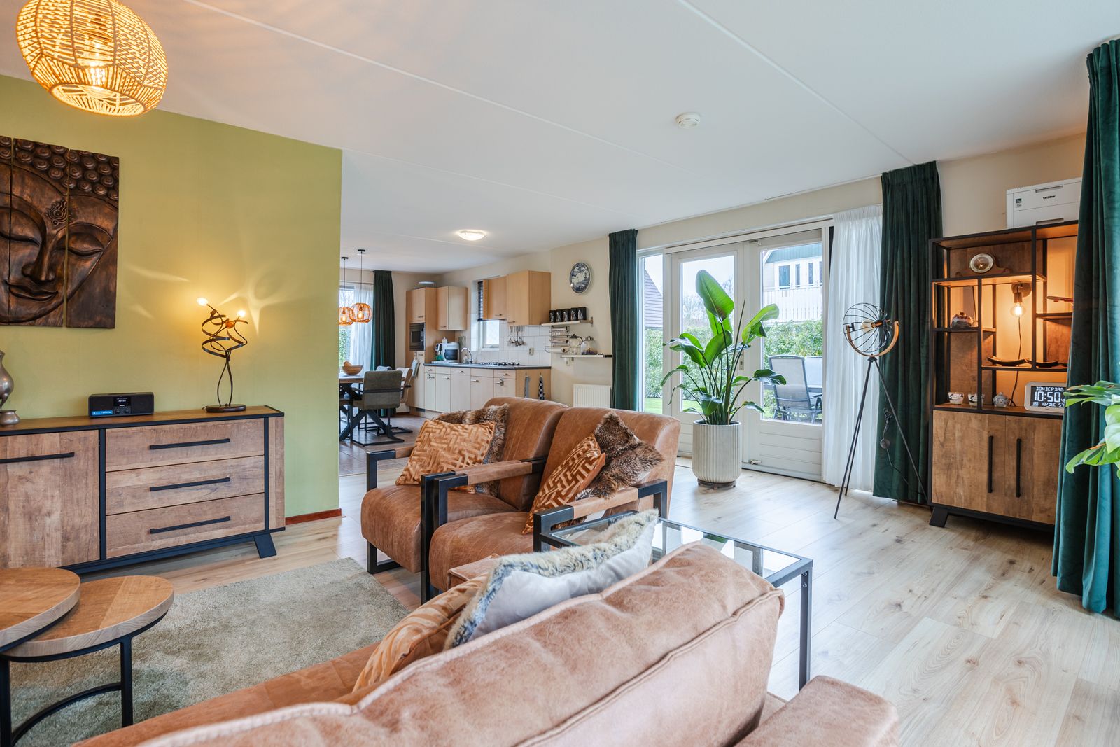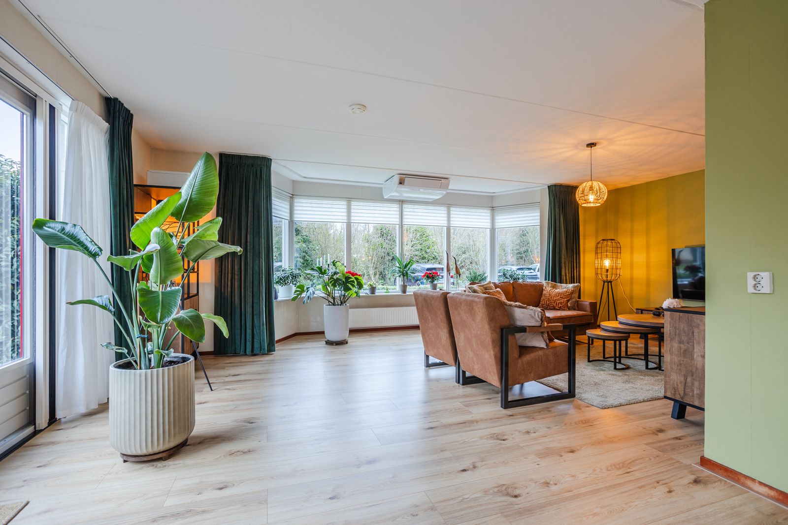 De lichte woonkamer is voorzien van een nieuwe laminaatvloer, een erker, grote raampartijen en een schuifpui naar de tuin. Een heerlijke plek om tot rust te komen.