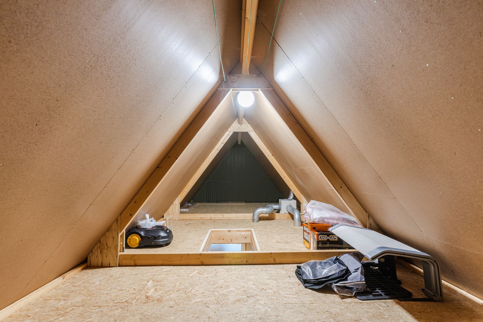 Via een vlizotrap bereikt u de grote zolderruimte op stahoogte, ideaal als extra opslag of multifunctionele ruimte.