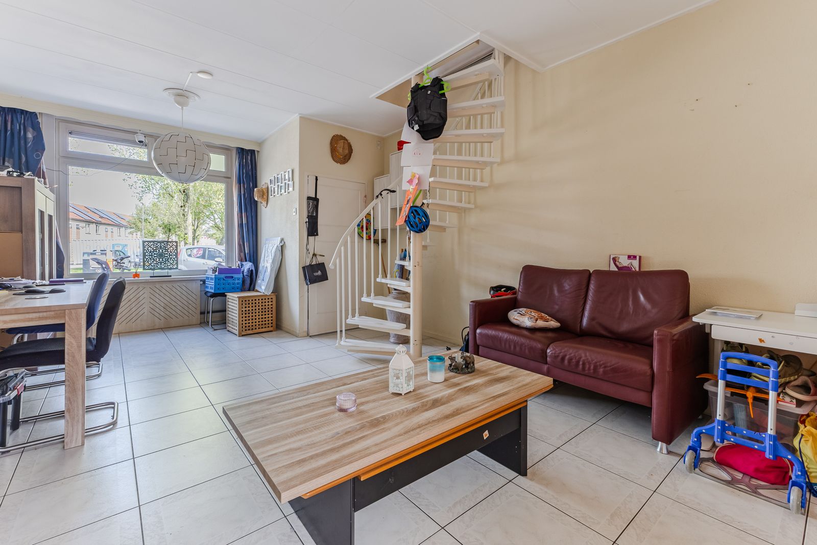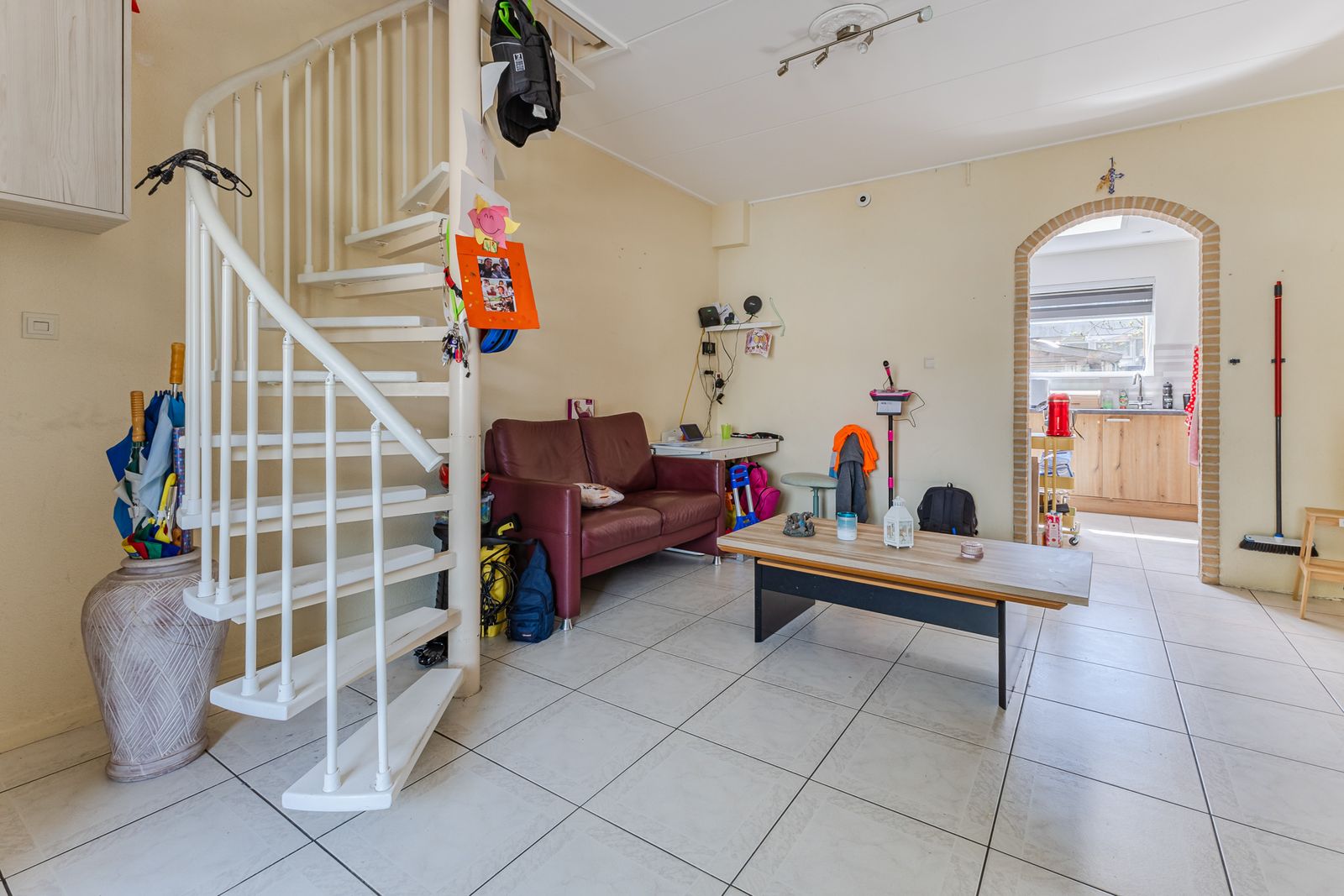 woonkamer met wenteltrap, keuken en badkamer wc zijn beneden. bij de keuken een deur naar de tuin en schuur poort achterom
