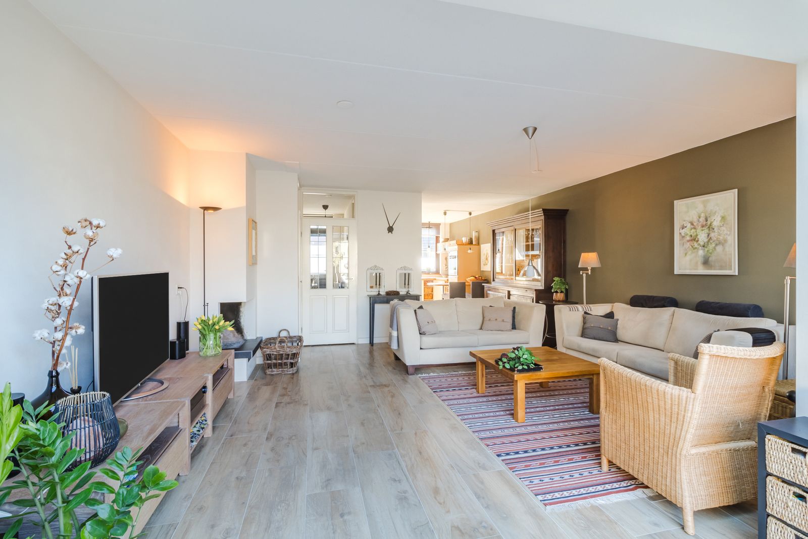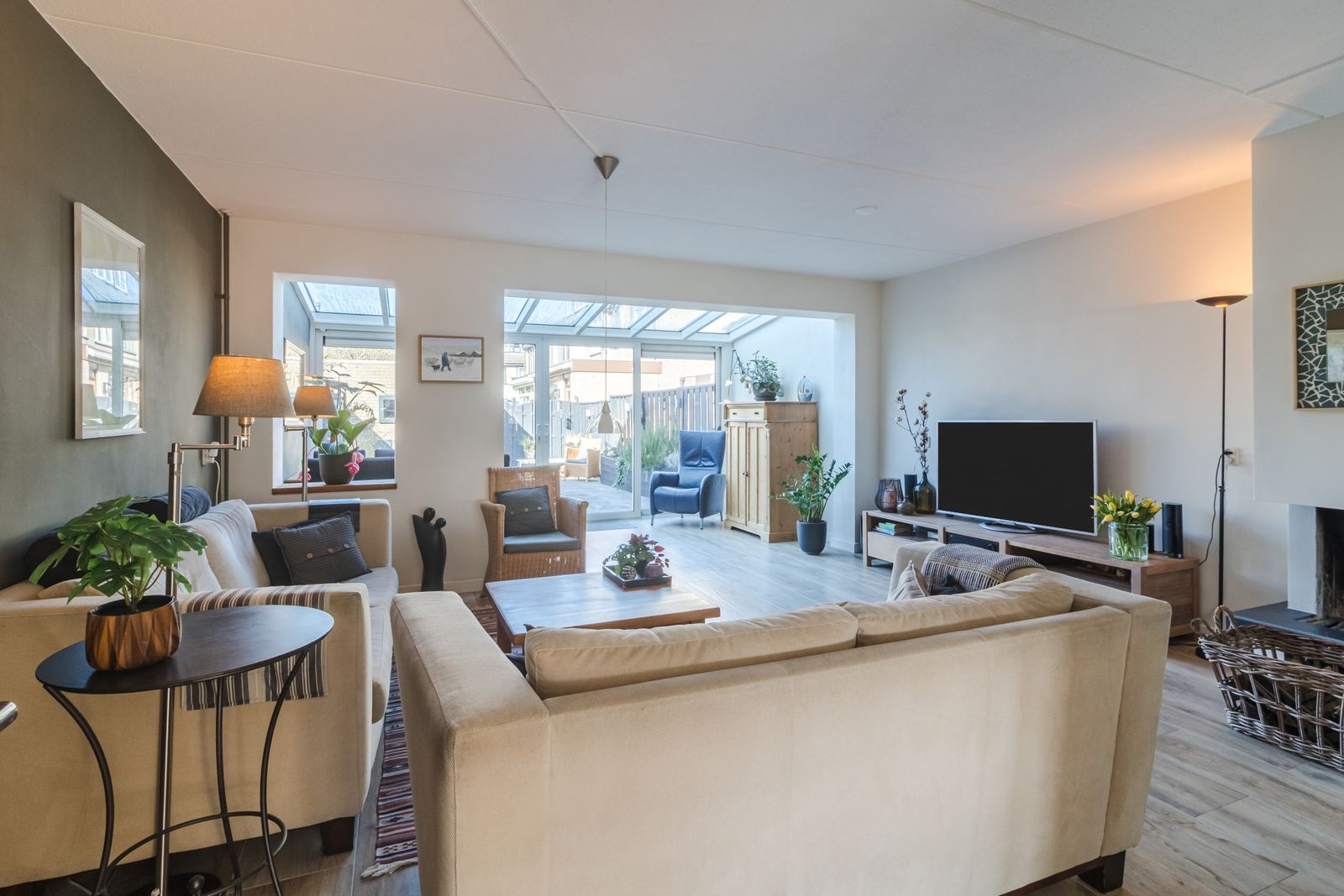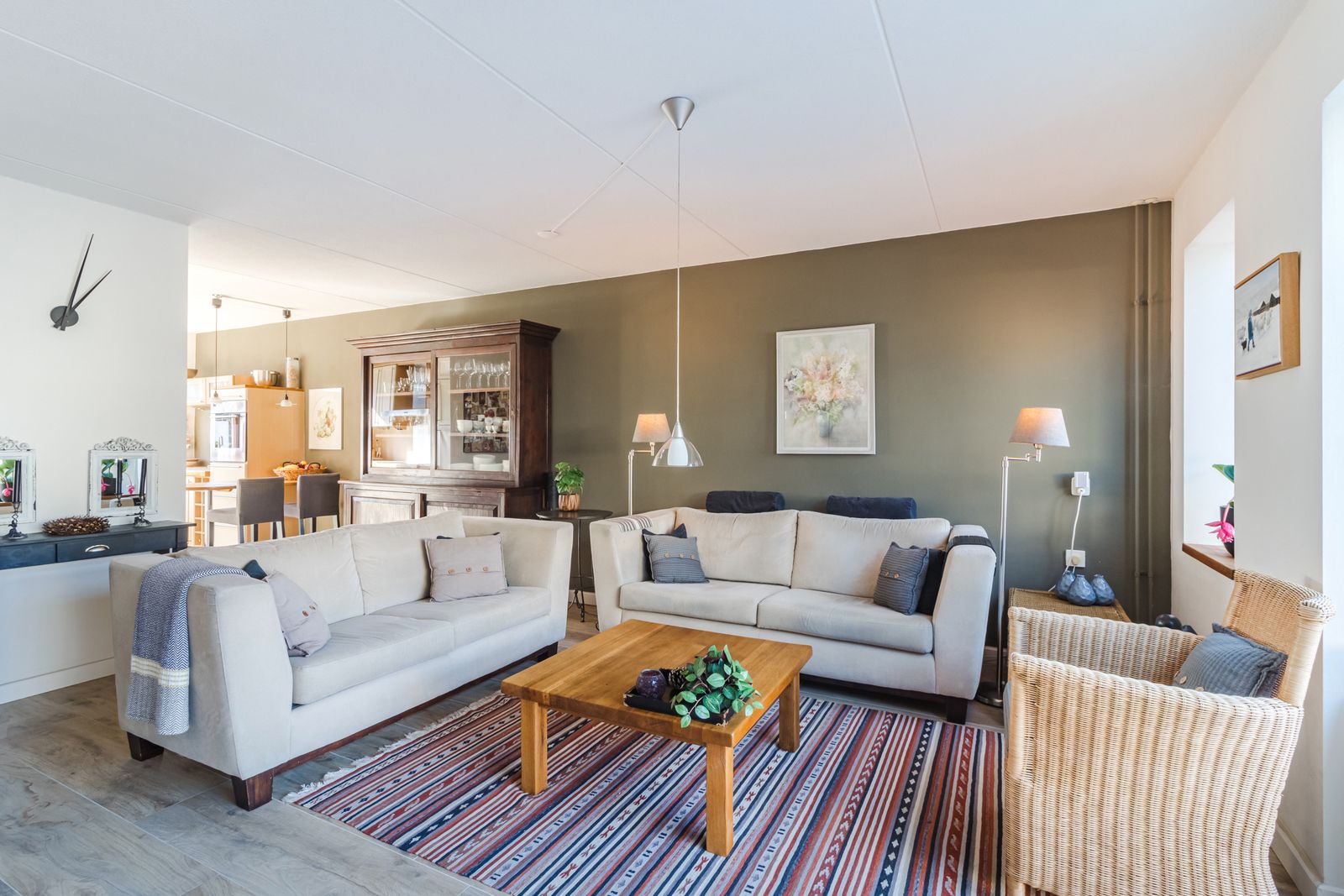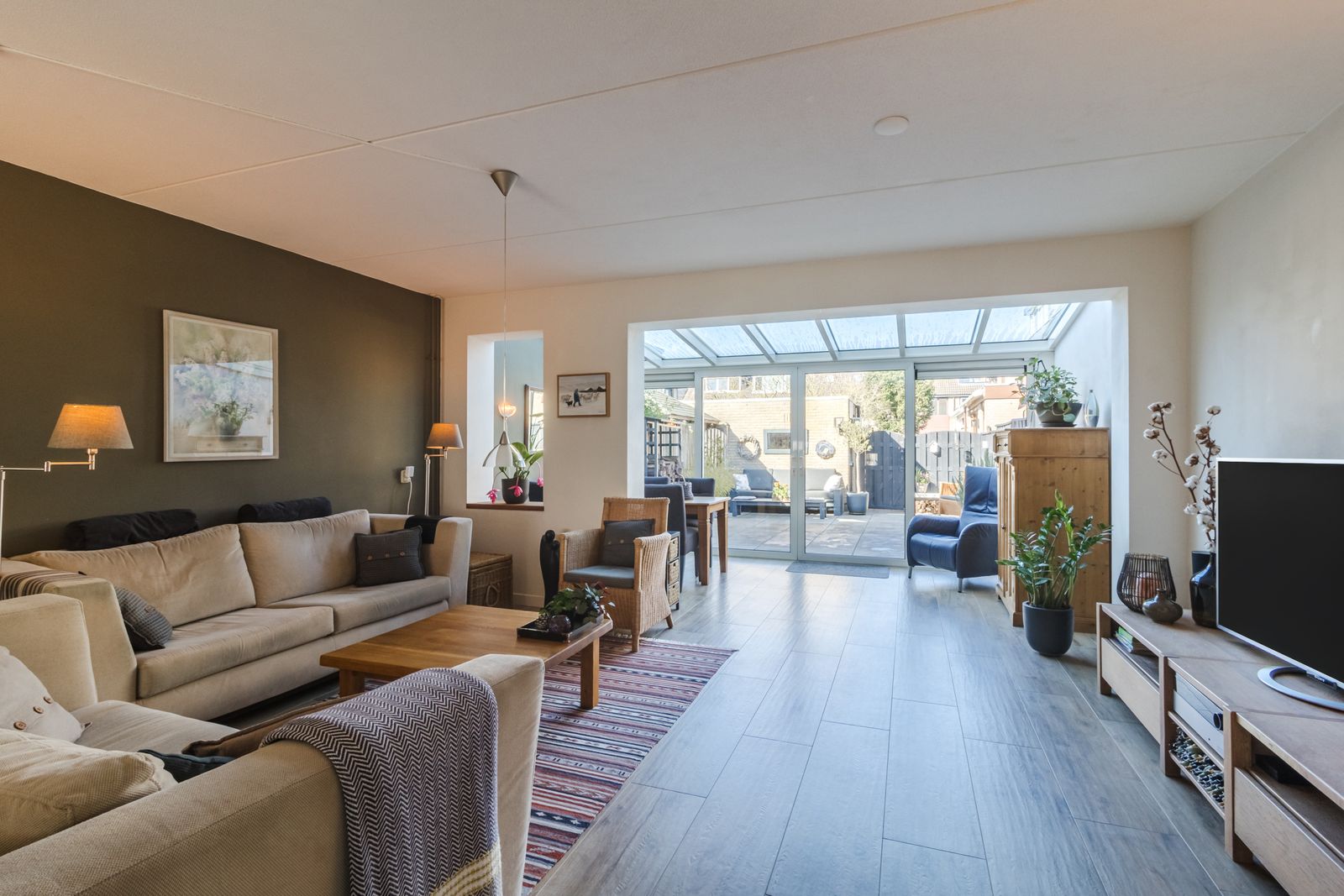 Woonkamer voorzien van plavuizen met vloerverwarming, open verbinding met de keukenruimte en de serre die veel lichtinval biedt door de grote raampartijen en uitzicht op de tuin.