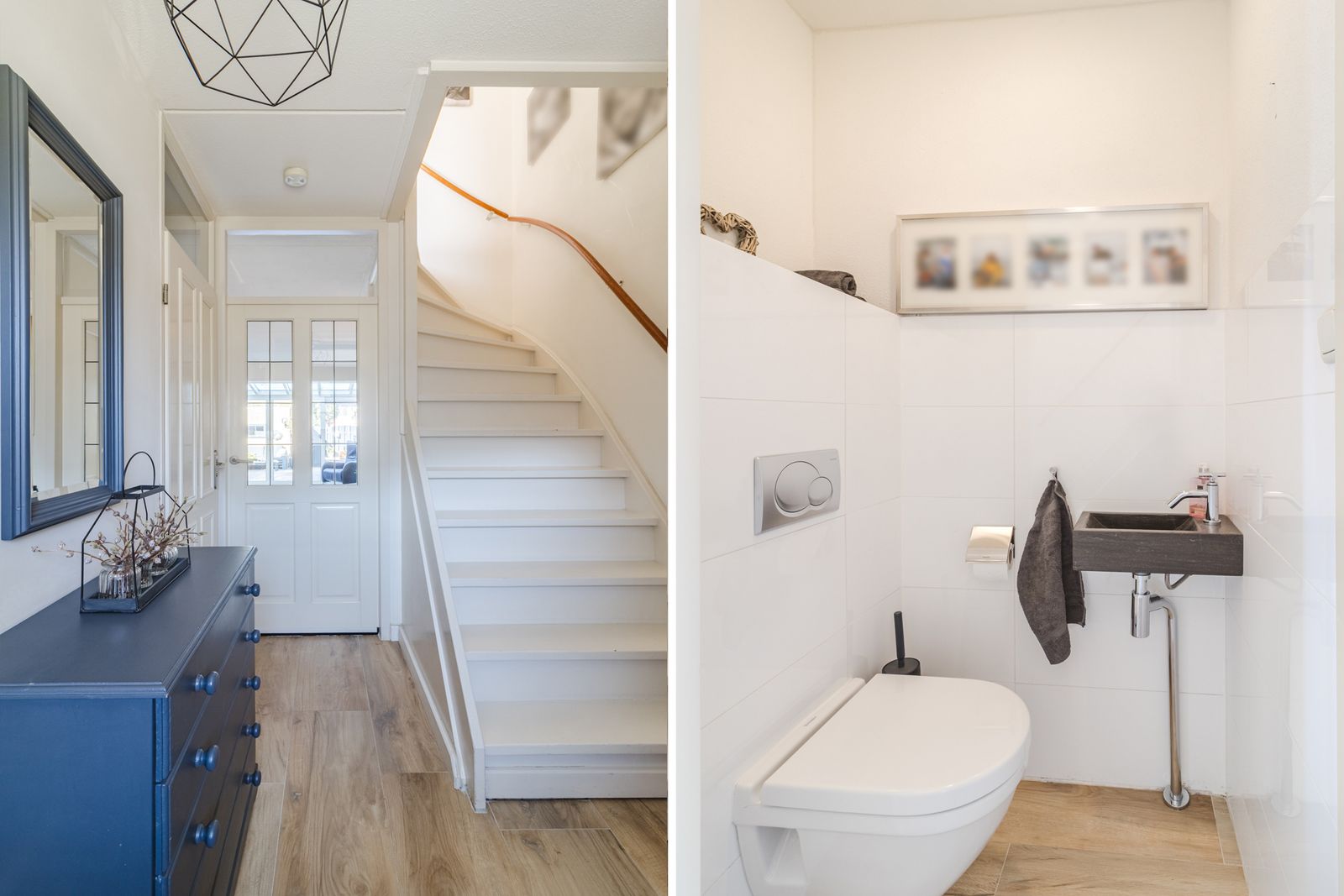 Woningentree; hal met garderobe, meterkast, toilet en trapopgang.