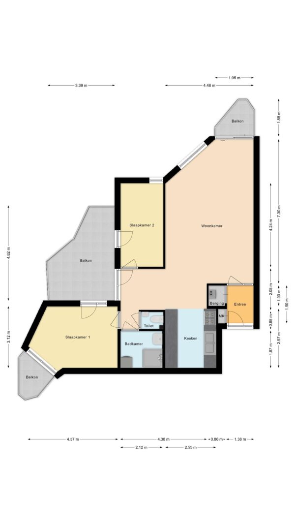 Het appartement is gelegen op de 3e verdieping en beschikt over ca.80m² woonoppervlakte. Er is een ruime en lichte woonkamer met een open keuken, twee slaapkamers, een badkamer en een separaat toilet. Aan buitenruimte is geen gebrek: er zijn namelijk 3 buitenruimtes aanwezig. Het grote terras is gelegen op het zuiden waardoor je hier van ’s morgens vroeg tot de late middag kan genieten van de zon.
