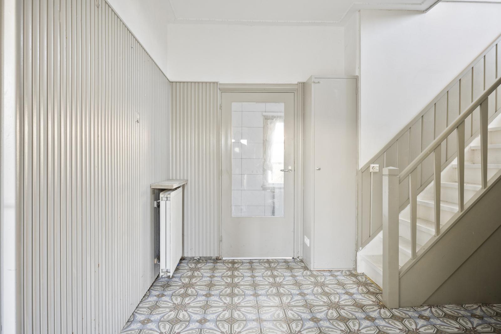 U betreedt de woning officieel via de hal aan de achterzijde of via de bijkeuken aan de voorzijde. Vanuit beide entrees hier heeft u toegang tot de gesloten keuken, die is voorzien van een koelkast, vaatwasmachine, magnetron, gasfornuis en afzuigkap. De keuken beschikt over een handige trapkast en geeft toegang tot de centrale hal.