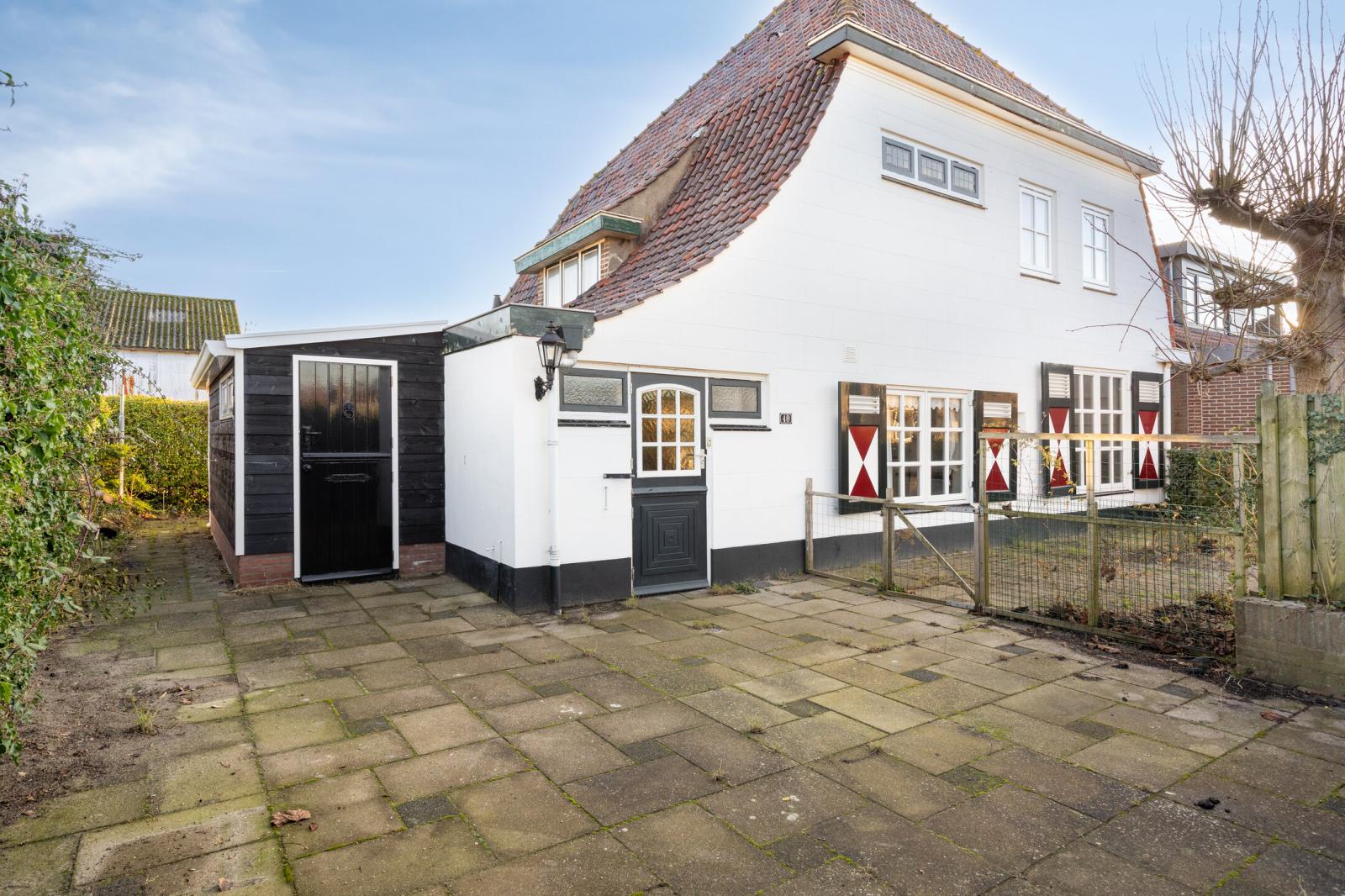 De voortuin, gelegen op het zuidoosten, fungeert als hoofdtuin en is deels afgeschermd met een groene haag en schutting. Achter de woning bevindt zich nog een bestraat terras, perfect om fietsen te stallen of een tweede zitplek te creëren. De tuin is grotendeels onderhoudsvriendelijk aangelegd met tegels. Aan de zijkant van de woning staat een ruime houten schuur voorzien van water en elektra, ideaal als werkruimte of extra bergruimte.
