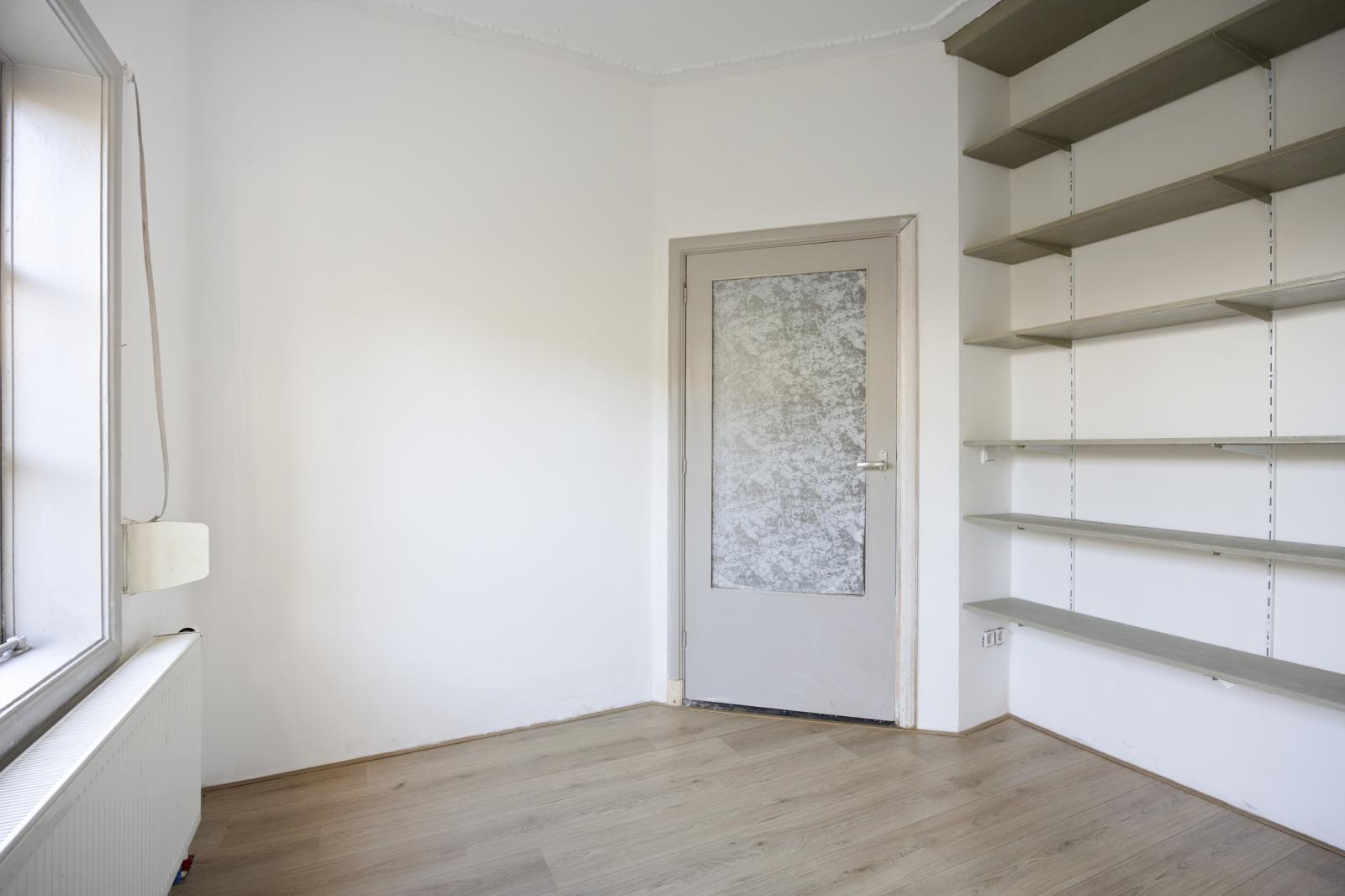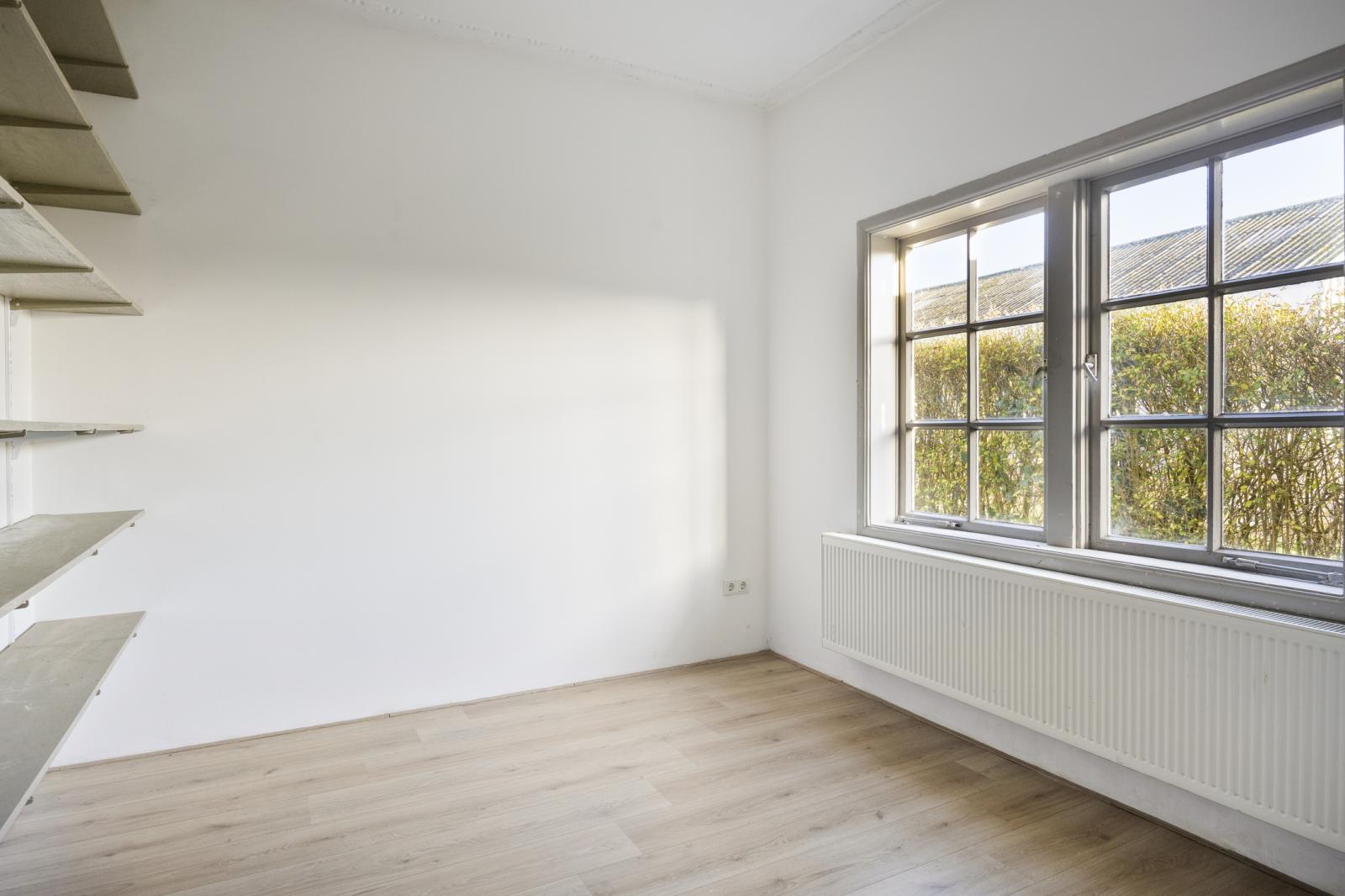 Aan de achterzijde ligt de oorspronkelijke hal met voordeur, die eventueel bij de woonkamer kan worden betrokken. Aansluitend bevindt zich een slaapkamer op de begane grond, met grote raampartijen en uitzicht op de achterzijde. Aan de linkerachterzijde is de bijkeuken gesitueerd met wasmachine en wasdroger aansluiting en er is een mogelijkheid om een douche te realiseren.