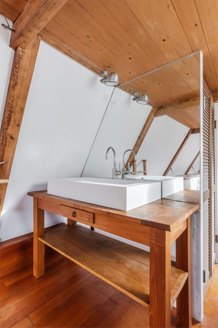 Vast opbergmeubel met ruimte voor wasmachine en droger en vrije ruimte, maar ook twee bergzolders onder het puntdak.