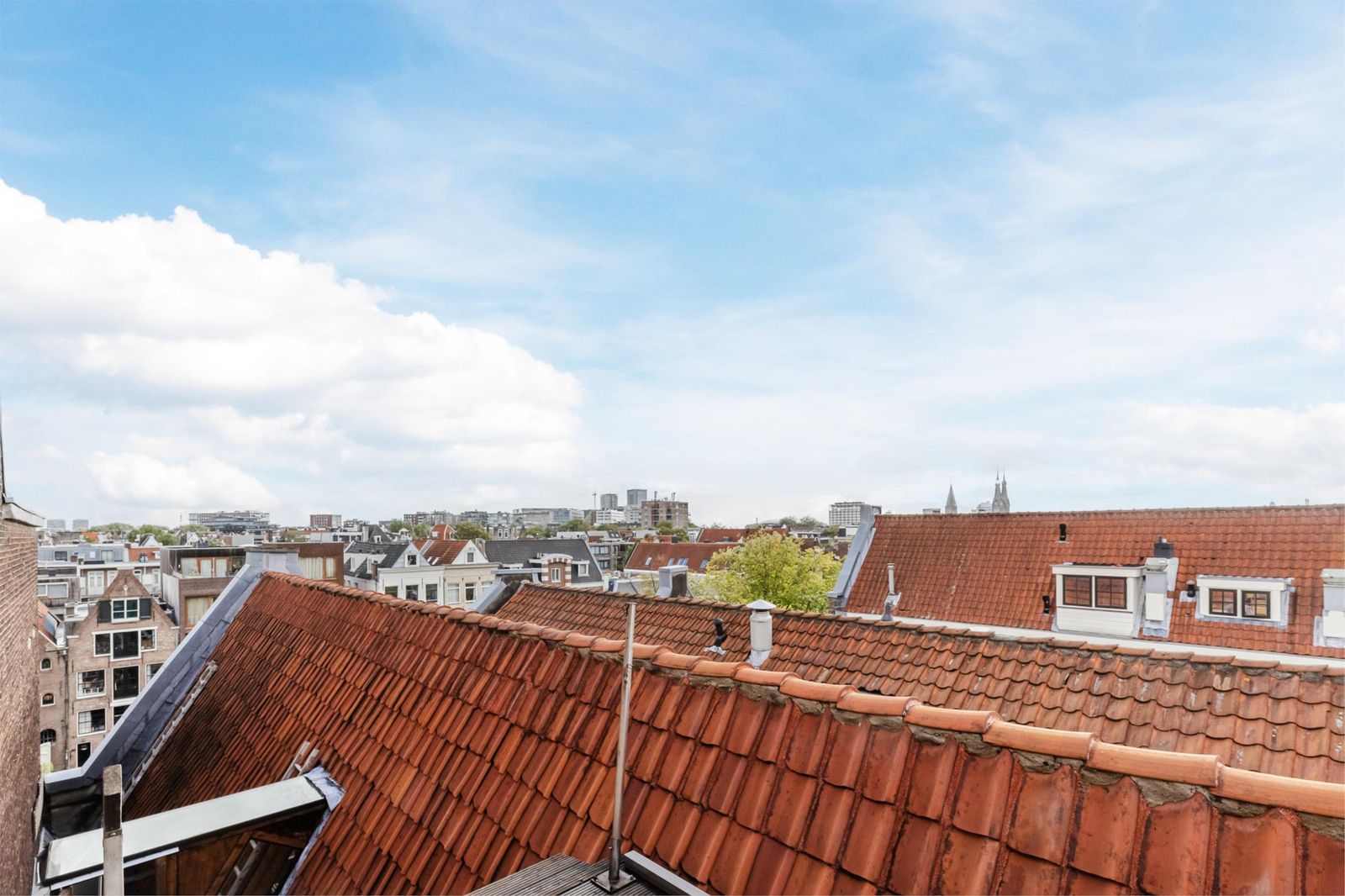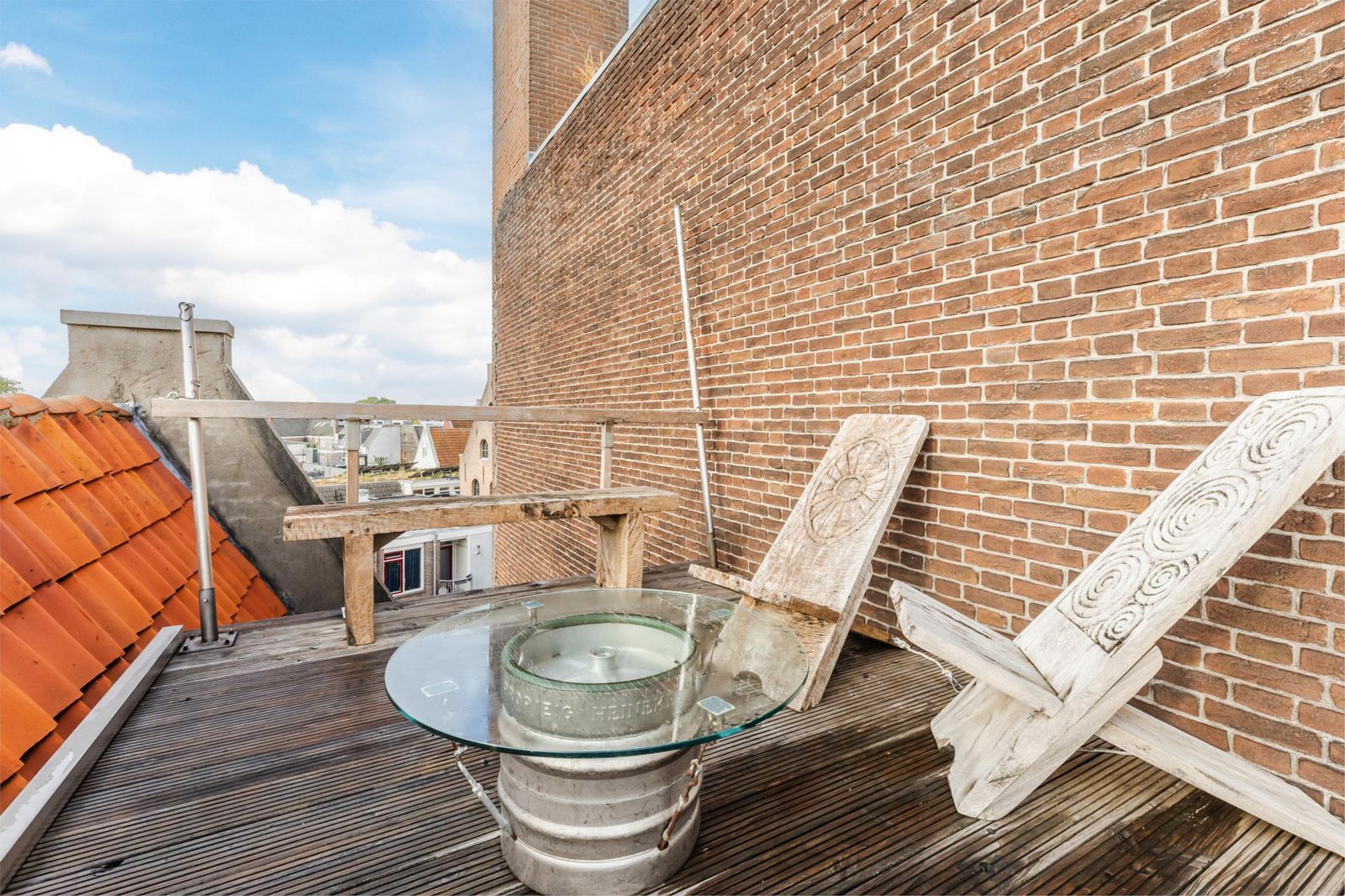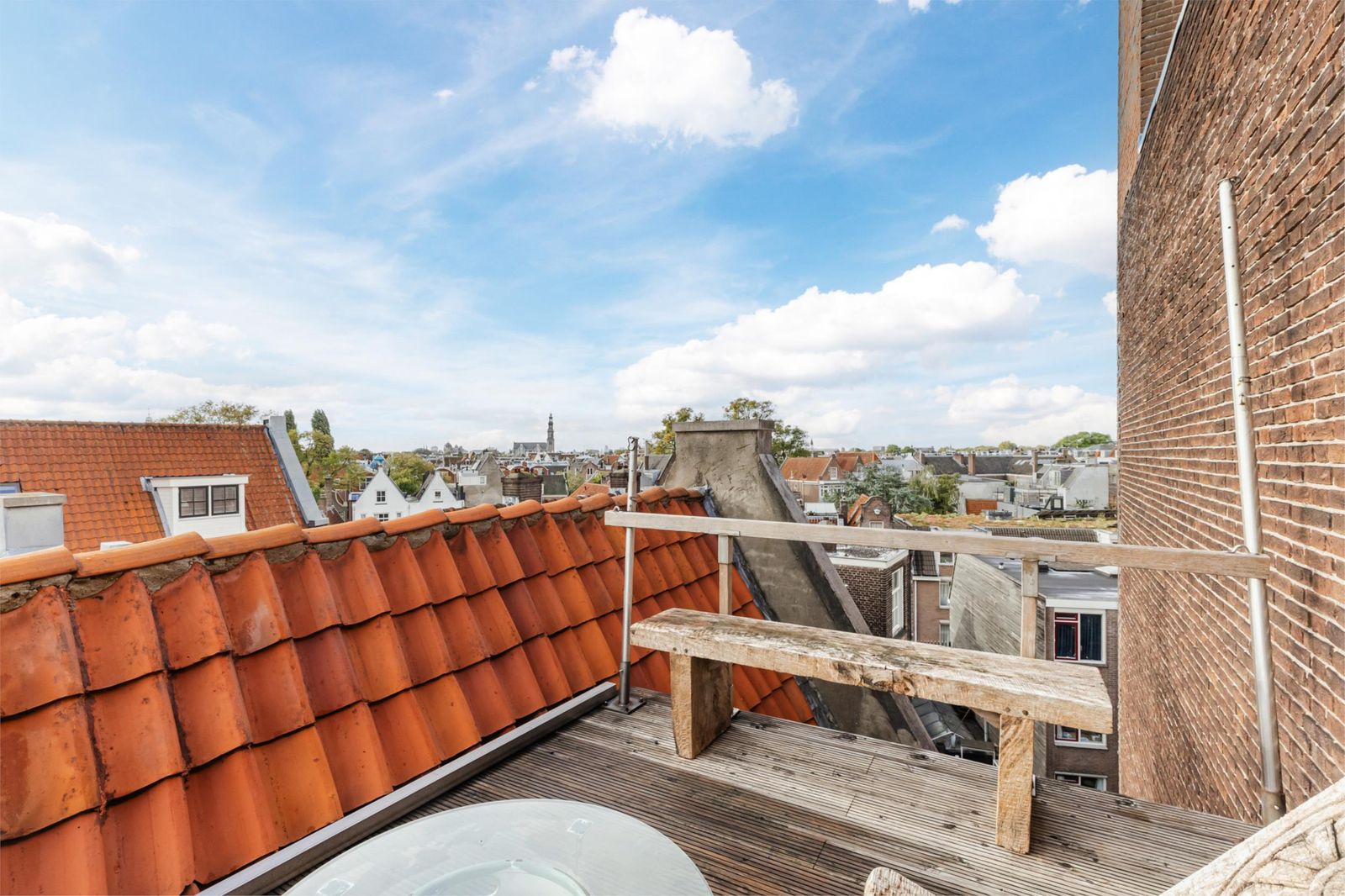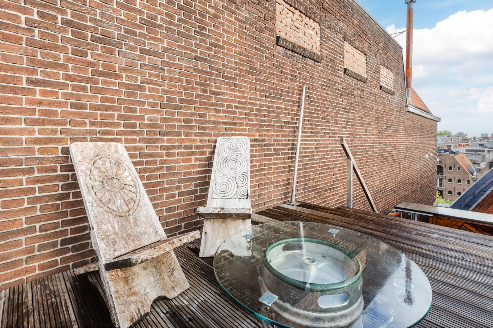 Vanaf de vide directe toegang tot het zonnige dakterras van 10m2 met uitzicht over Het IJ en de Westerkerk. Onder het terras is nog loopruimte langs een lange buitentafel en opslag (extra 10m2).