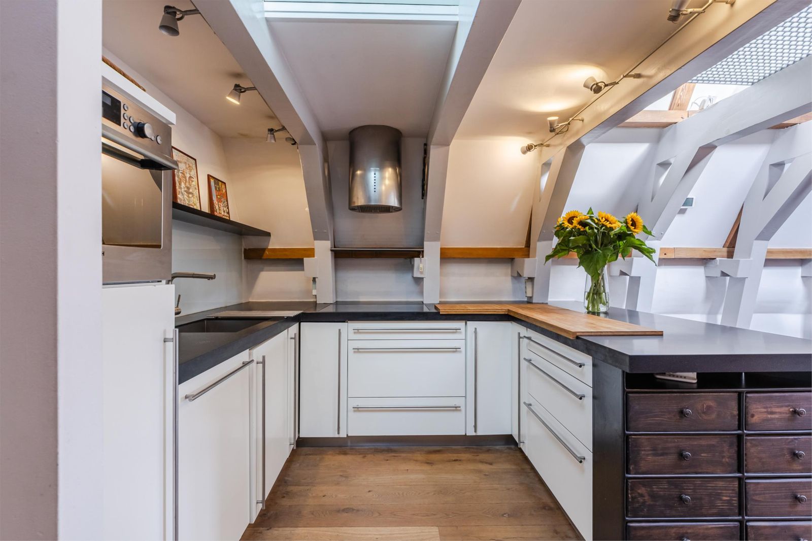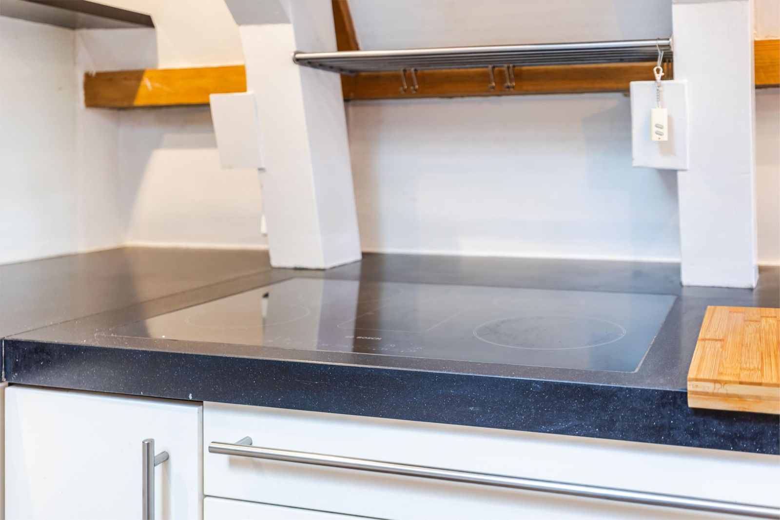 De moderne open keuken is volledig uitgerust met hoogwaardige inbouwapparatuur: combimagnetron, vaatwasser, koelkast, een 80cm inductiekookplaat en autonome afzuiging en veel werkruimte.