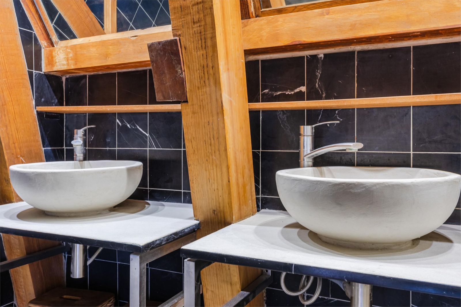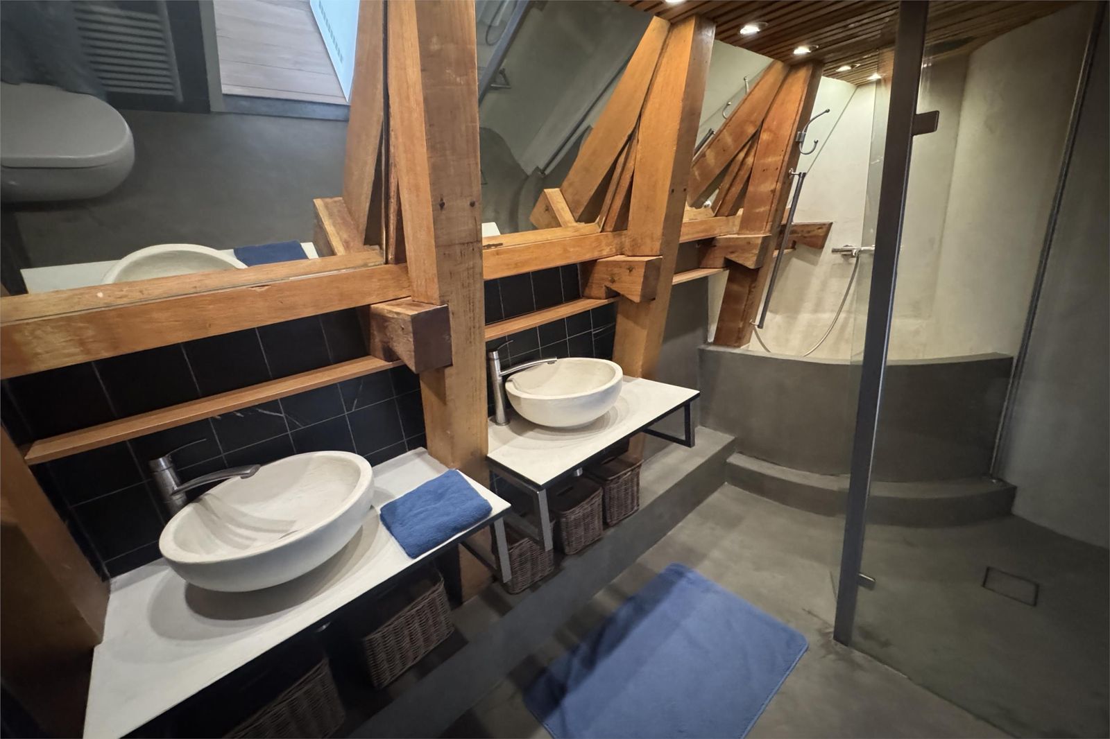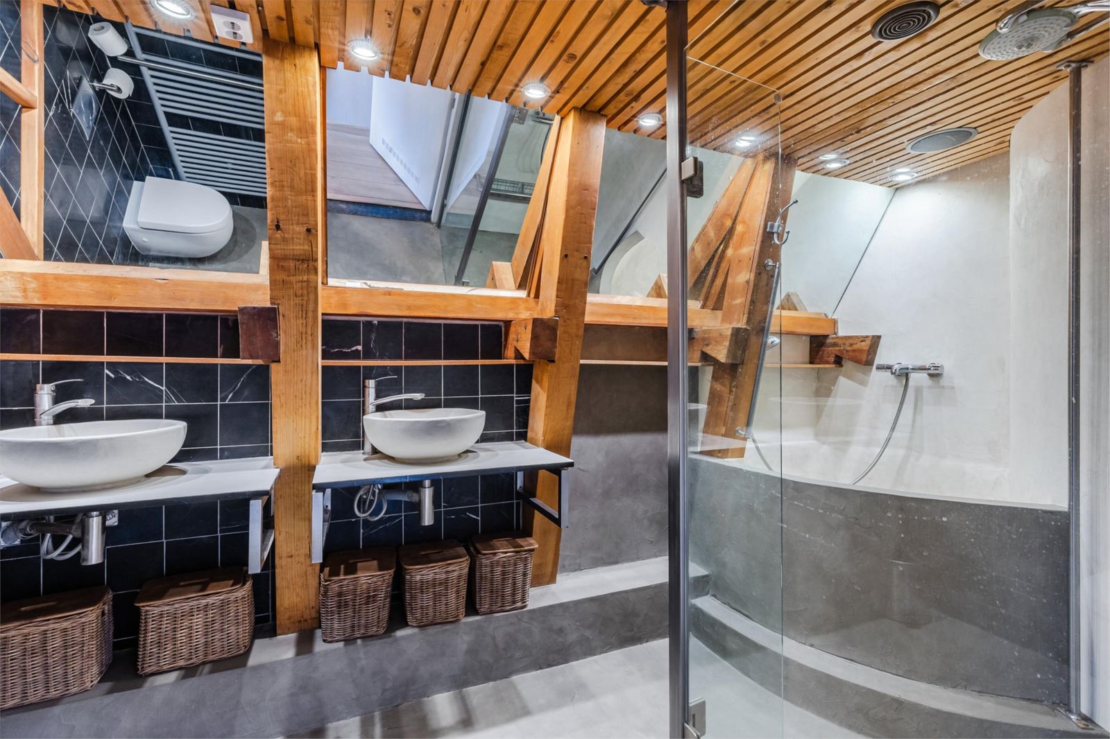 Aansluitend de luxe badkamer met dubbele wastafel, inloopdouche en ligbad.