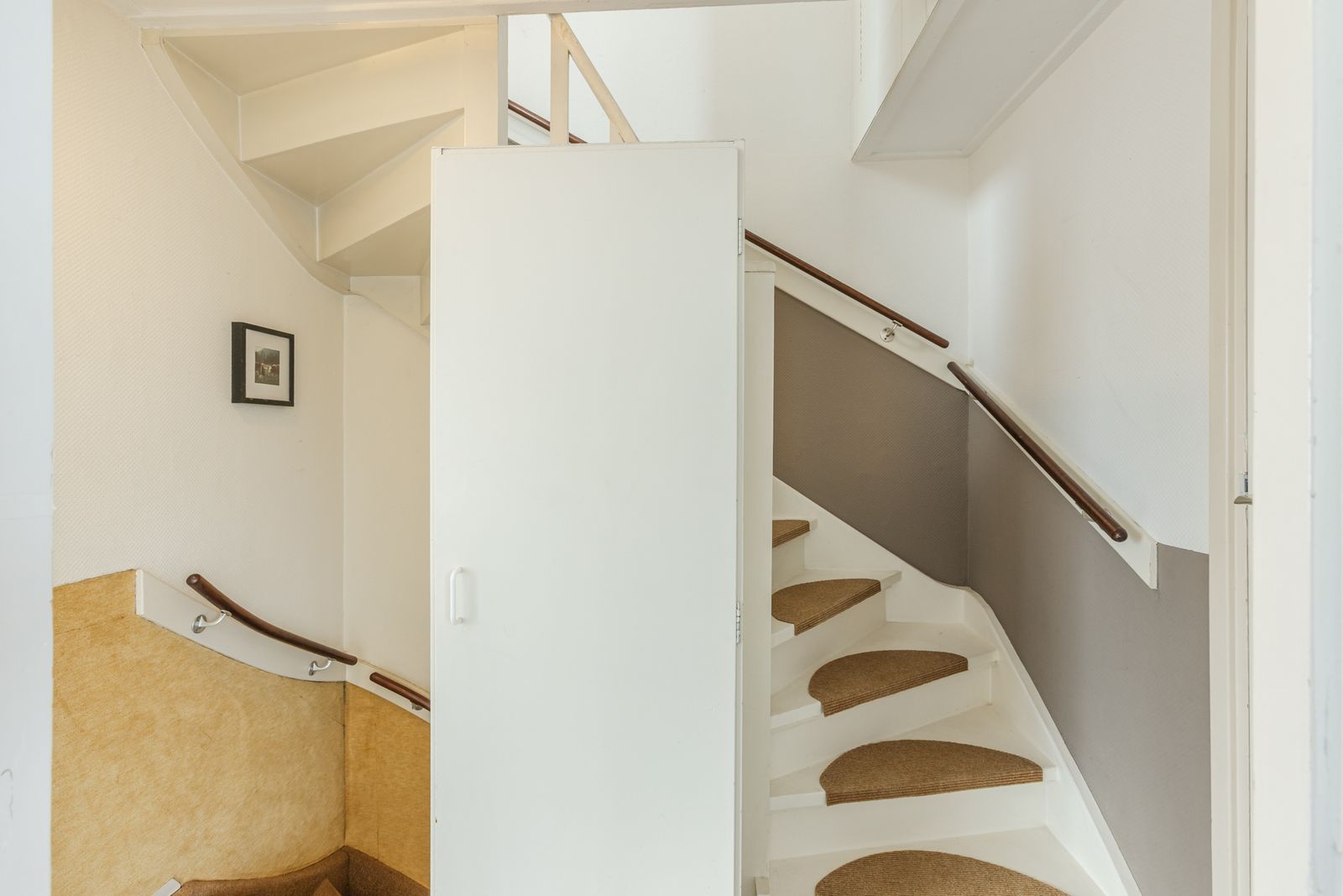 Via de voordeur kom je in de hal. Rechts vind je direct het toilet. Loop je rechtdoor, dan kom je uit bij de ruime keuken. Praktisch is ook de ruime voorraadkast onder de trap. Ga je linksaf, dan stap je de woonkamer in: een fijne, lichte leefruimte met een gashaard voor extra sfeer en warmte.
