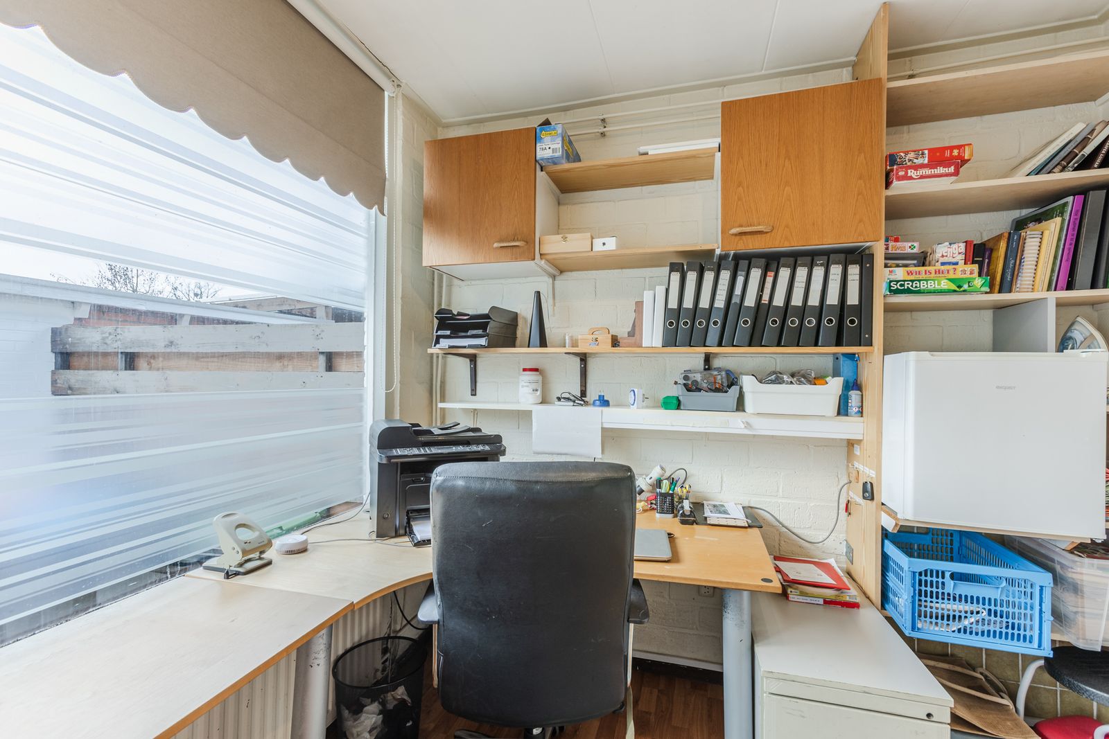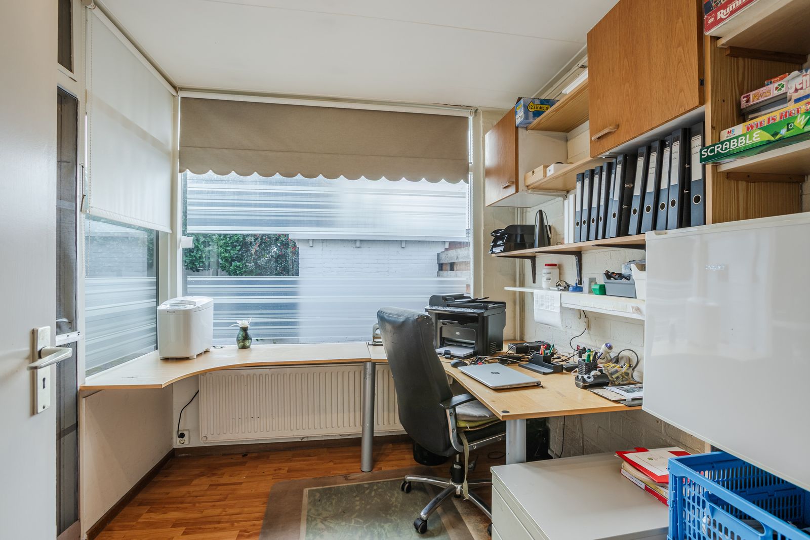 Op de begane grond bevinden zich daarnaast een kantoorruimte (ideaal als werk- of hobbykamer) een slaapkamer met badkamer, waardoor de woning uitstekend geschikt is voor gelijkvloers wonen. Deze slaapkamer en badkamer zijn beide voorzien van vloerverwarming. De badkamer op de begane grond beschikt over de opstelling voor wasmachine en droger.