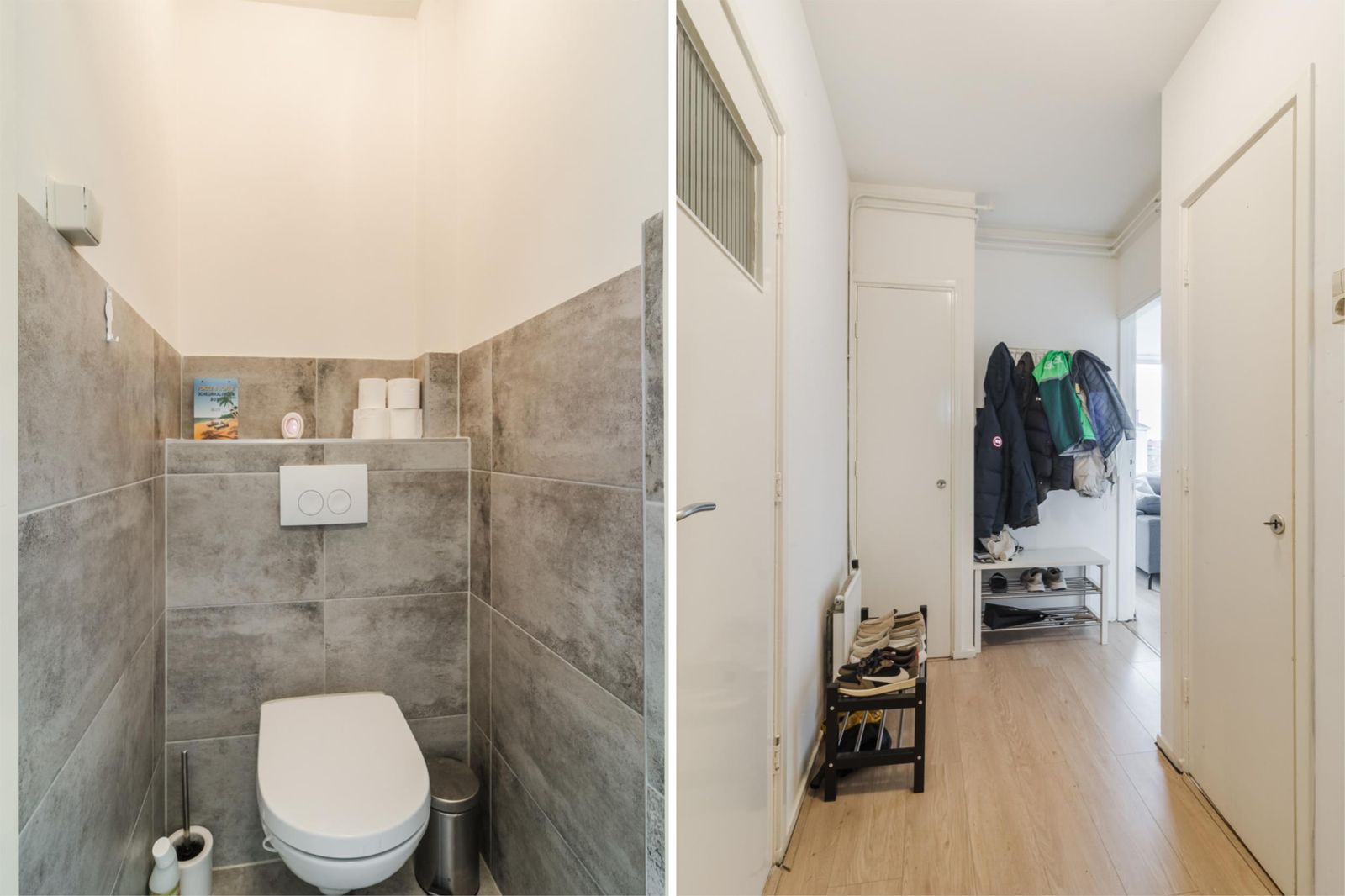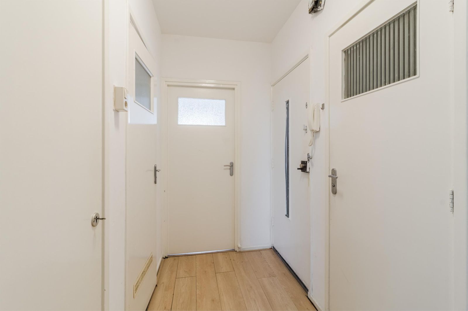Entree naar hal met meterkast, toilet, douche en toegang naar 1ste slaapkamer en woonkamer. De lichte woonkamer grenst aan open keuken en biedt toegang tot de tweede slaapkamer met balkon aan de achterzijde. Dit balkon heeft de volle ochtendzon en deel van de middag.
