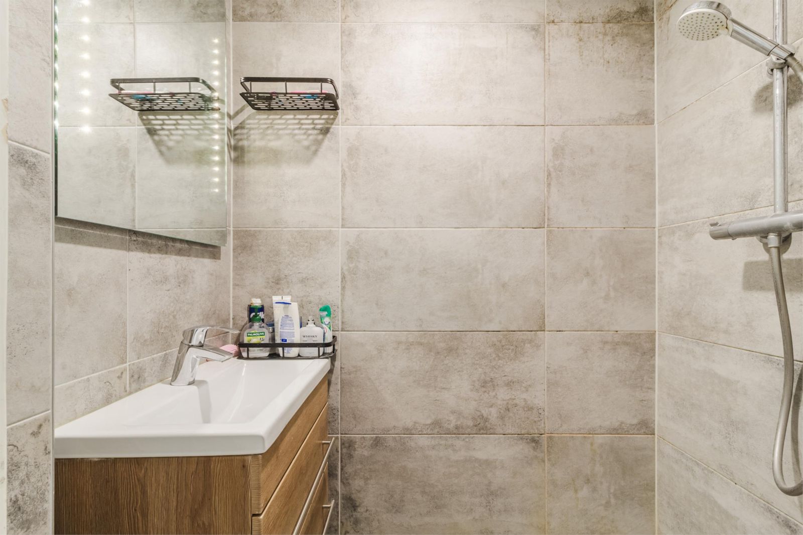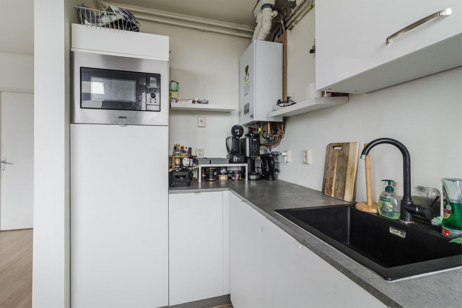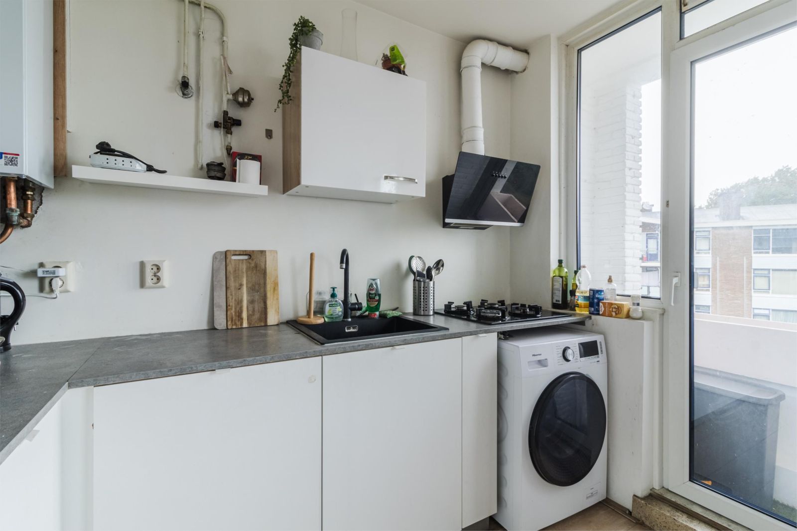 De keuken is voorzien van inbouwapparatuur (ijskast, magnetronoven, vaatwasser), gaskookplaat en moderne afzuigkap. Aan de keuken grenst ook een klein balkonnetje met zicht op de voorzijde. Hier komt de zon vanaf de tweede helft van de middag tot en met de avond.