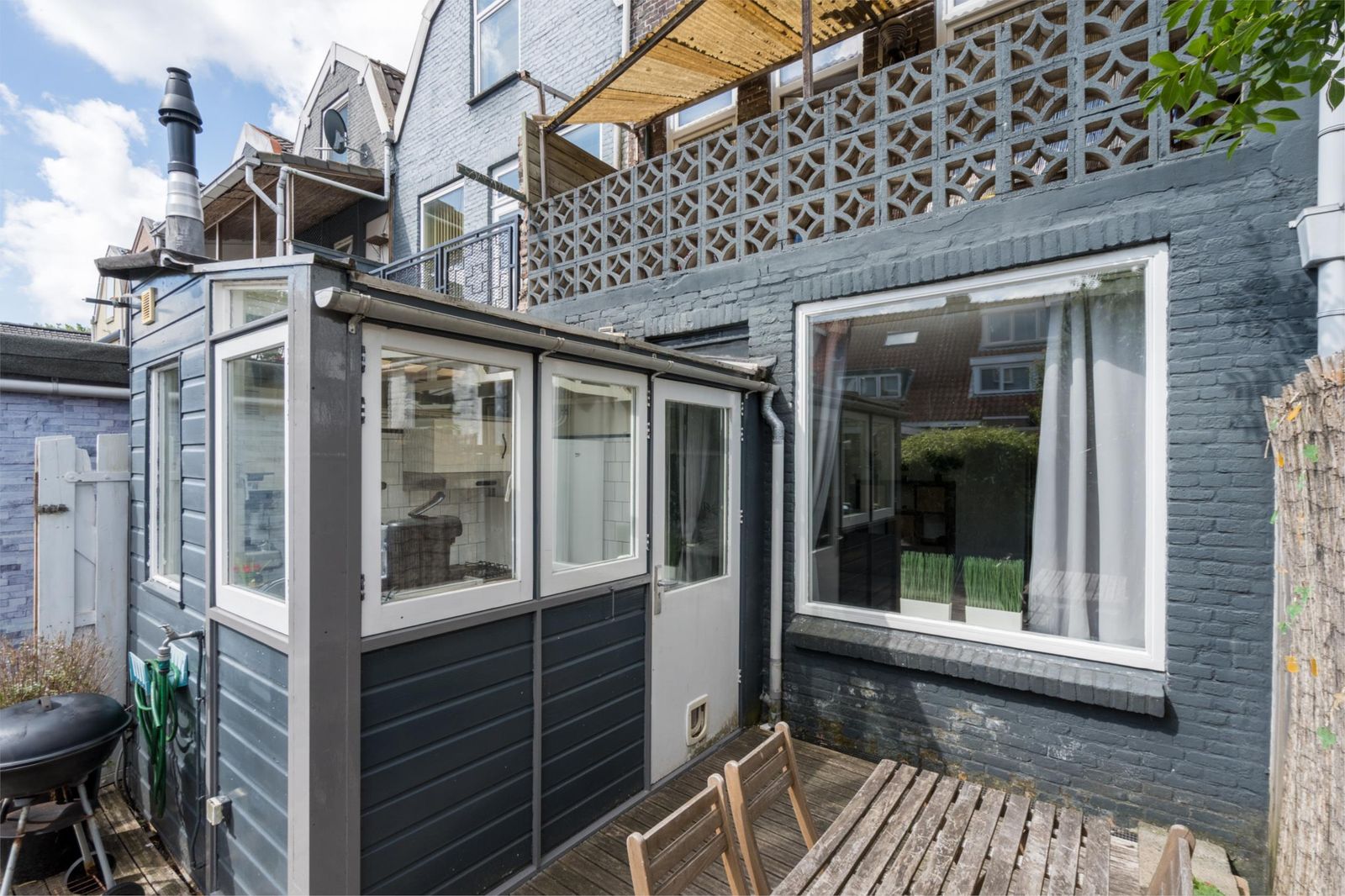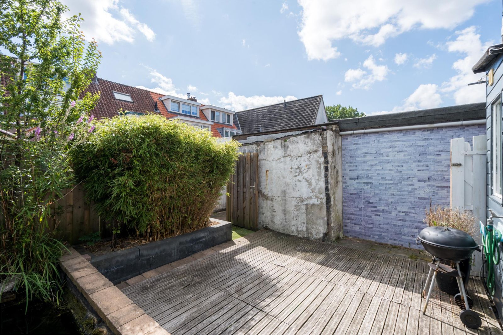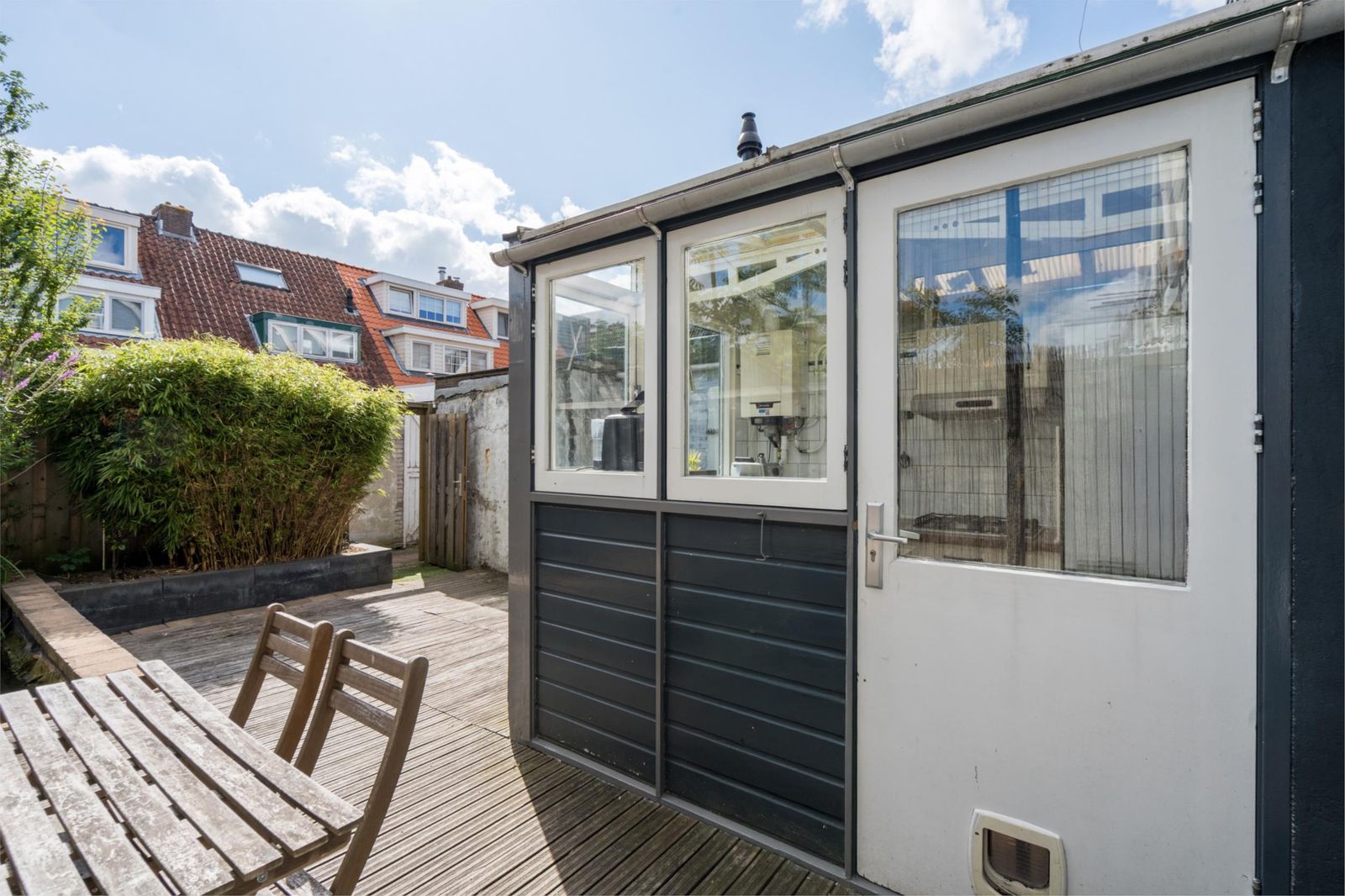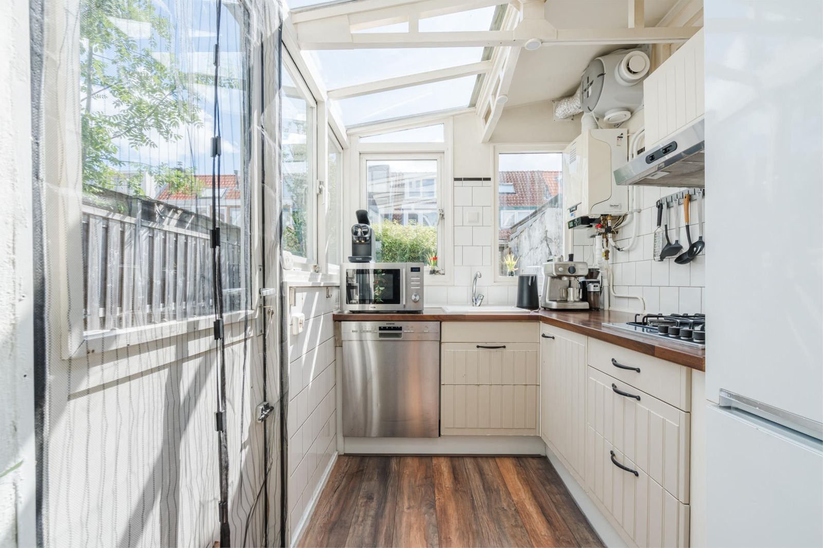 gaskookplaat met recirculatiekap. Via de achterdeur kom je in de gezellige tuin (28m2). De