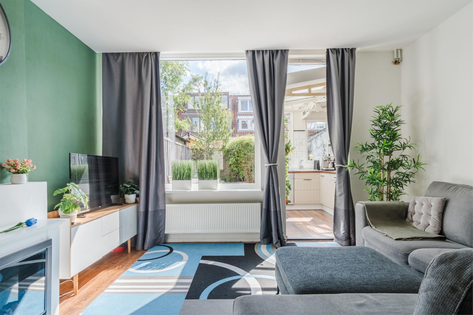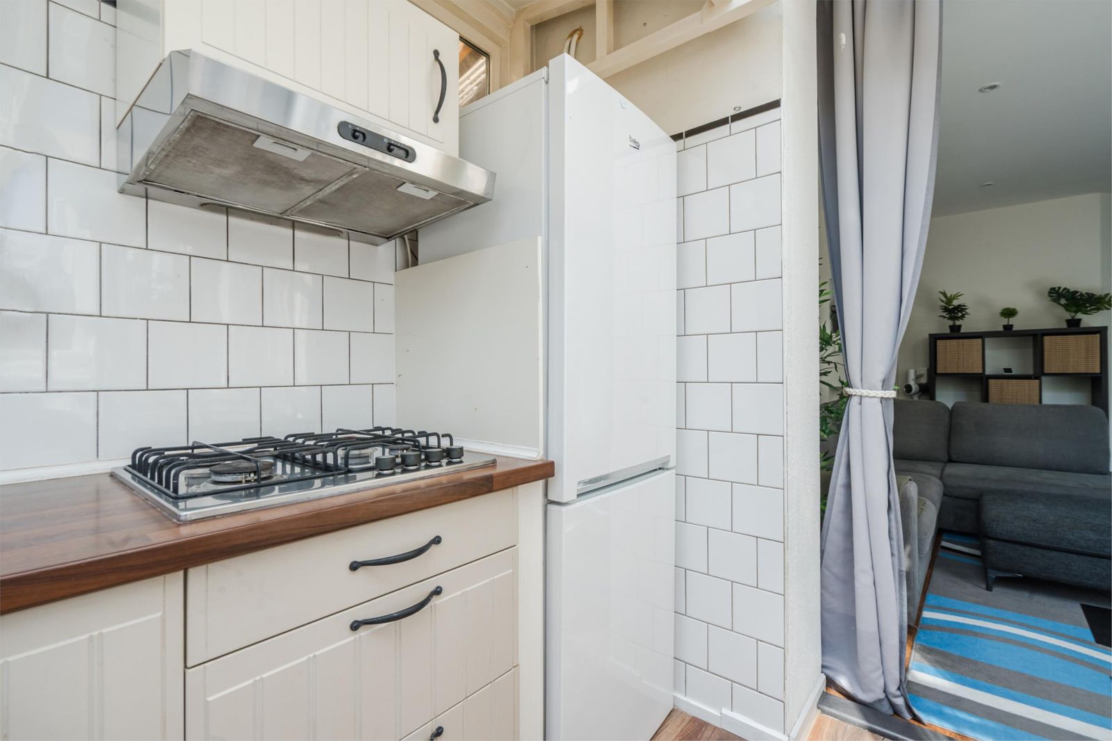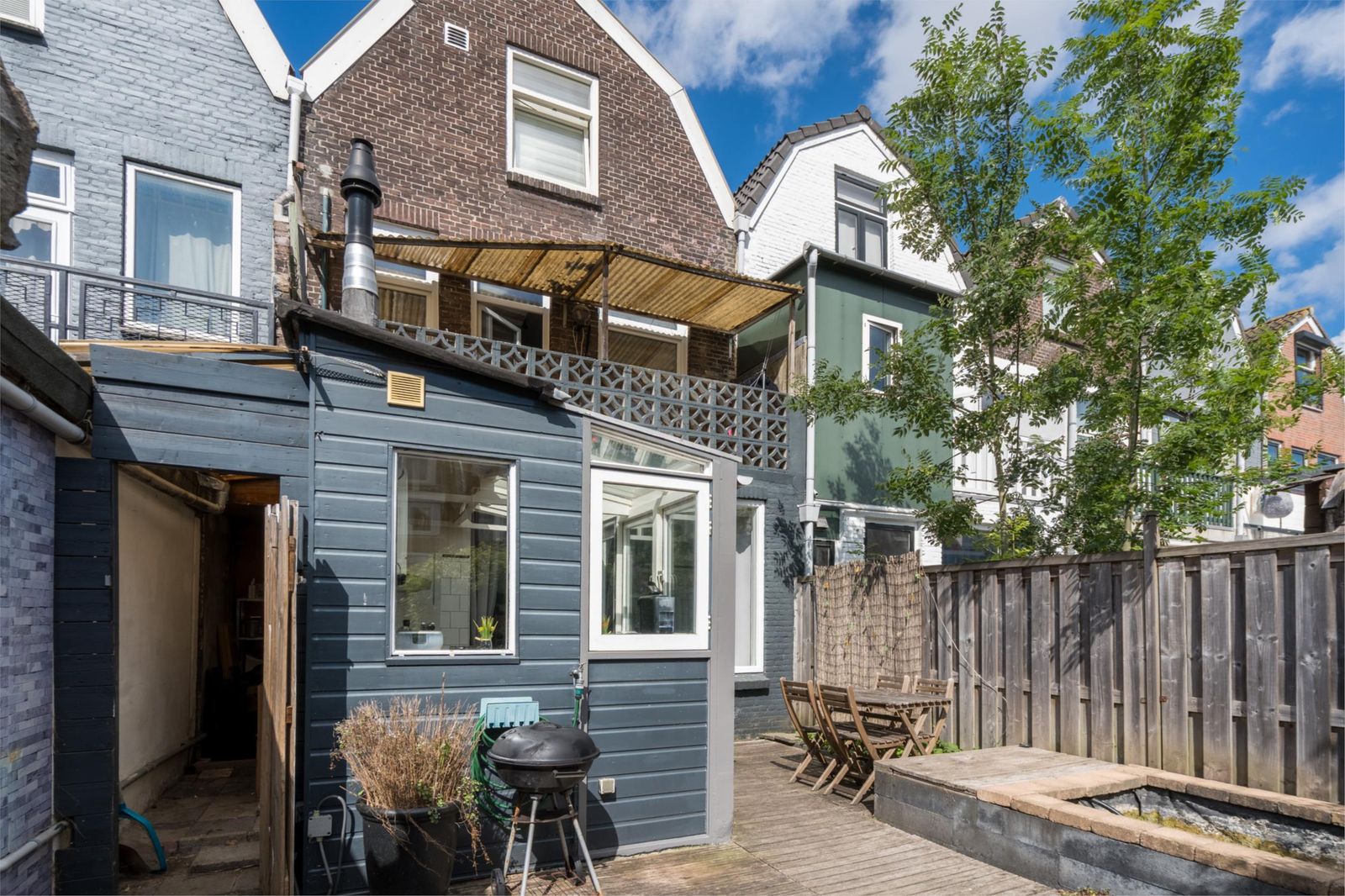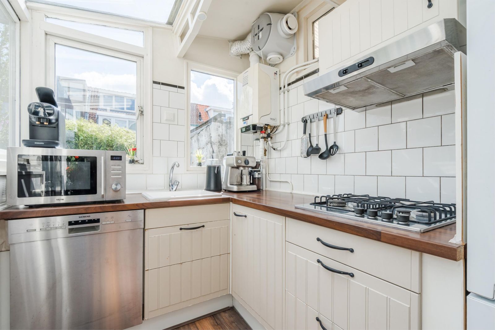 gaskookplaat met recirculatiekap. Via de achterdeur kom je in de gezellige tuin (28m2). De