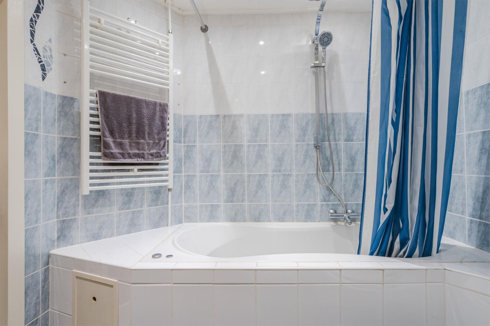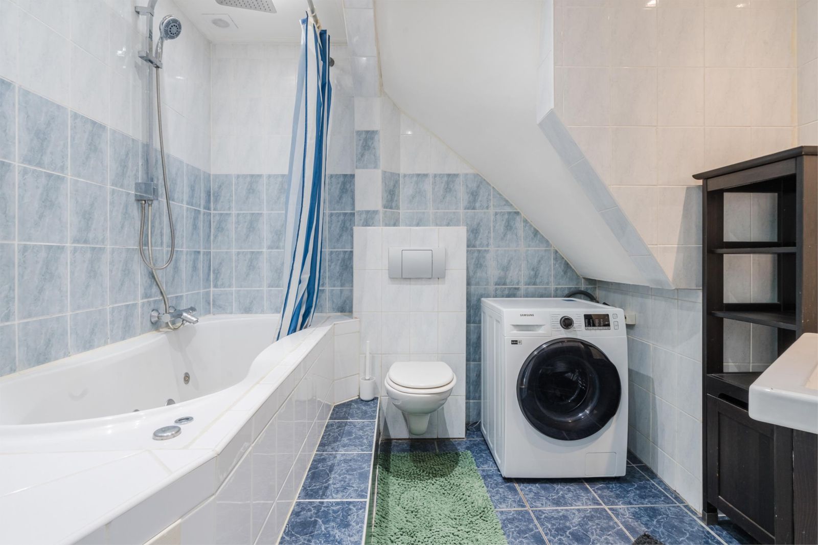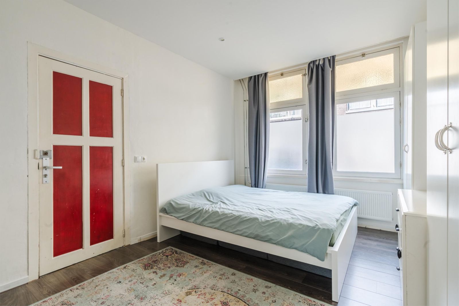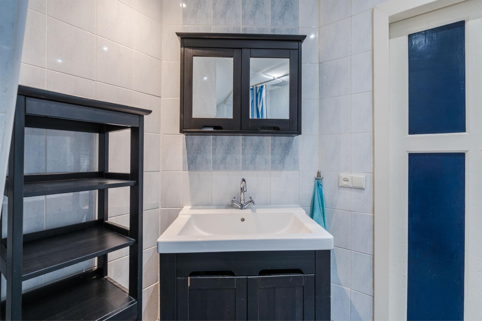 Via de gedeelde entree kom je in de woning aan. Als eerste betreed je de slaapkamer. Deze is gelegen aan de voorzijde, ruim door de half-open indeling en voorzien van een nette laminaatvloer en een riante kledingkast. De tussengelegen badkamer (2009) is het enige afgesloten vertrek. Hier vind je een verhoogd ligbad en een stortdouche, het toilet, de wasmachine aansluiting en een nette wastafel met bergmeubel.