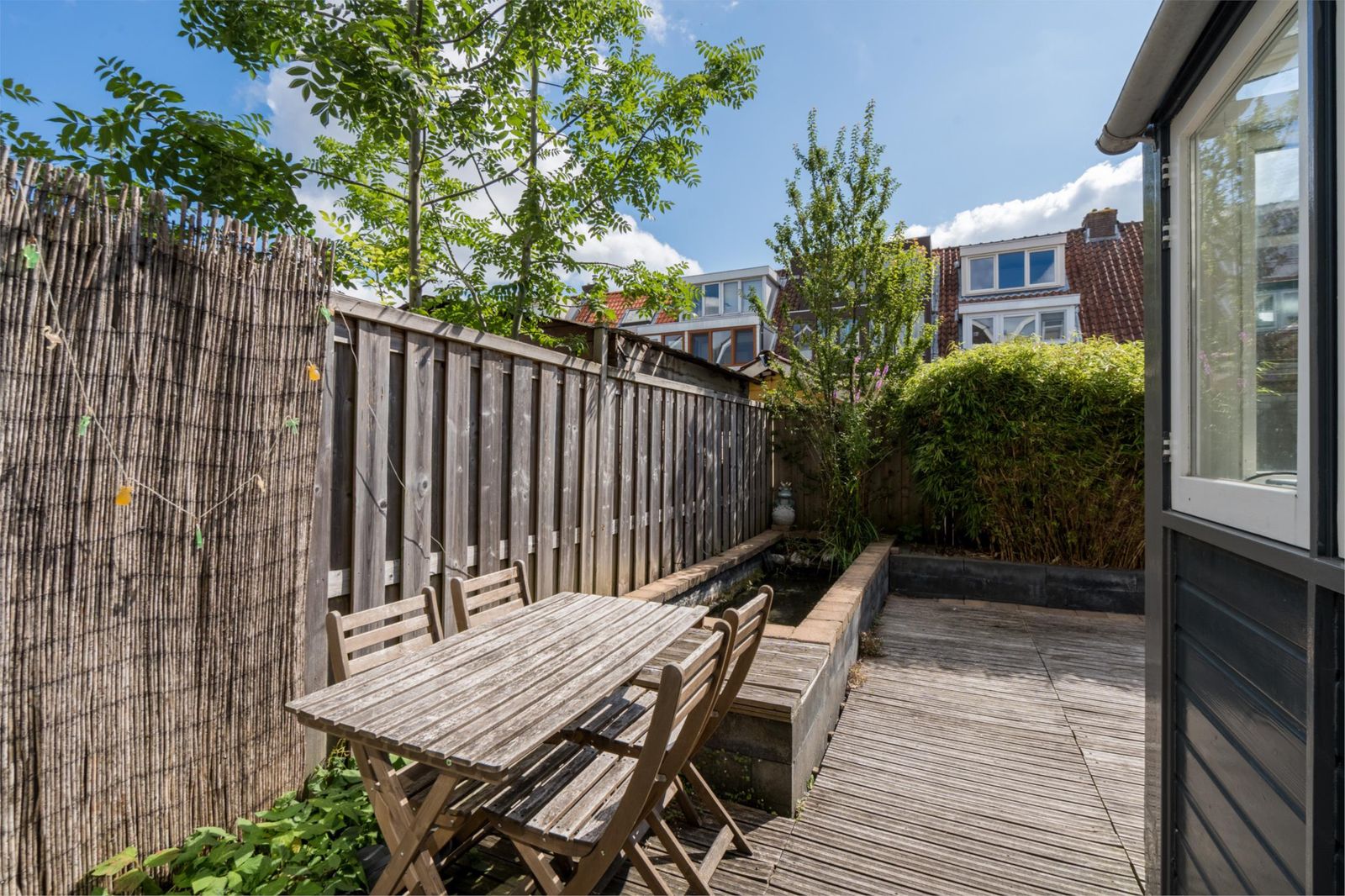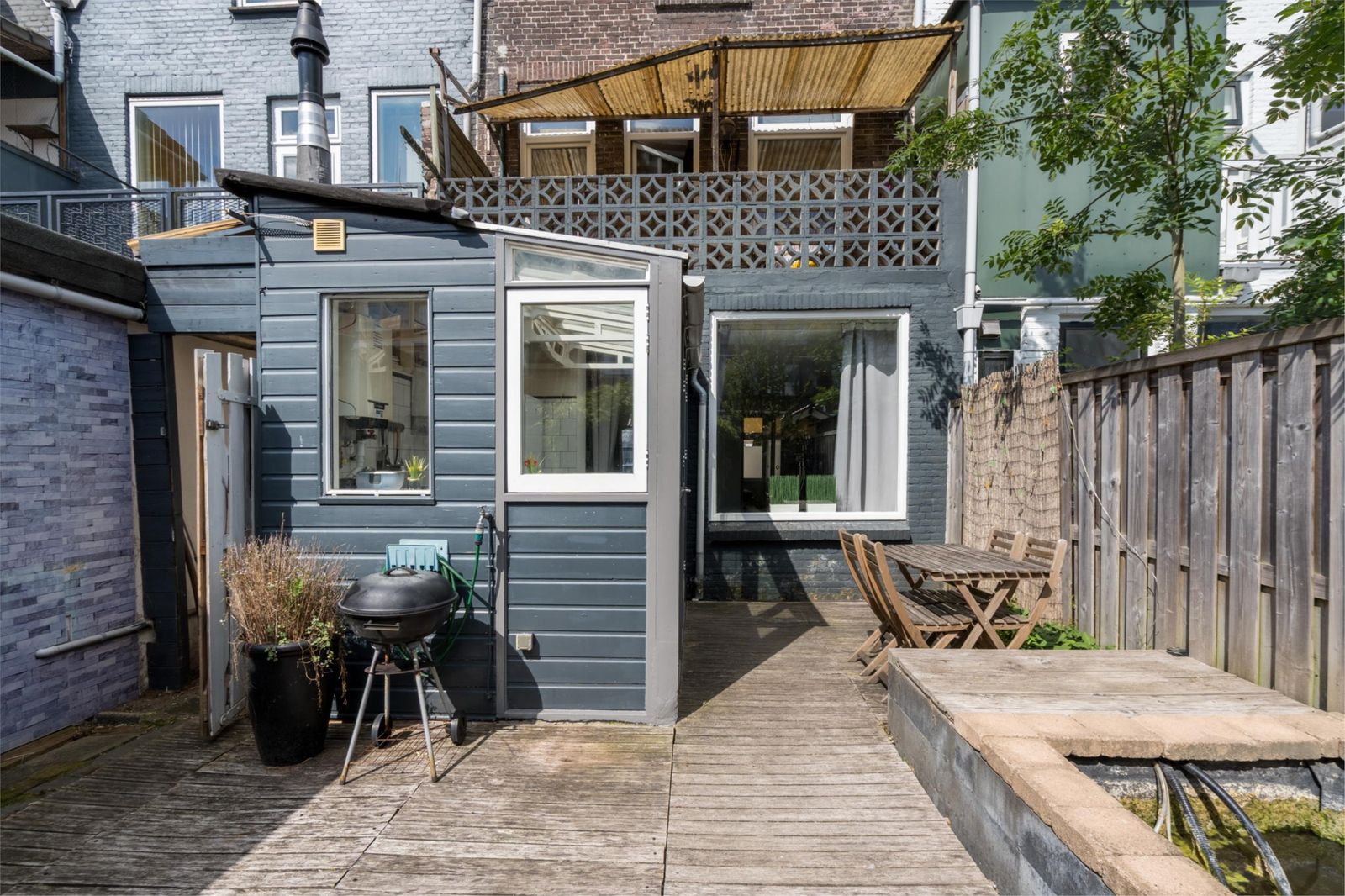 ligging is op het oosten en de aanleg is in 2018 gerealiseerd: onderhoudsvriendelijk met houten vlonderplanken, een vijverpartij, een schuur en een achterom.