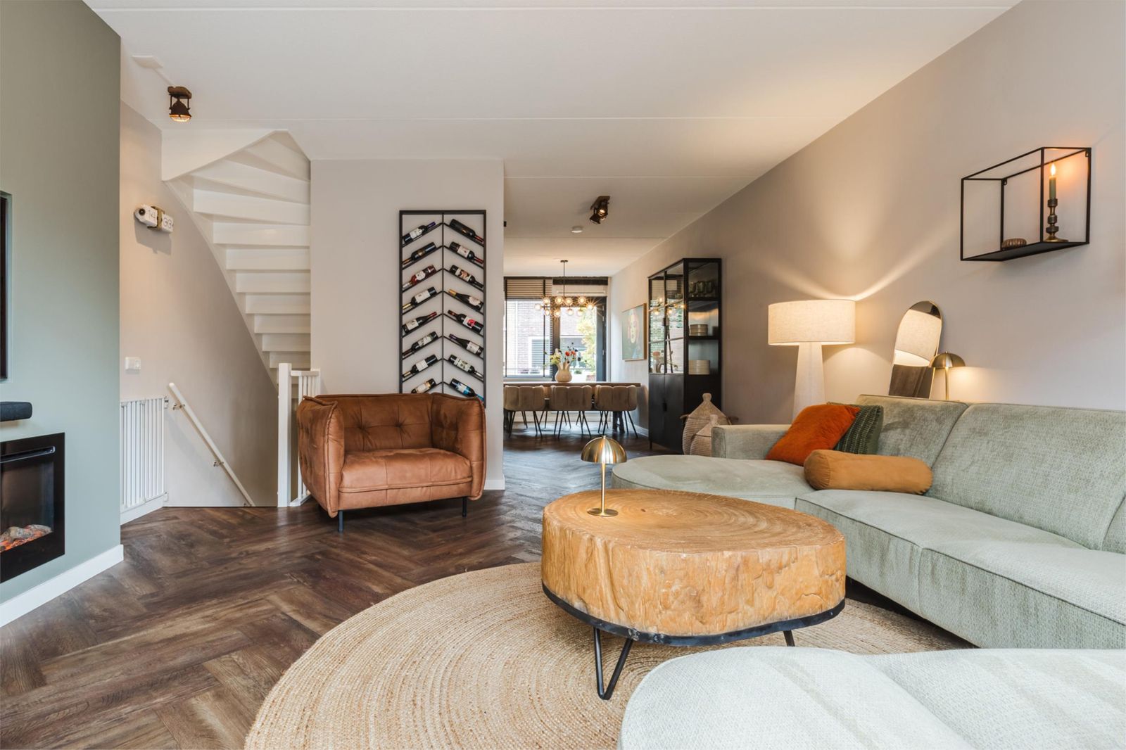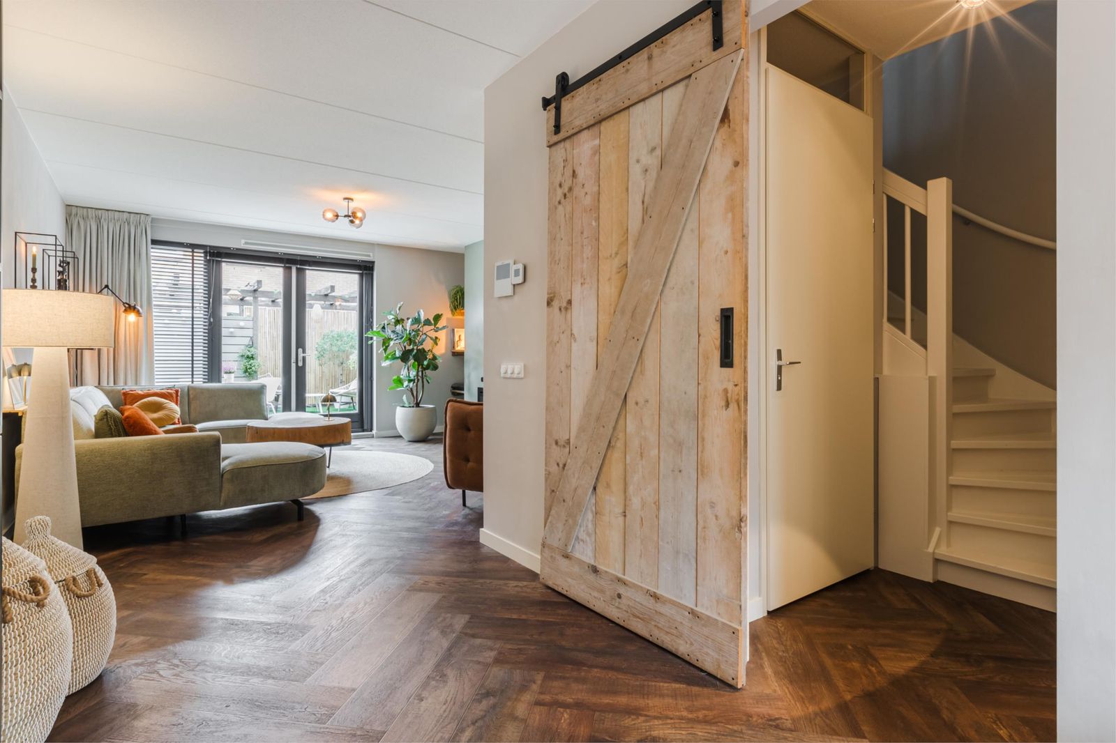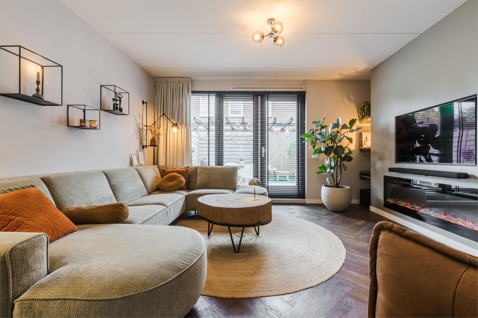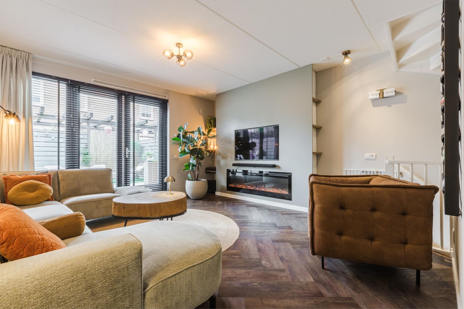Via een zogenaamde luie trap kom je in de sfeervolle riante living met grote raampartijen. Een echte eyecatcher in de woning is de cinewall met sfeerhaard. Via de openslaande deuren kom je op het zonnige terras gelegen op het zuid/westen. Een zonnescherm en hordeur (2024) zorgen voor nog meer comfort.