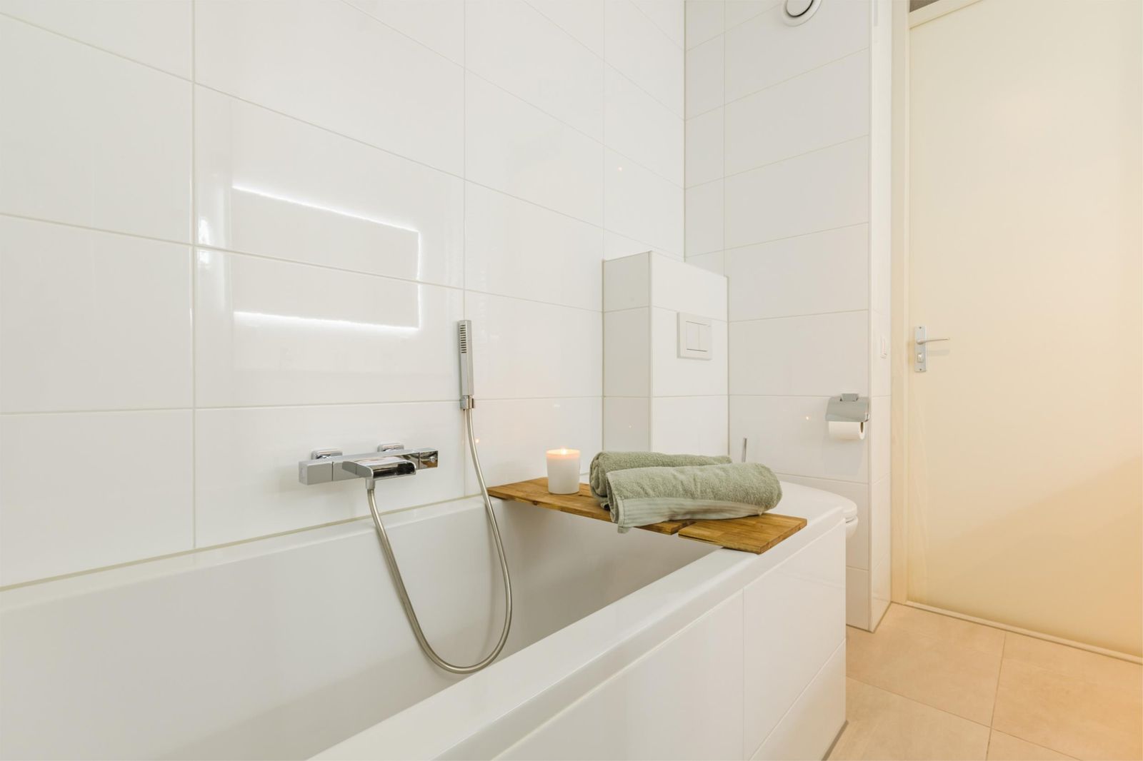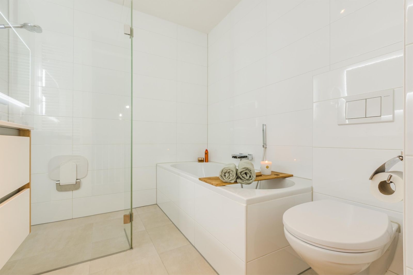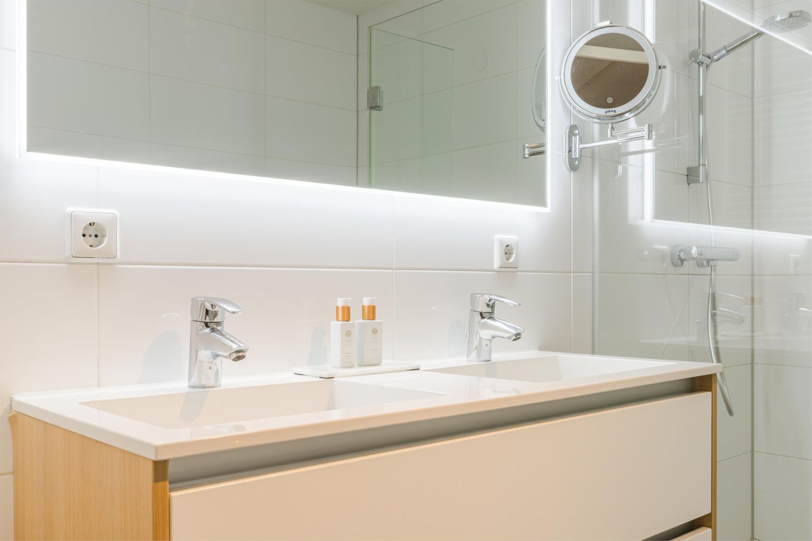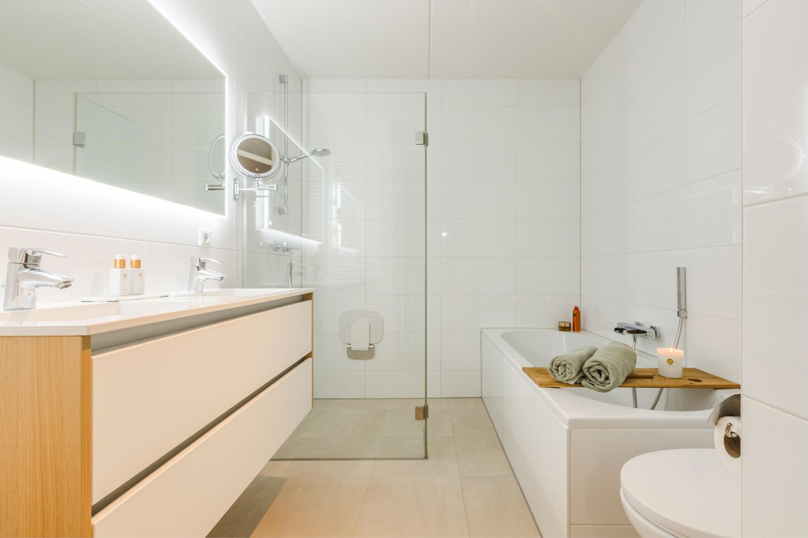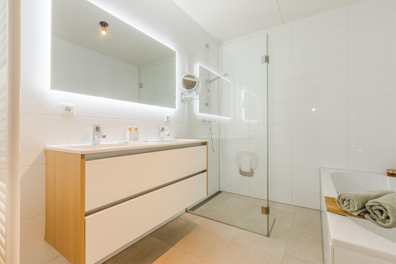 De goed bemeten badkamer biedt alle comfort zoals een inloopdouche, ligbad, dubbele wastafel, 2e toilet en designradiator.