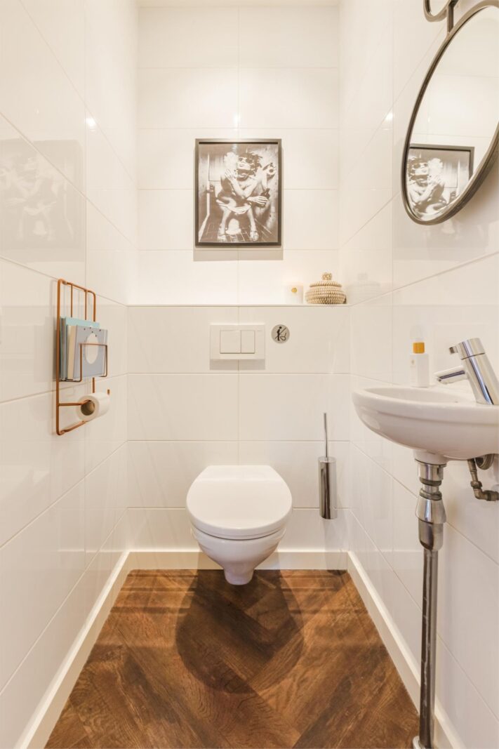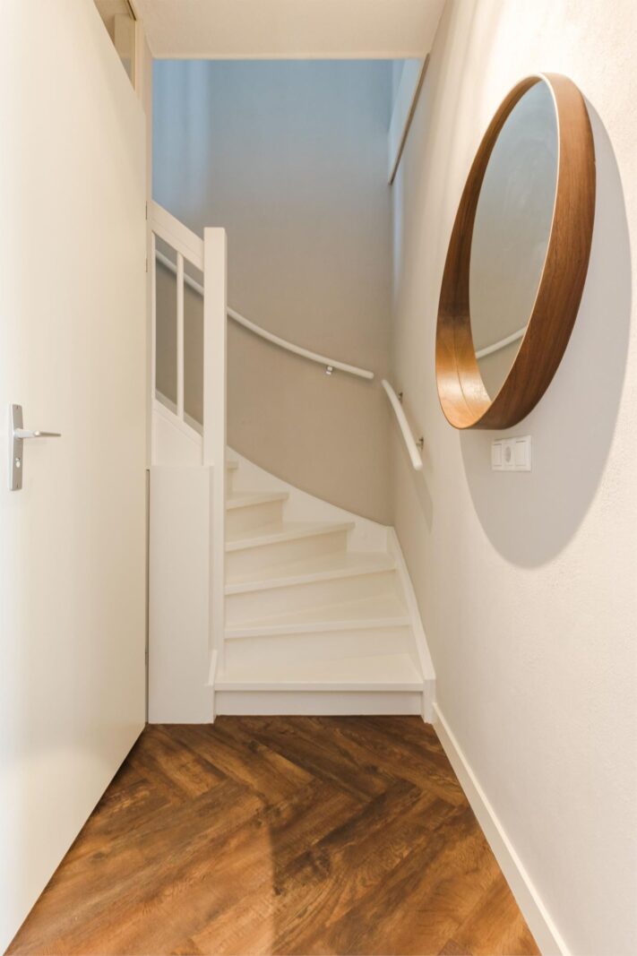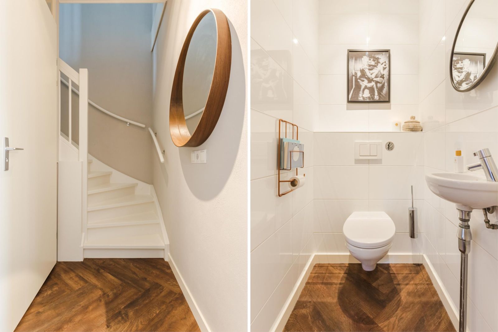 Via de schuifdeur is er toegang tot een tussenhal met toiletruimte met wandcloset en de trapopgang naar de 2de verdieping.