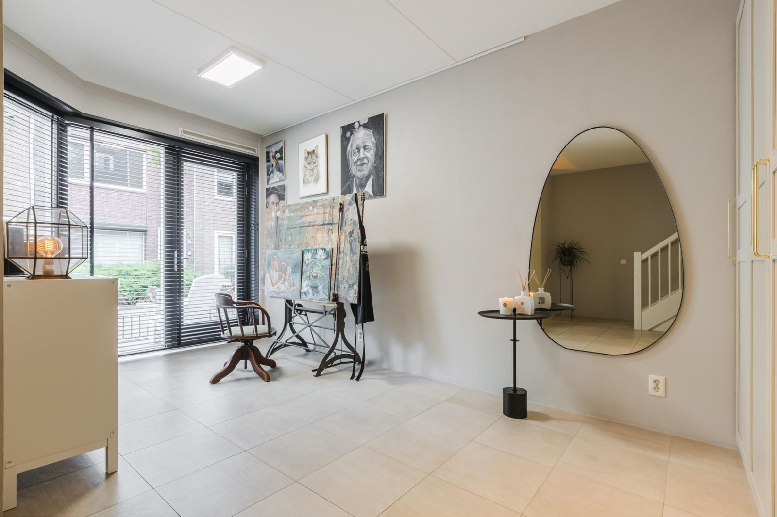 Entree/ hal met meterkastopstelling en garderobe. Naast de hal bevindt zich een veelzijdige ruimte met eigen entree. Uitstekend geschikt als praktijkruimte, comfortabele thuiswerkplek of atelier.