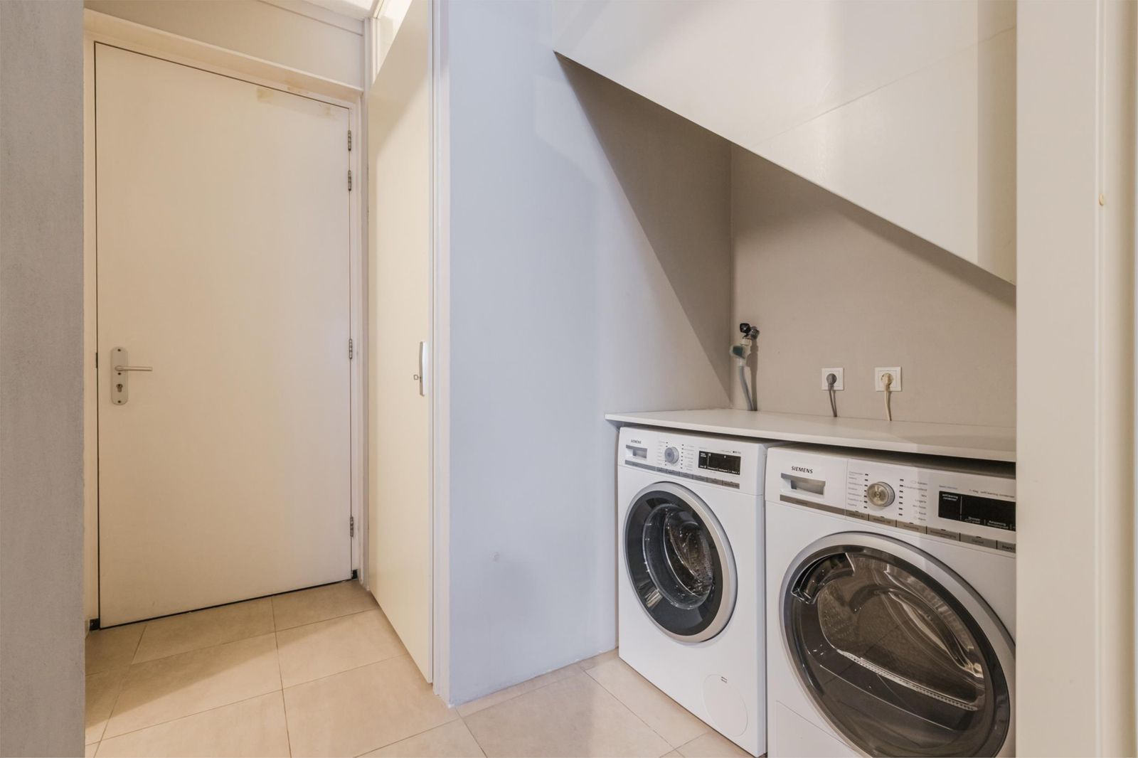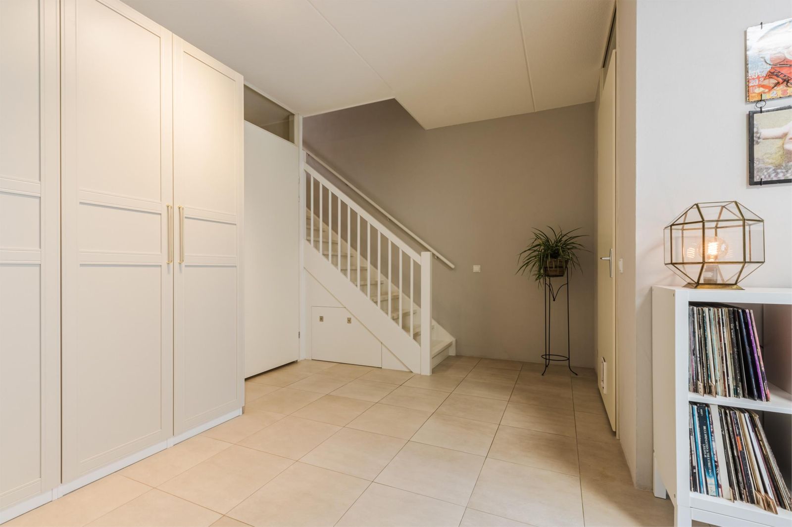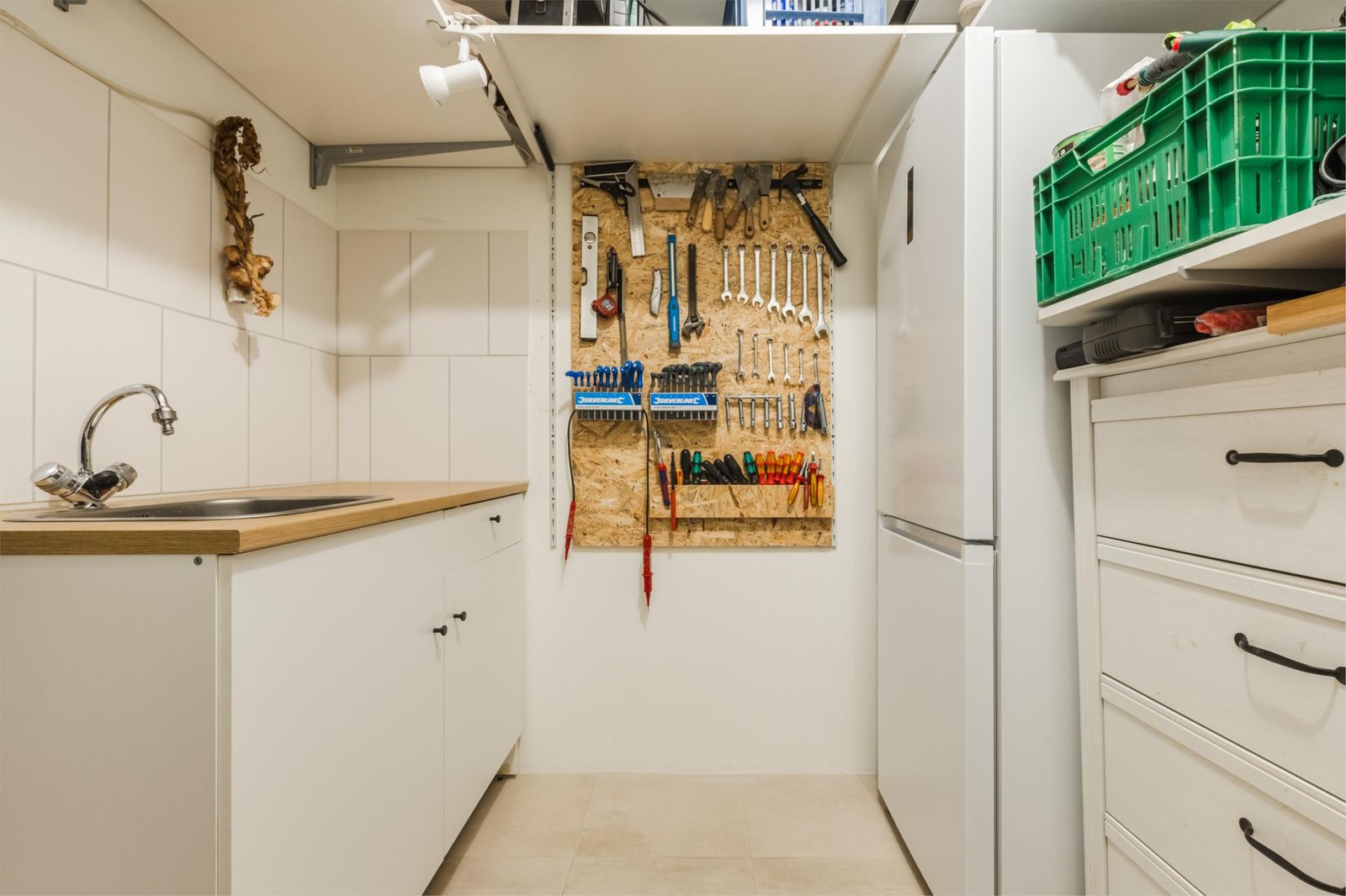 Tussenhal met opstelling voor het witgoed, grote opberg/voorraadkast en een inpandige berging/bijkeuken met watervoorziening.
