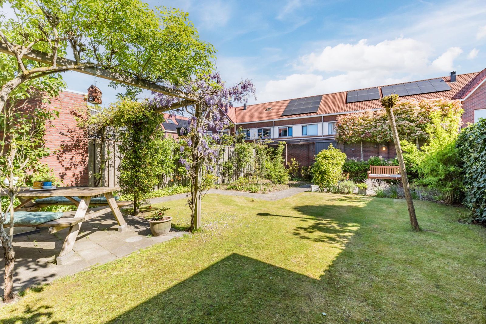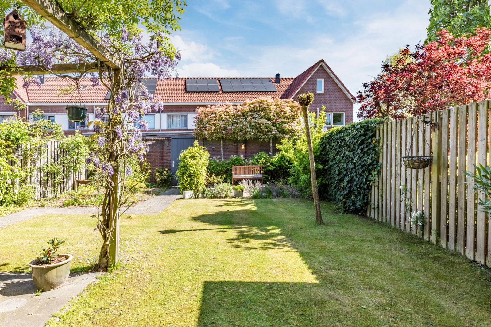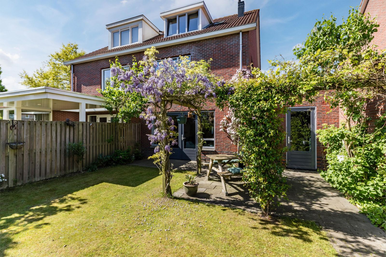 De tuin is mooi aangelegd met twee terrassen en een uitgang naar de brandgang. Er is echt gras, en in de tuin staan diverse fruitbomen. Het groen zorgt ervoor dat je lekker vrij in de tuin kan zitten. De tuin is voorzien van extra drainage en een waterpunt. Via de tuin of via de oprit kom kom je bij de garage, die lekker ruim is.  Ook de garage heeft een eigen wateraansluiting.