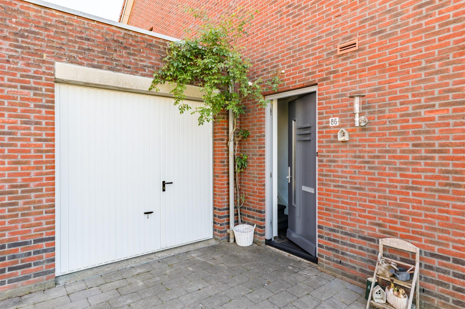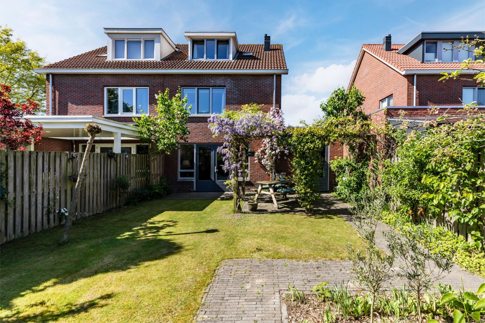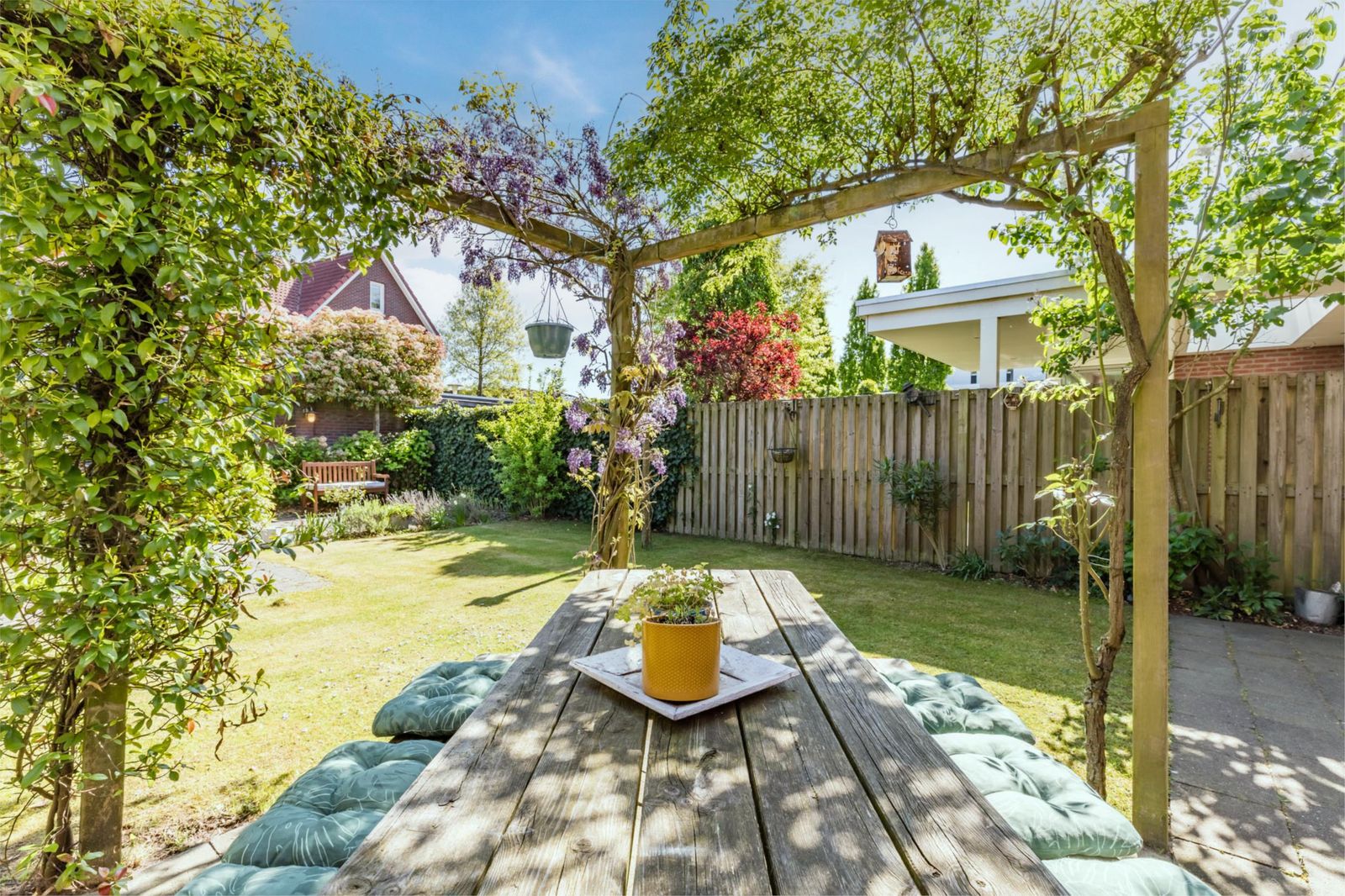 De tuin is mooi aangelegd met twee terrassen en een uitgang naar de brandgang. Er is echt gras, en in de tuin staan diverse fruitbomen. Het groen zorgt ervoor dat je lekker vrij in de tuin kan zitten. De tuin is voorzien van extra drainage en een waterpunt. Via de tuin of via de oprit kom kom je bij de garage, die lekker ruim is.  Ook de garage heeft een eigen wateraansluiting.