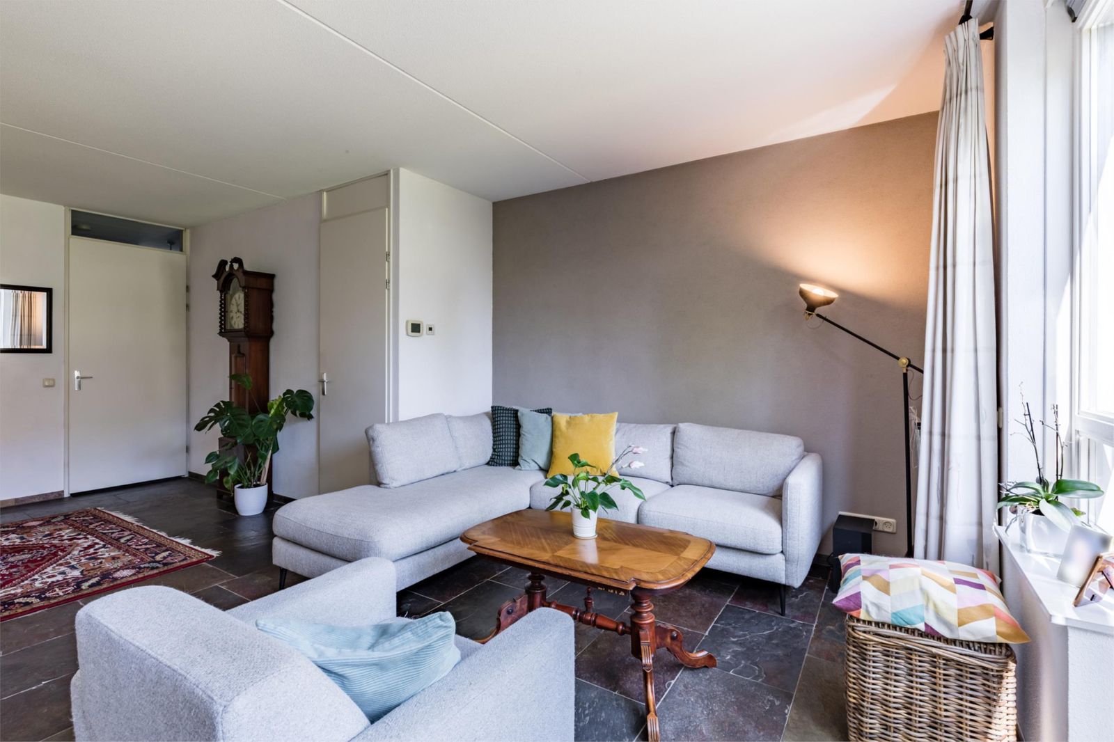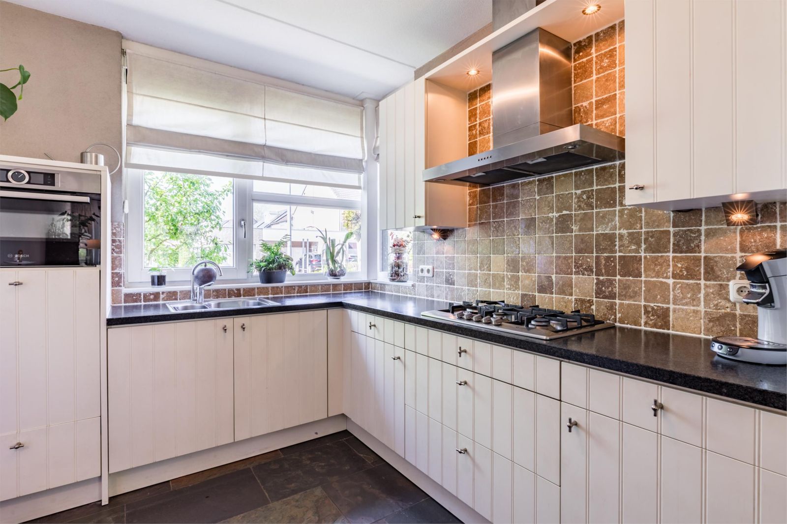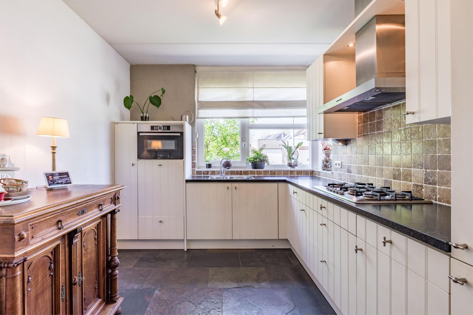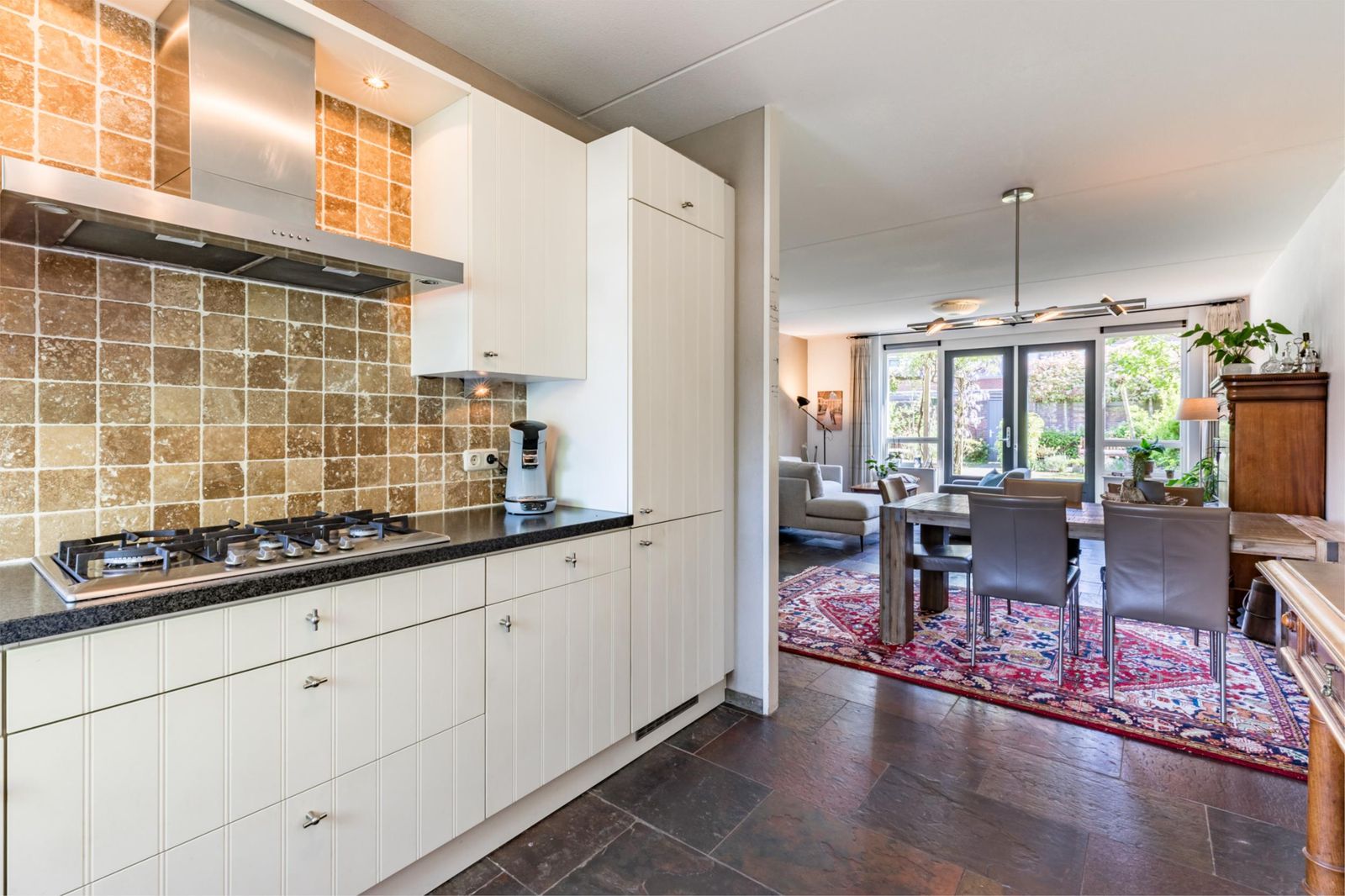 Als je binnenkomt, zie je meteen de mooie donkere leistenen vloer met vloerverwarming die doorloopt in de woonkamer en de keuken. De woonkamer oogt lekker licht dankzij de grote tuindeuren. Er is ook een handige trapkast. De keuken is echt een plaatje, met een granieten werkblad en allerlei luxe apparatuur zoals een een combi-oven, vaatwasser en diepvries.