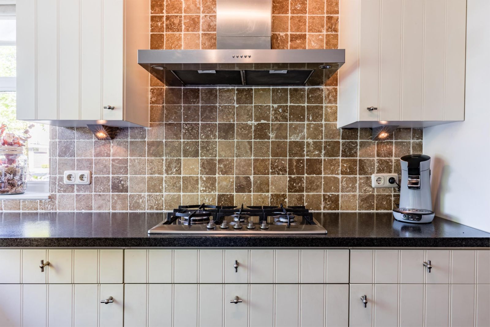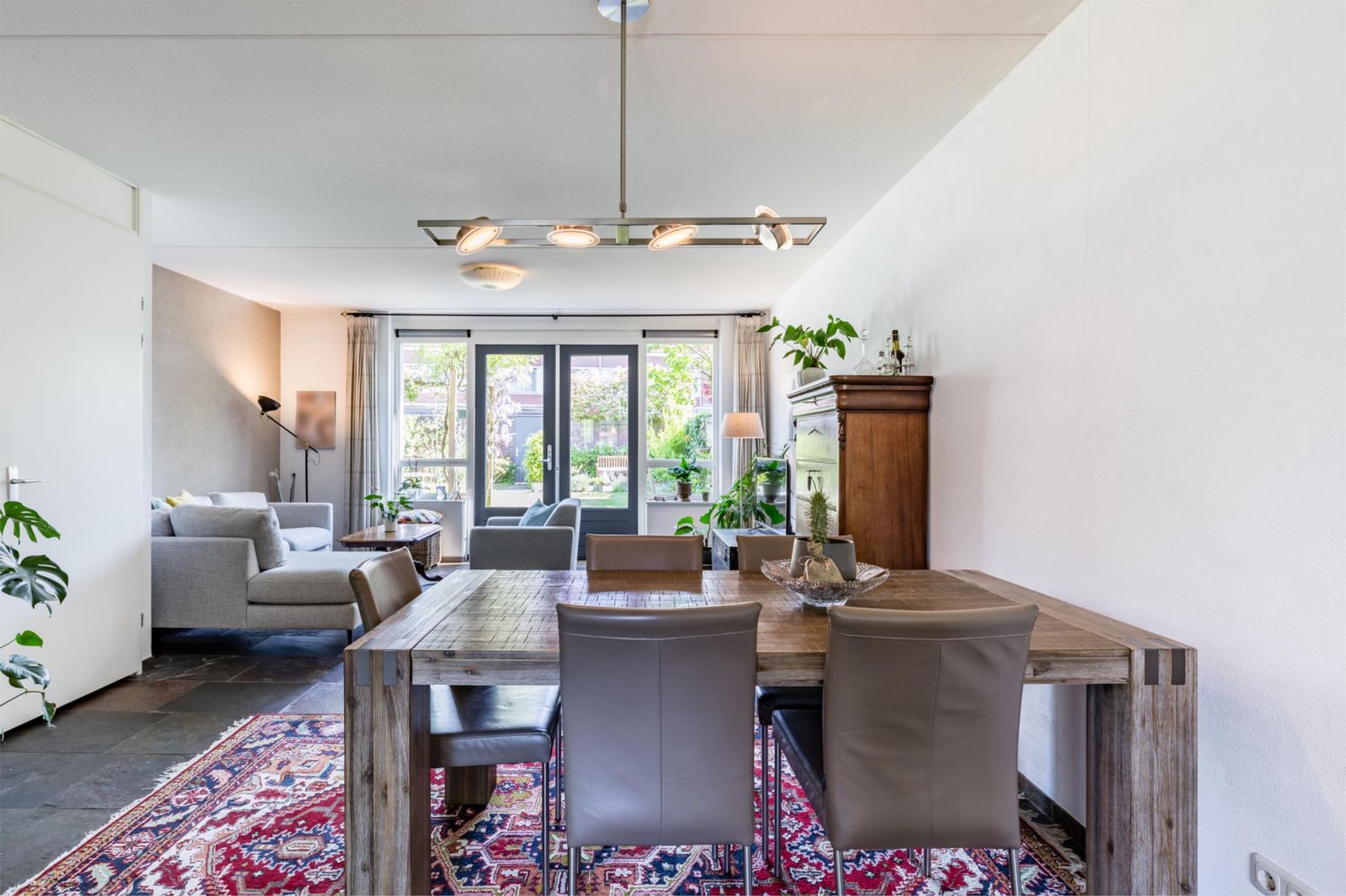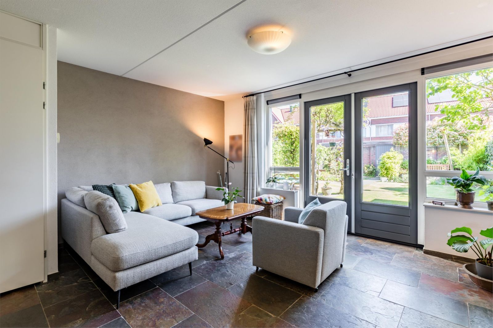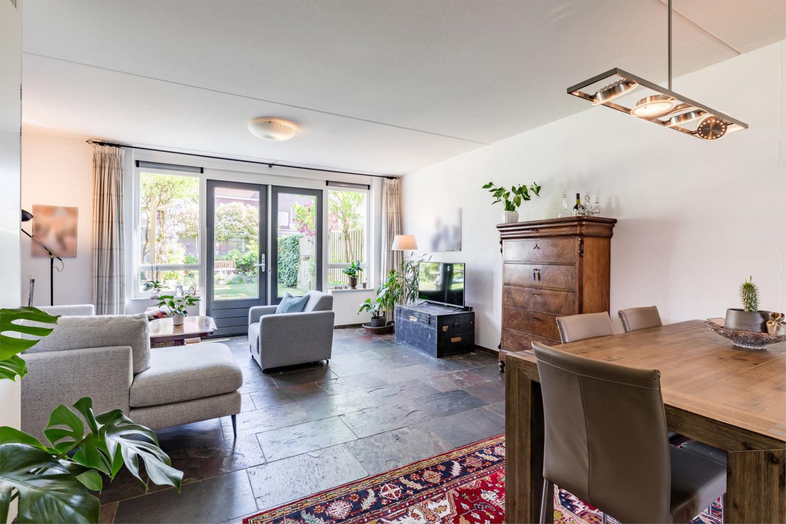 Als je binnenkomt, zie je meteen de mooie donkere leistenen vloer met vloerverwarming die doorloopt in de woonkamer en de keuken. De woonkamer oogt lekker licht dankzij de grote tuindeuren. Er is ook een handige trapkast. De keuken is echt een plaatje, met een granieten werkblad en allerlei luxe apparatuur zoals een een combi-oven, vaatwasser en diepvries.