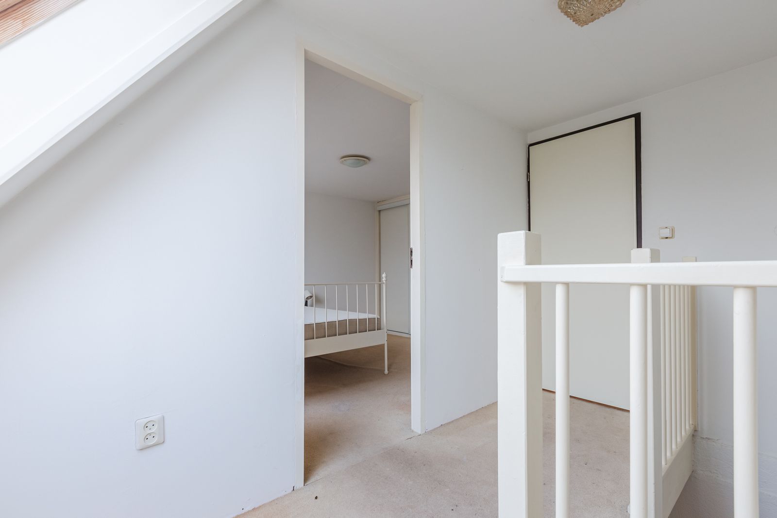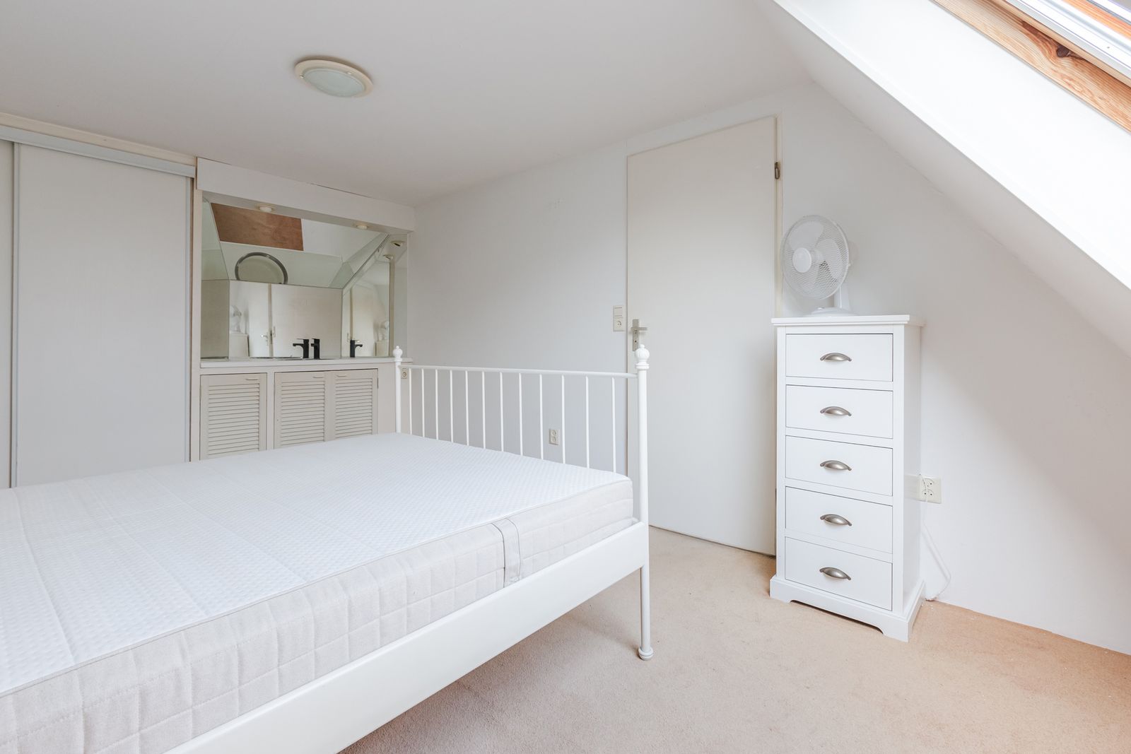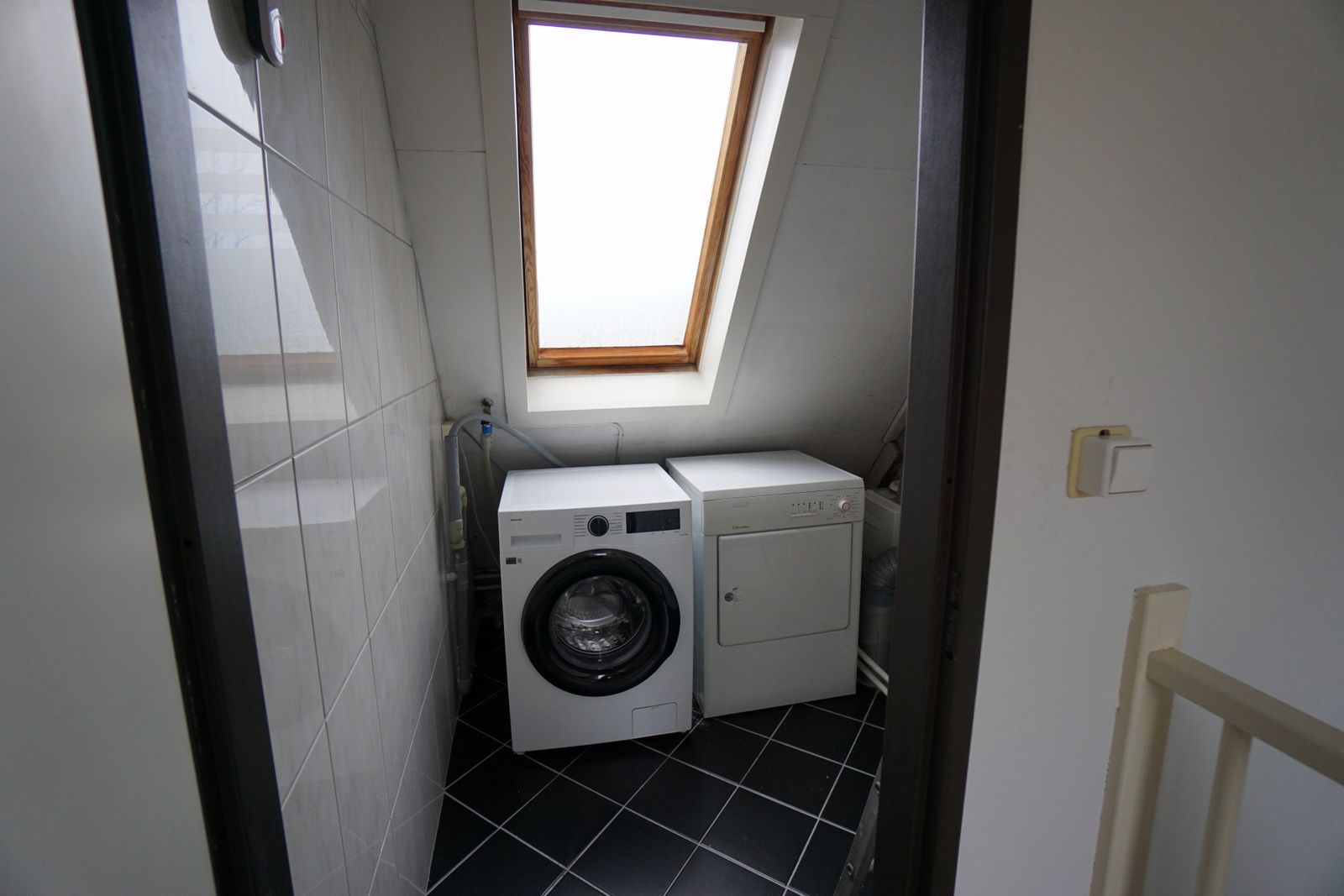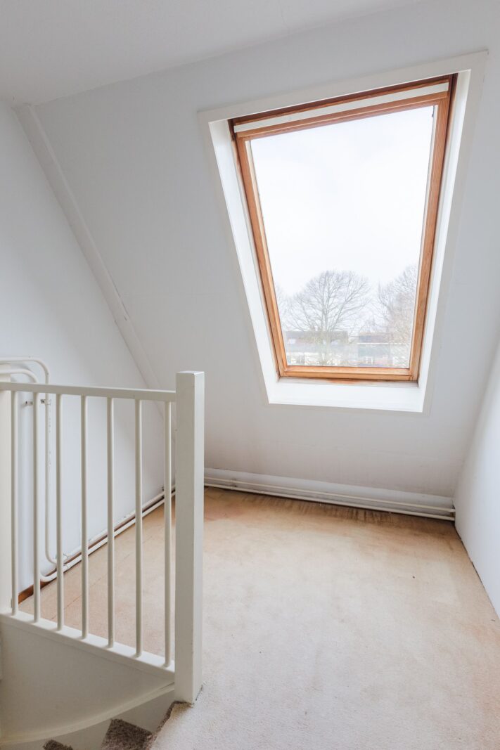 Op de tweede verdieping geeft de overloop toegang tot de derde slaapkamer, met een wastafel en Veluxraam, ideaal voor gasten of zelfstandige kinderen. Ook is hier de betegelde wasruimte met de Intergas cv-installatie (2014) en de toegang tot de opslagruimte onder de nok van het dak.