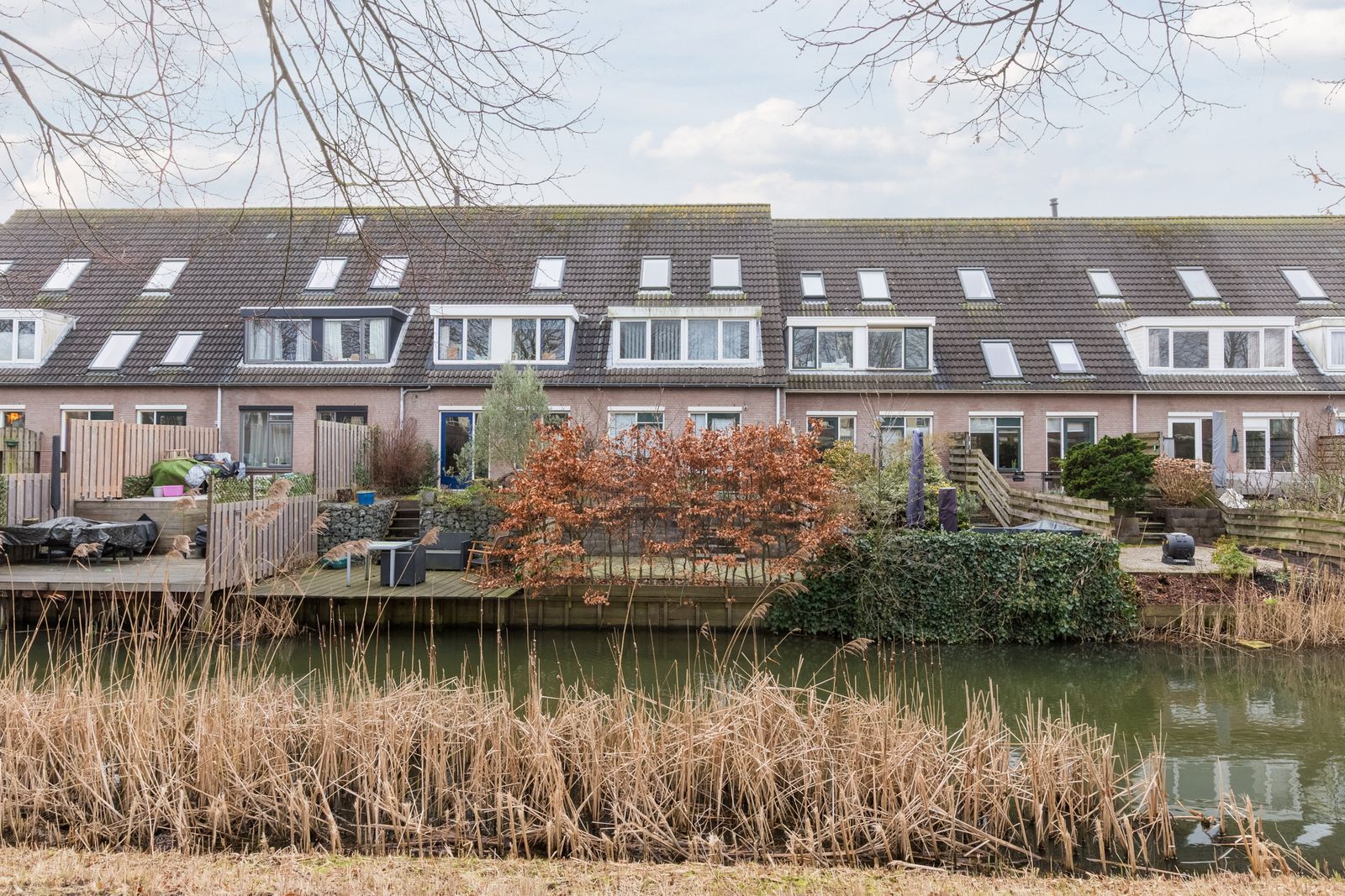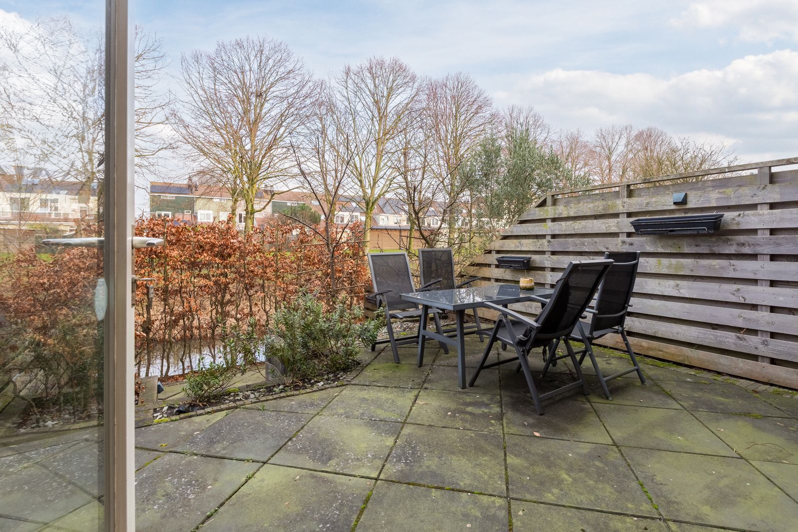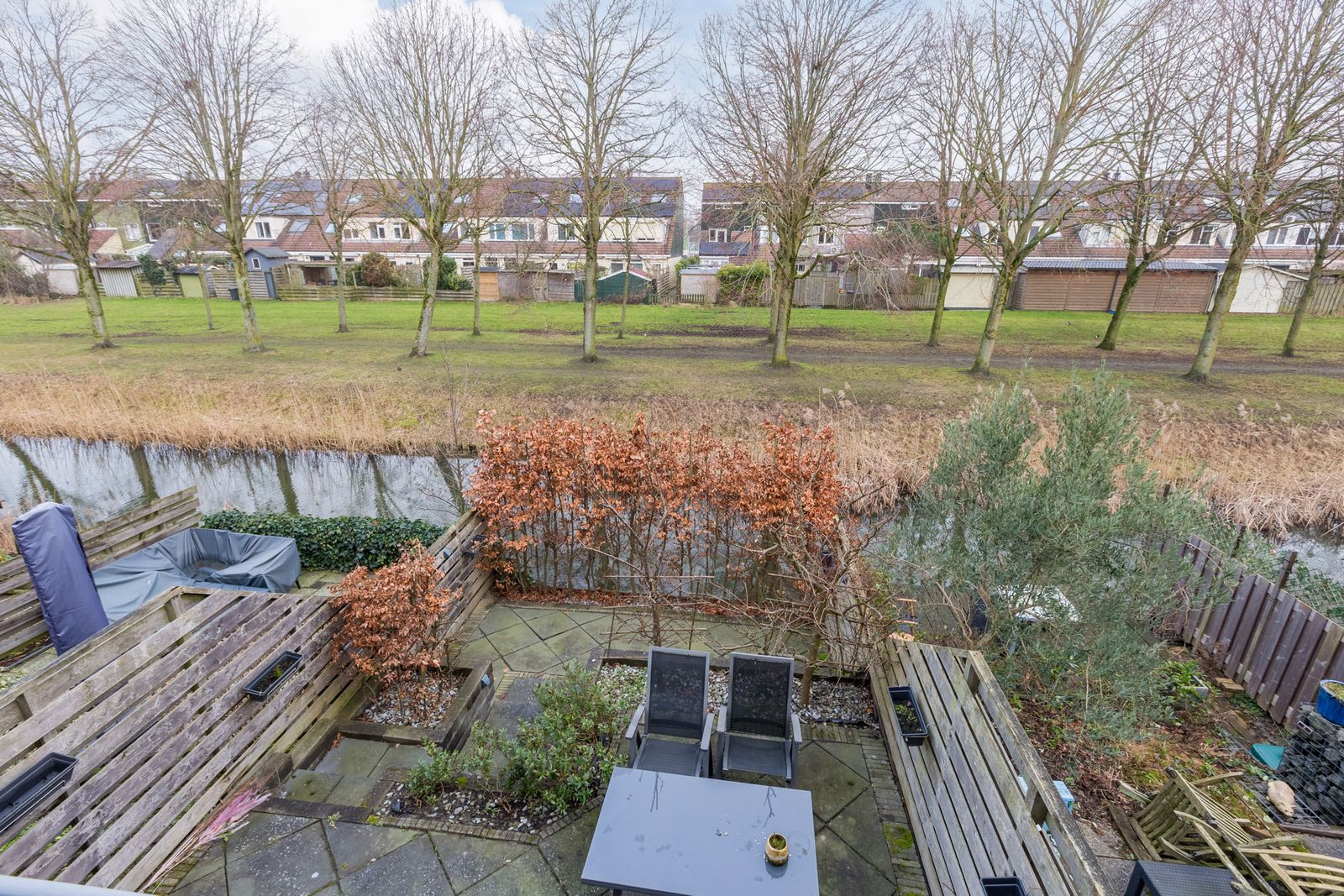 The deep, architect-designed, terraced back garden faces northeast and is low-maintenance. At the rear, a waterway and a grassy area with trees provide a high level of privacy. It is a pleasant space to enjoy both sun and shade and to relax in a peaceful setting.