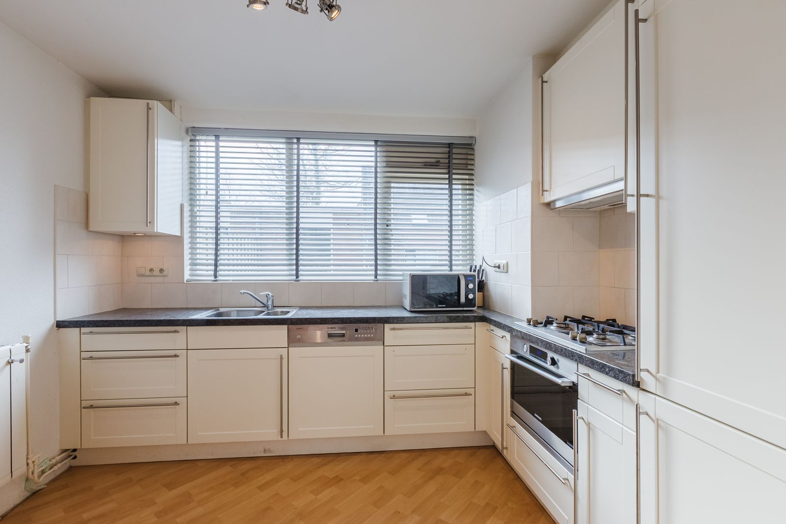 Op de begane grond is de hal met meterkast en een modern uitgevoerd toilet in luxe afwerking. Vanuit de hal bereikt u de ruime lichte woonkamer met een trapkast en deur naar de achtertuin. De crèmekleurige open keuken is in een hoekopstelling aan de voorzijde geplaatst en voorzien van een zwart granieten aanrechtblad, vaatwasser, oven met gasfornuis en een koel-/vriescombinatie.