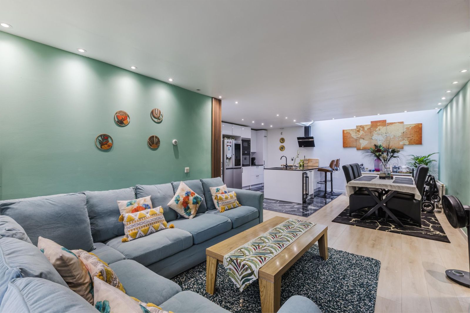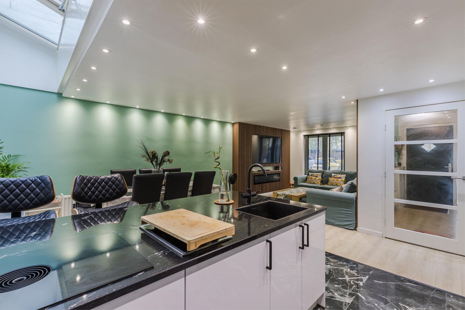 The open-plan kitchen (completely renovated in 2022) is a true highlight – equipped with a dishwasher, American fridge, wine cooler, built-in oven, and microwave. From here, you can access the sunny south-facing terrace – perfect for relaxing or entertaining – with a direct view of the children’s play park behind the house.