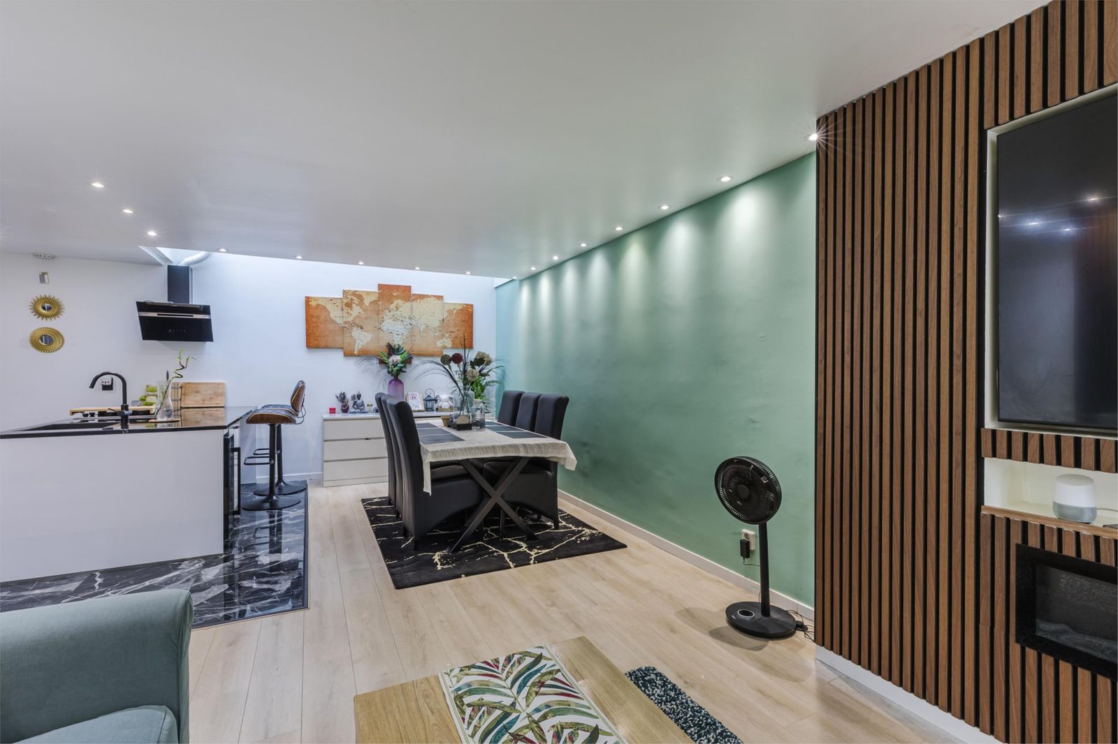 Entrance hall with renovated toilet (2024) and access to the bright and spacious living room featuring modern flooring, a sleek TV wall unit with a 75” flat-screen TV (included), and large windows allowing for plenty of natural light.