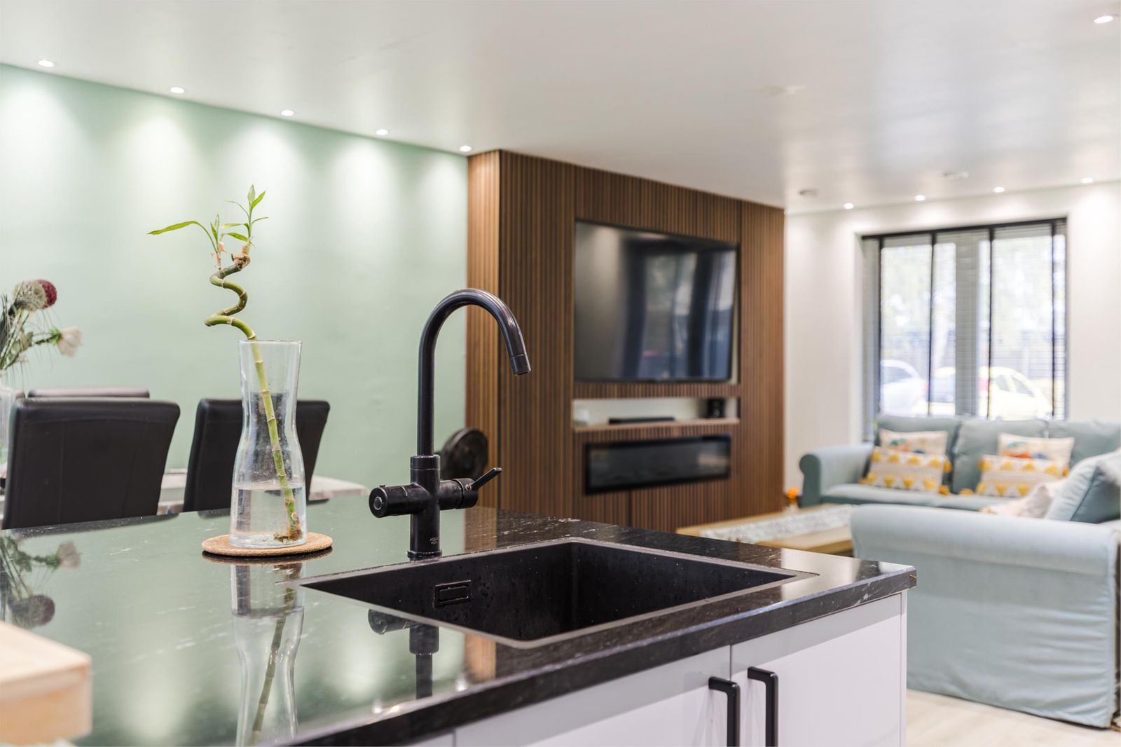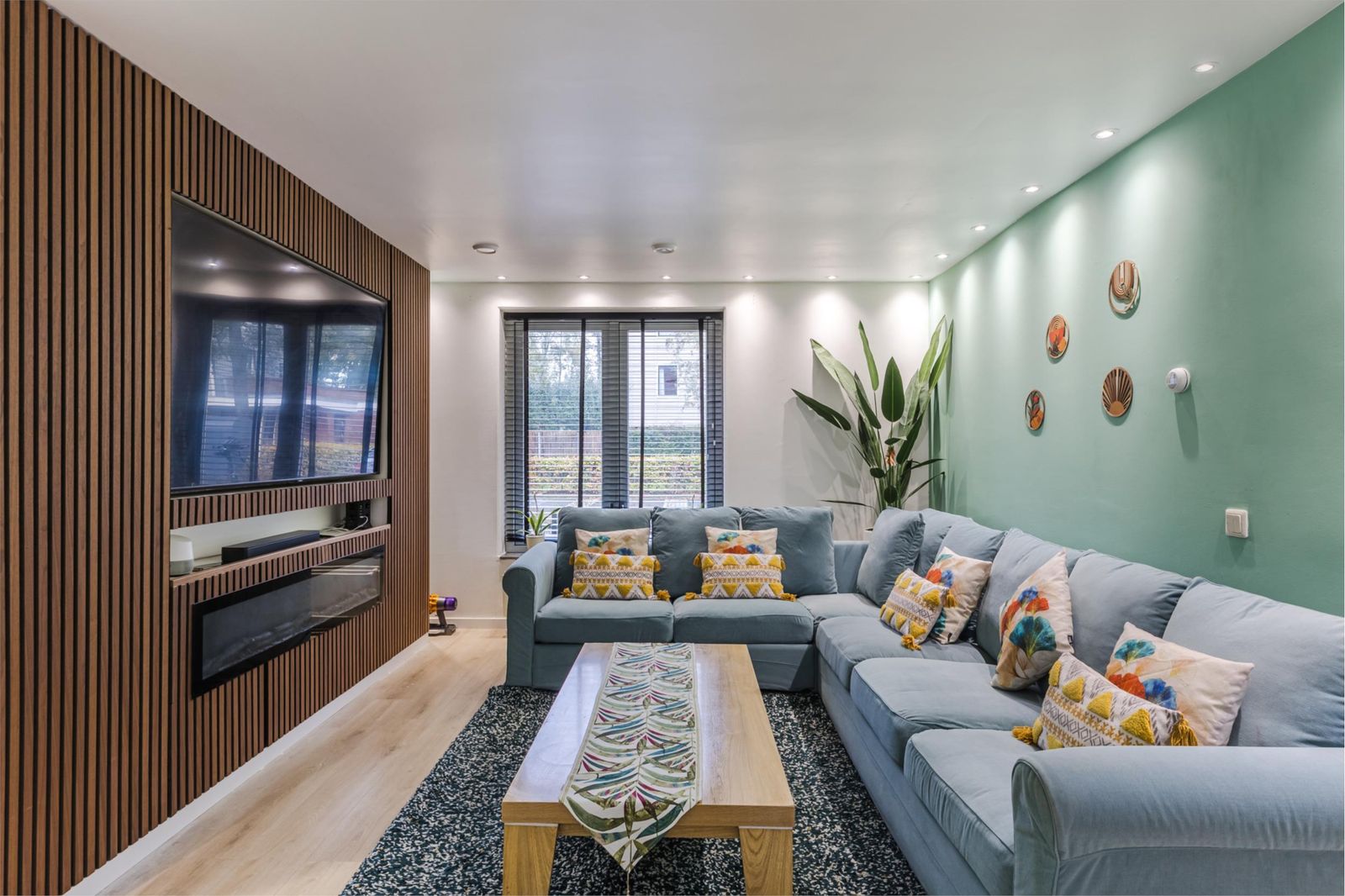 - Inclusief: 75-inch TV, ingebouwde TV-wand en alle raamdecoratie