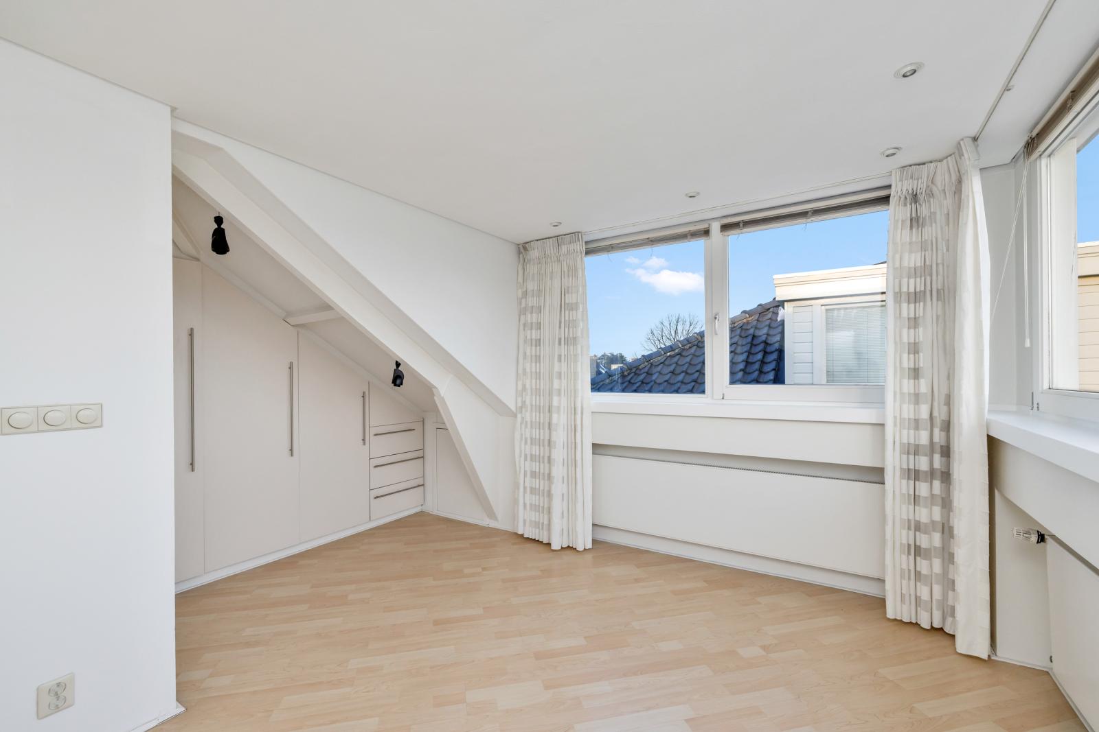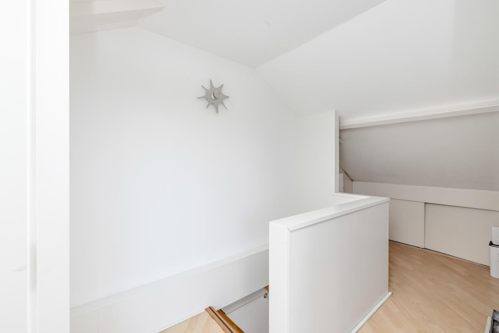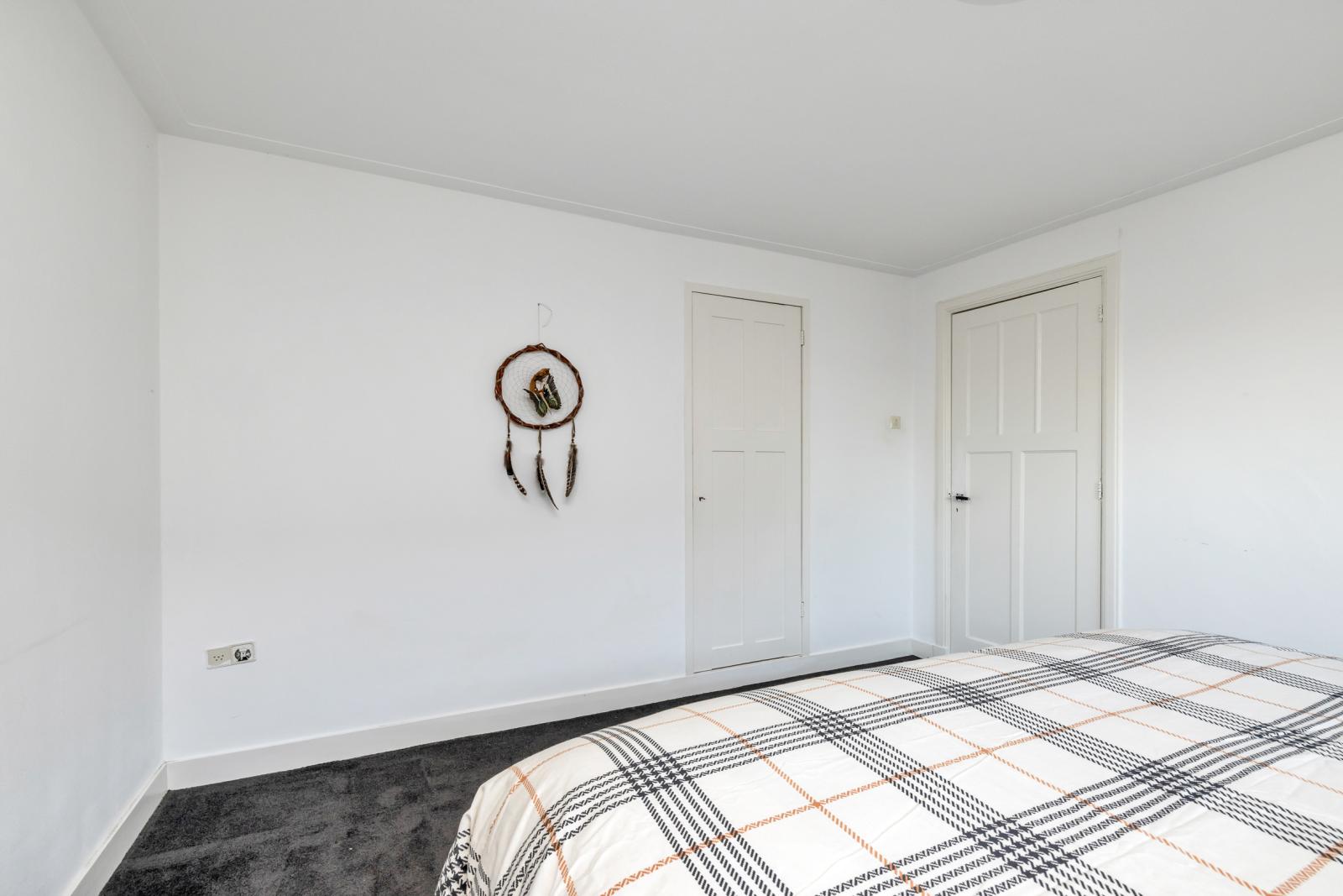 Via een vaste trap bereikt u de tweede verdieping. Op de overloop bevinden zich de opstelling voor wasmachine en droger en de cv ketel. De ruime slaapkamer is vergroot door een hoekdakkapel, wat zorgt voor extra licht en ruimte. Het bitumen van de dakkapel is recent vernieuwd. Daarnaast zijn er praktische knieschotten aanwezig voor extra bergruimte.