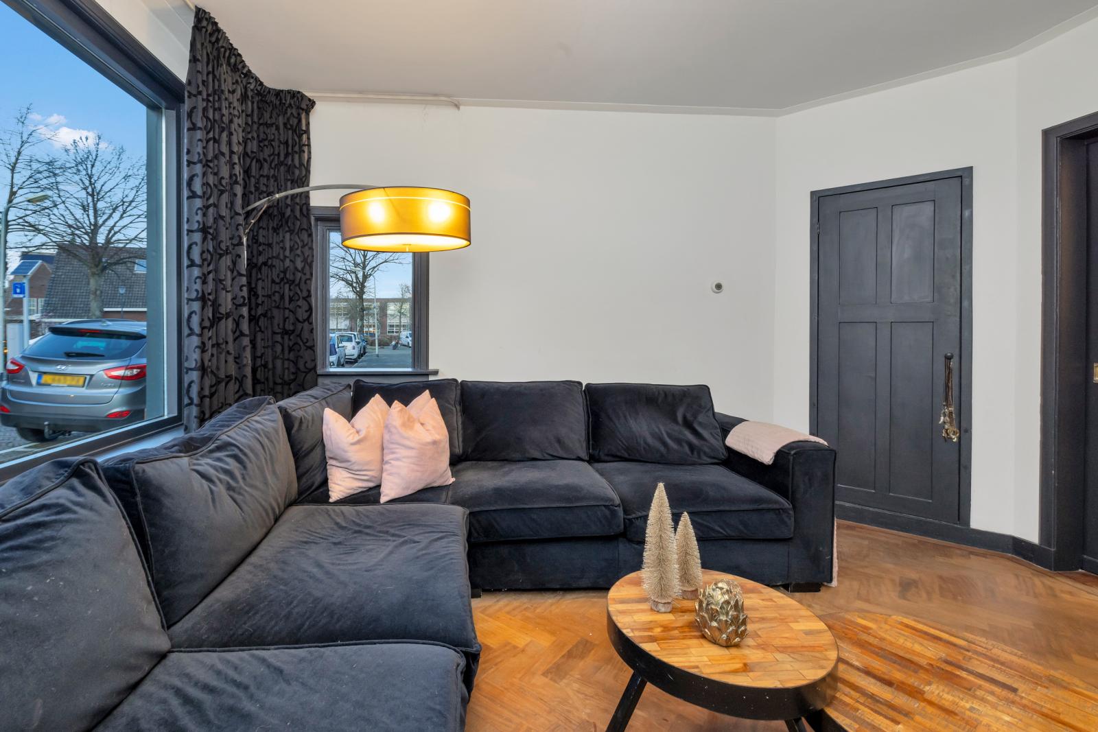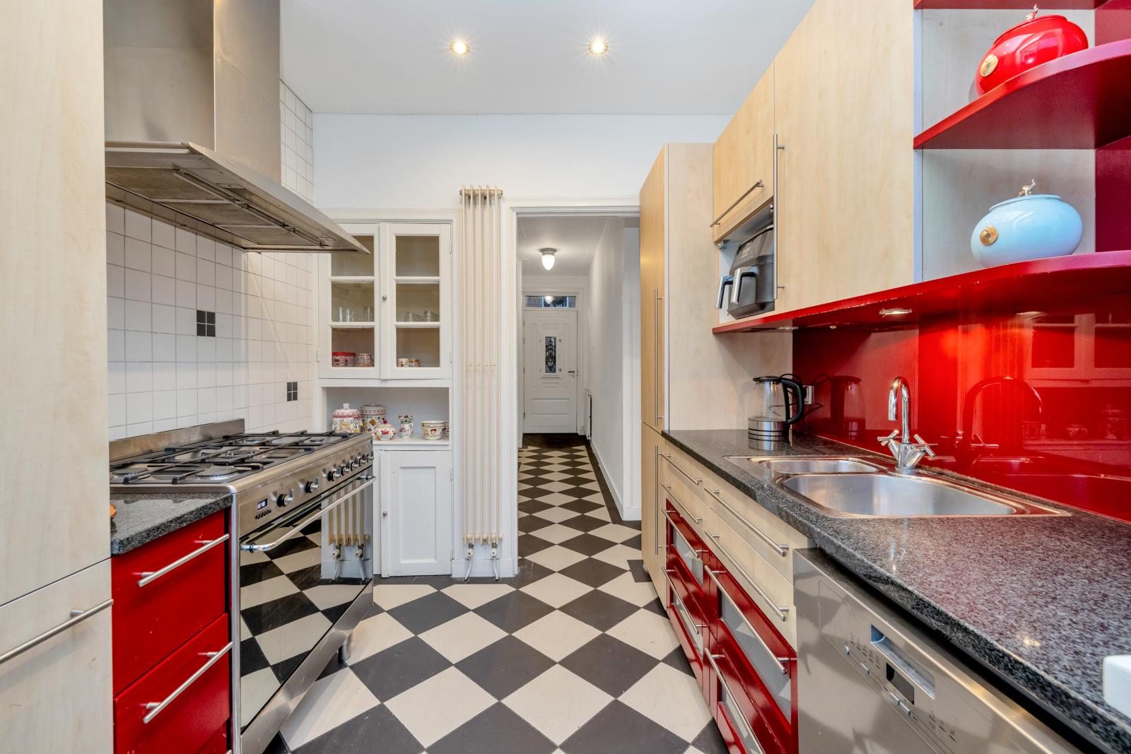 De woonkamer is voorzien van fraaie en suite deuren die zorgen voor een prettige verdeling tussen het zitgedeelte en de eetkamer. De houten visgraatvloer met bies versterkt het karakter van de woning en vormt een echte blikvanger. De keuken beschikt over een complete inbouwopstelling met onder andere een koel-vriescombinatie, een 6 pits gasfornuis met oven van SMEG, afzuigkap en vaatwasser.