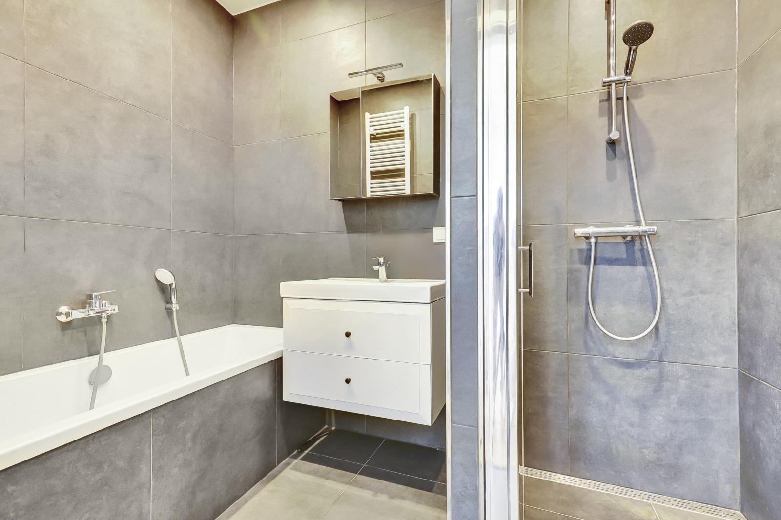 - Luxe badkamer met ruime inloopdouche, ligbad, stijlvol wastafelmeubel met spiegelkast en designradiator.